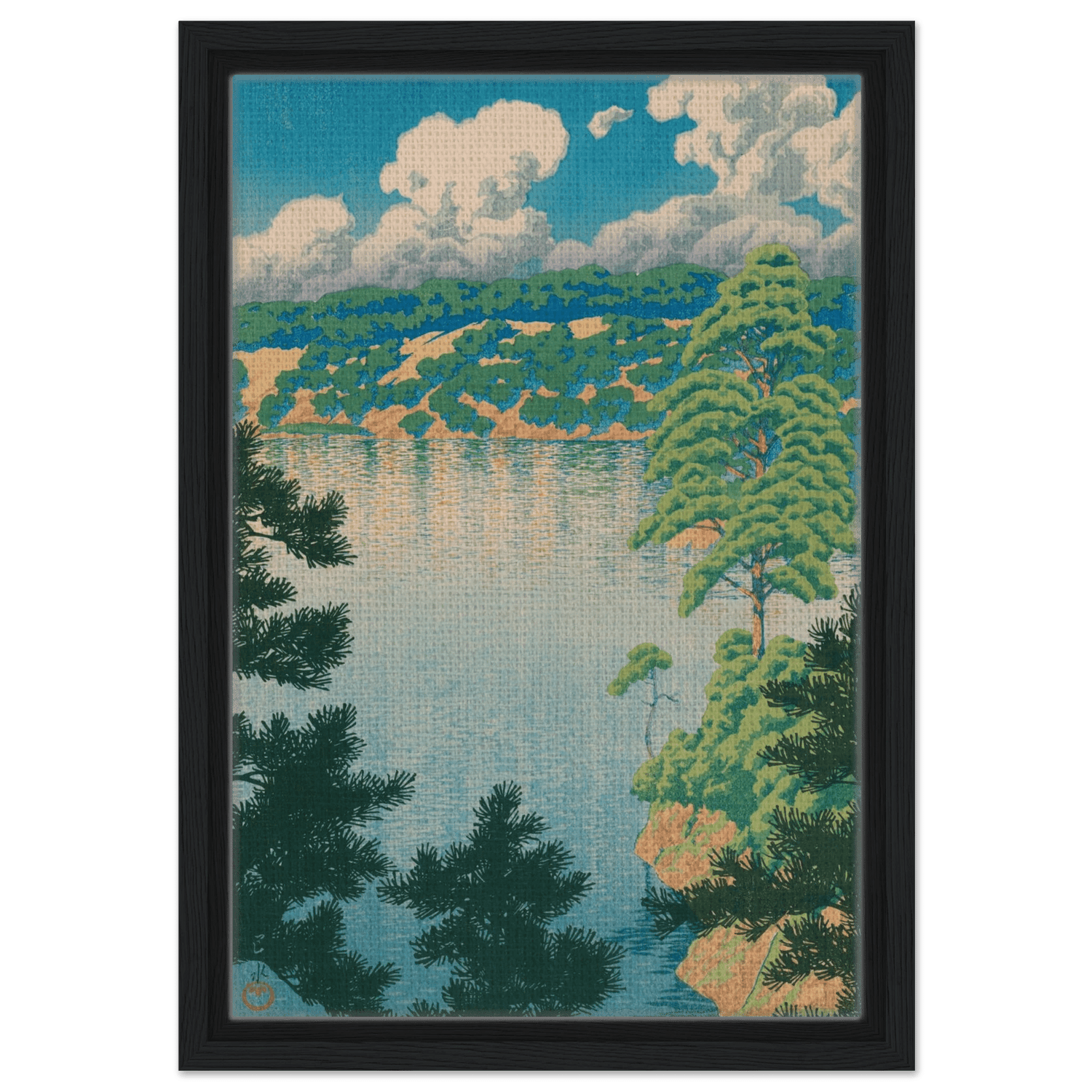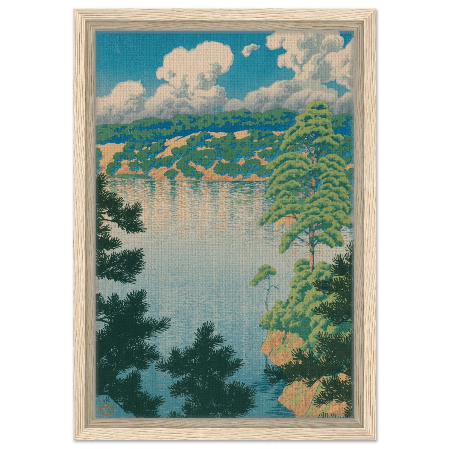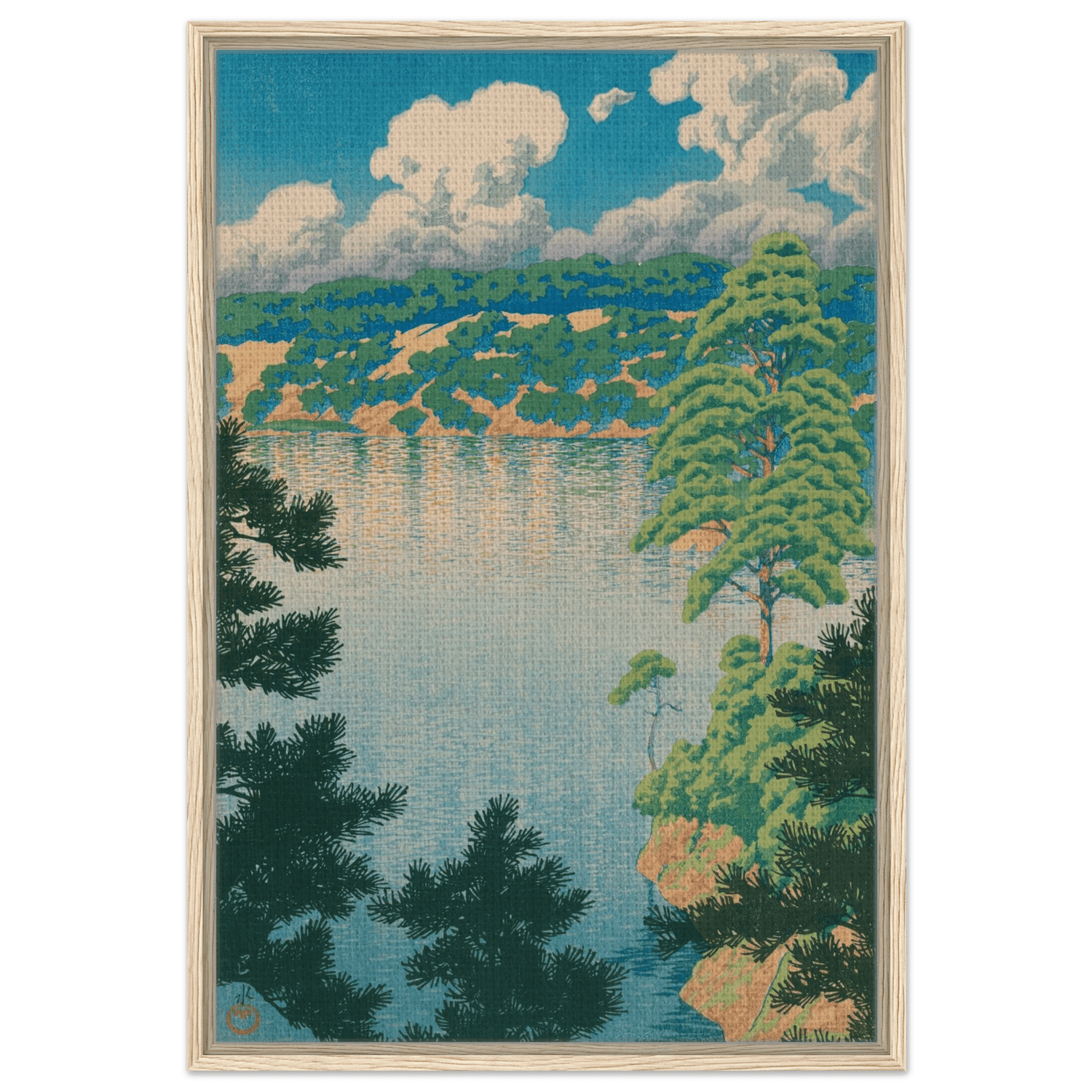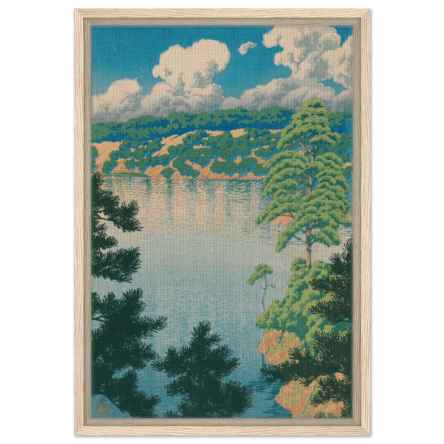 Über dem stillen Wasser des Karasu-Sumpfes breiten sich mächtige Wolken aus, deren Formen im hellen Sommerlicht leuchten. Das Grün der Kiefern spiegelt sich in sanften Wellen, während die Luft erfüllt scheint von Wärme und Weite. Kawase Hasui zeigt hier die Schönheit der nordjapanischen Landschaft in ihrer klarsten Form – ein Augenblick reiner Natur, unberührt und friedvoll.