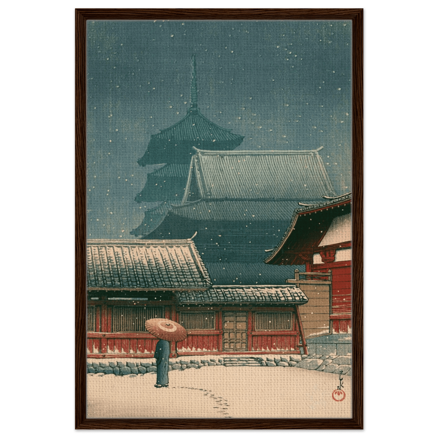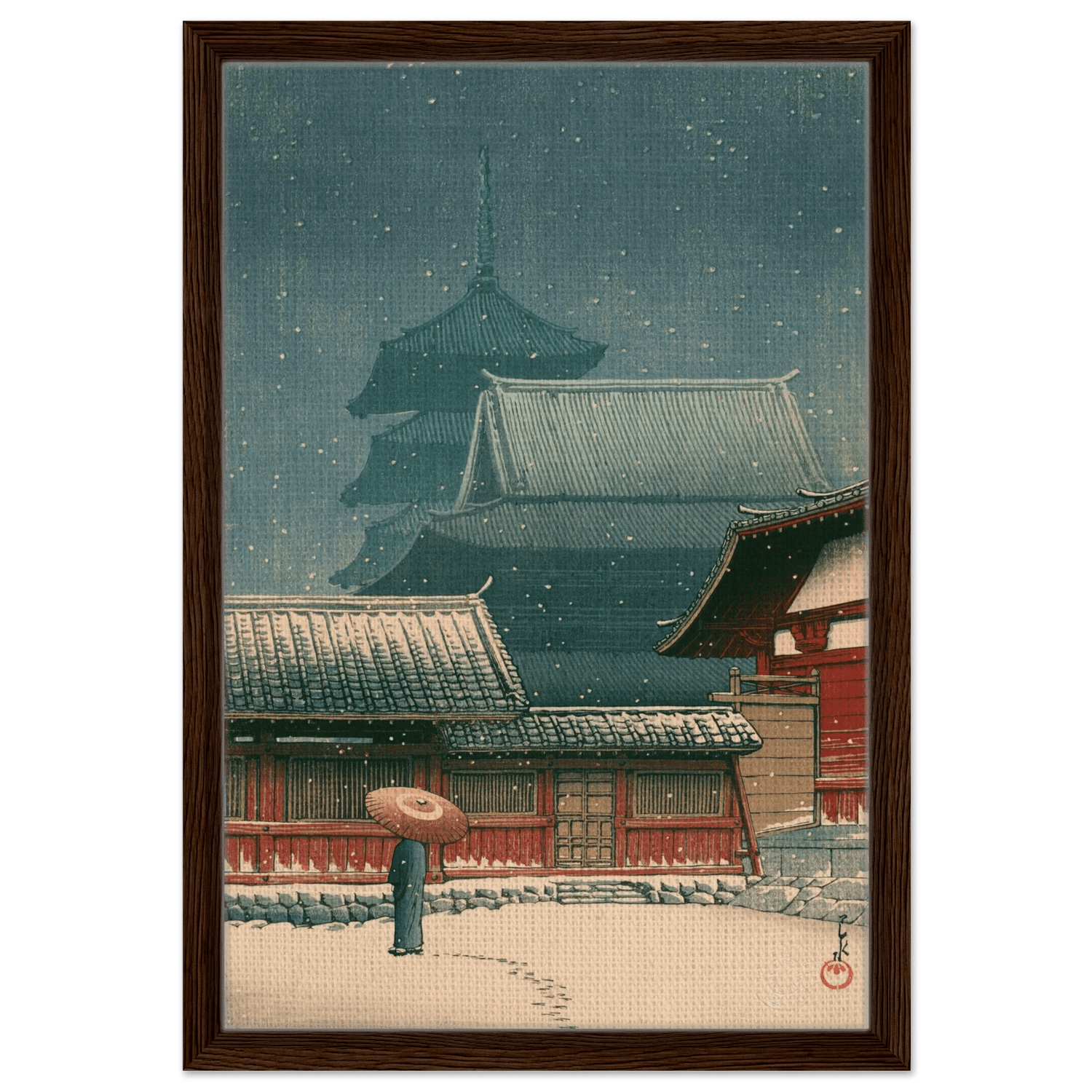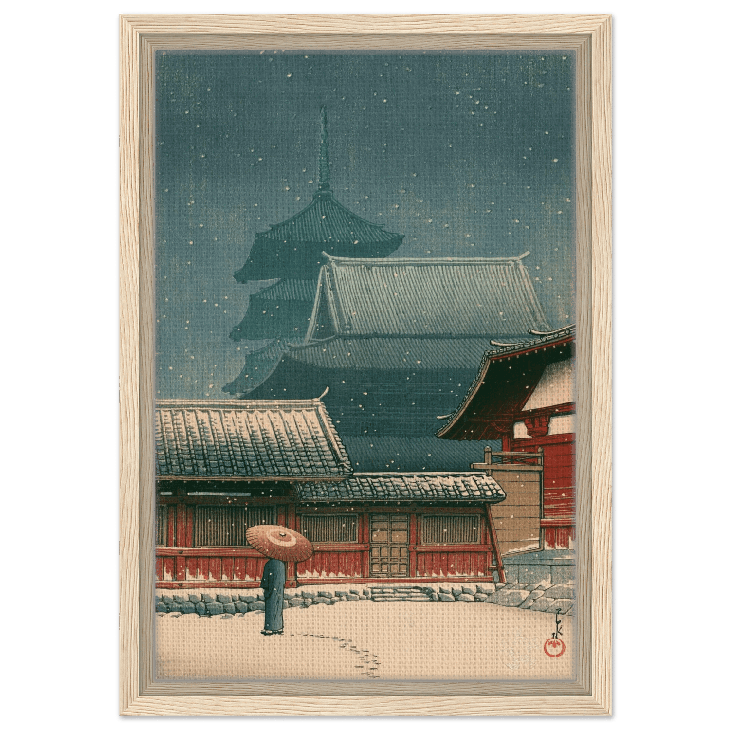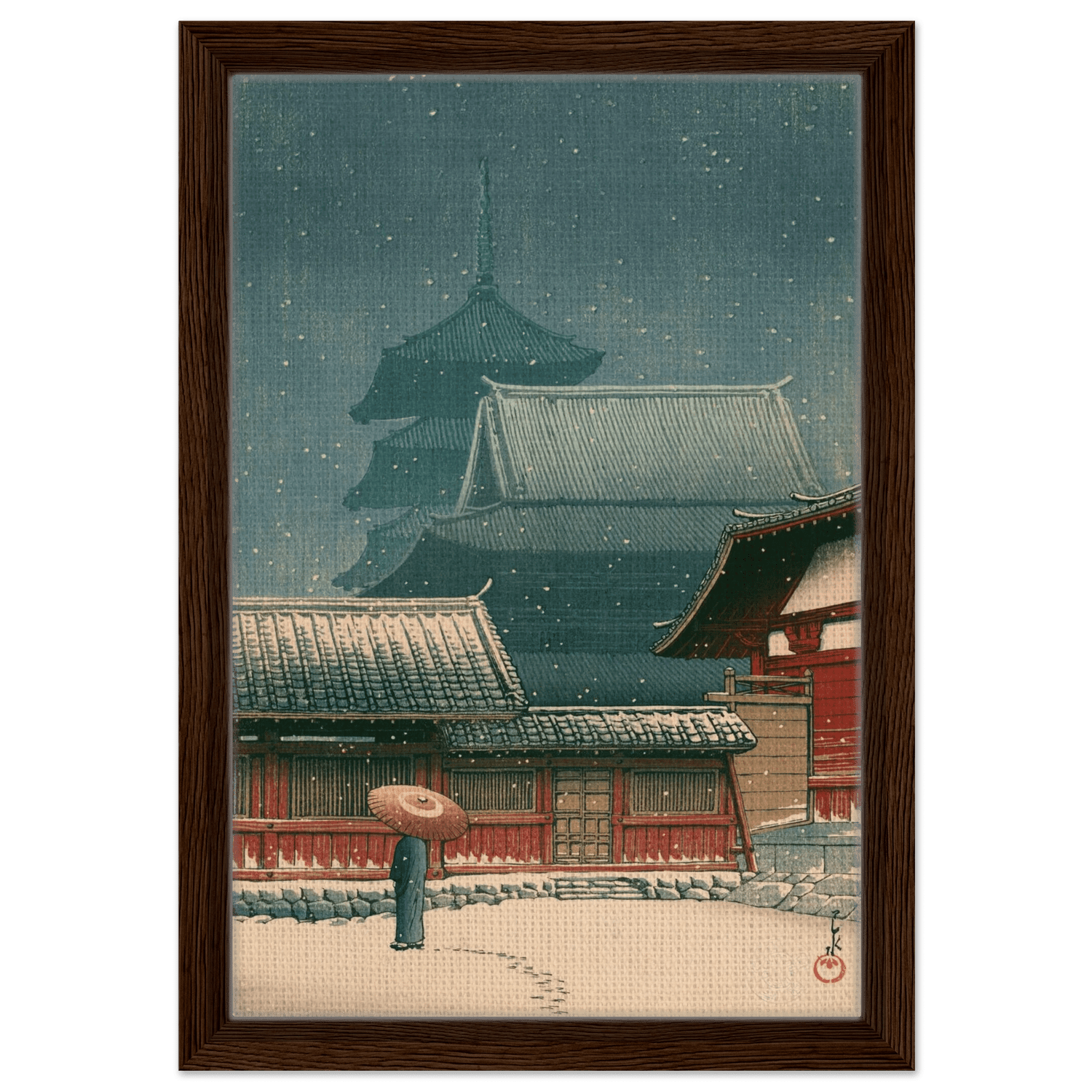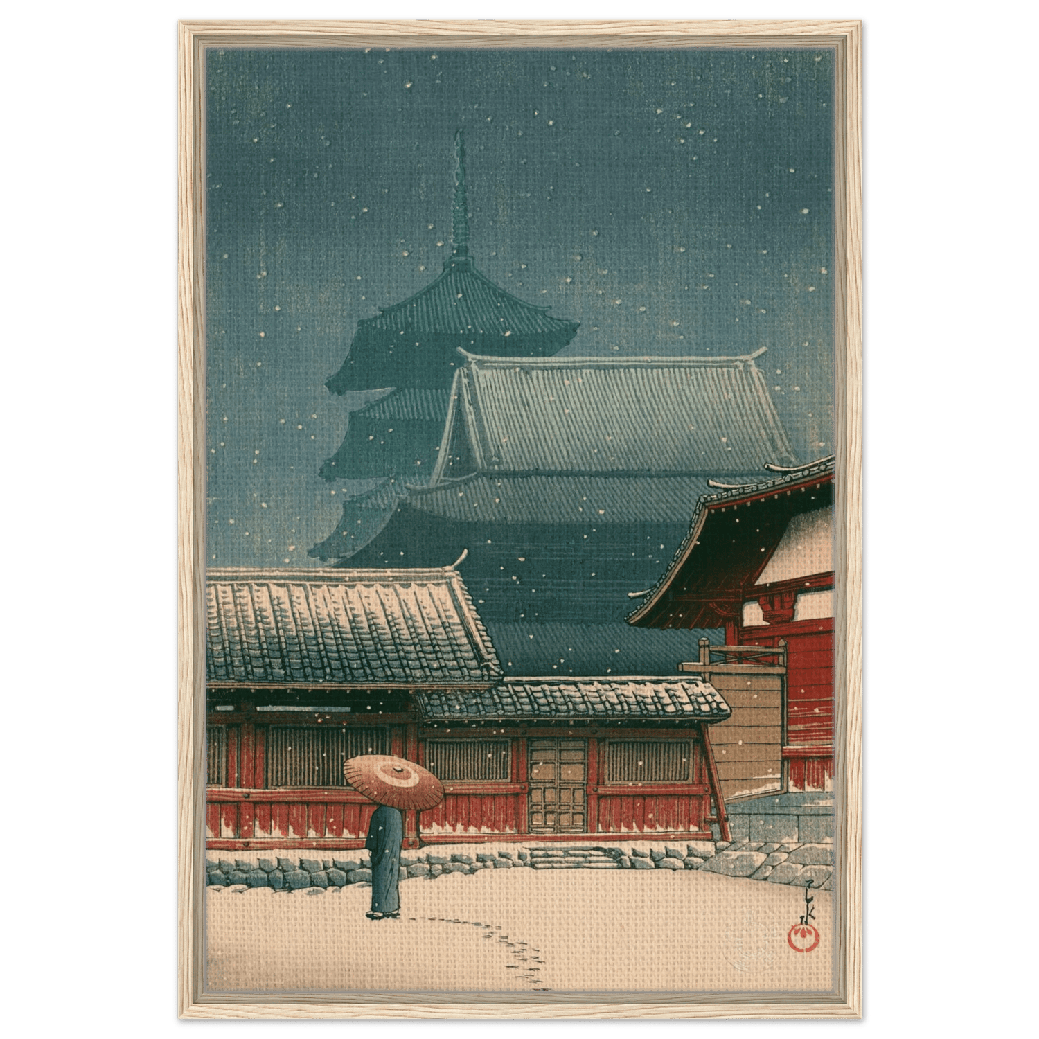 Motiv: Pagode und Tempelgebäude im Schnee, mit einer Figur unter einem Schirm