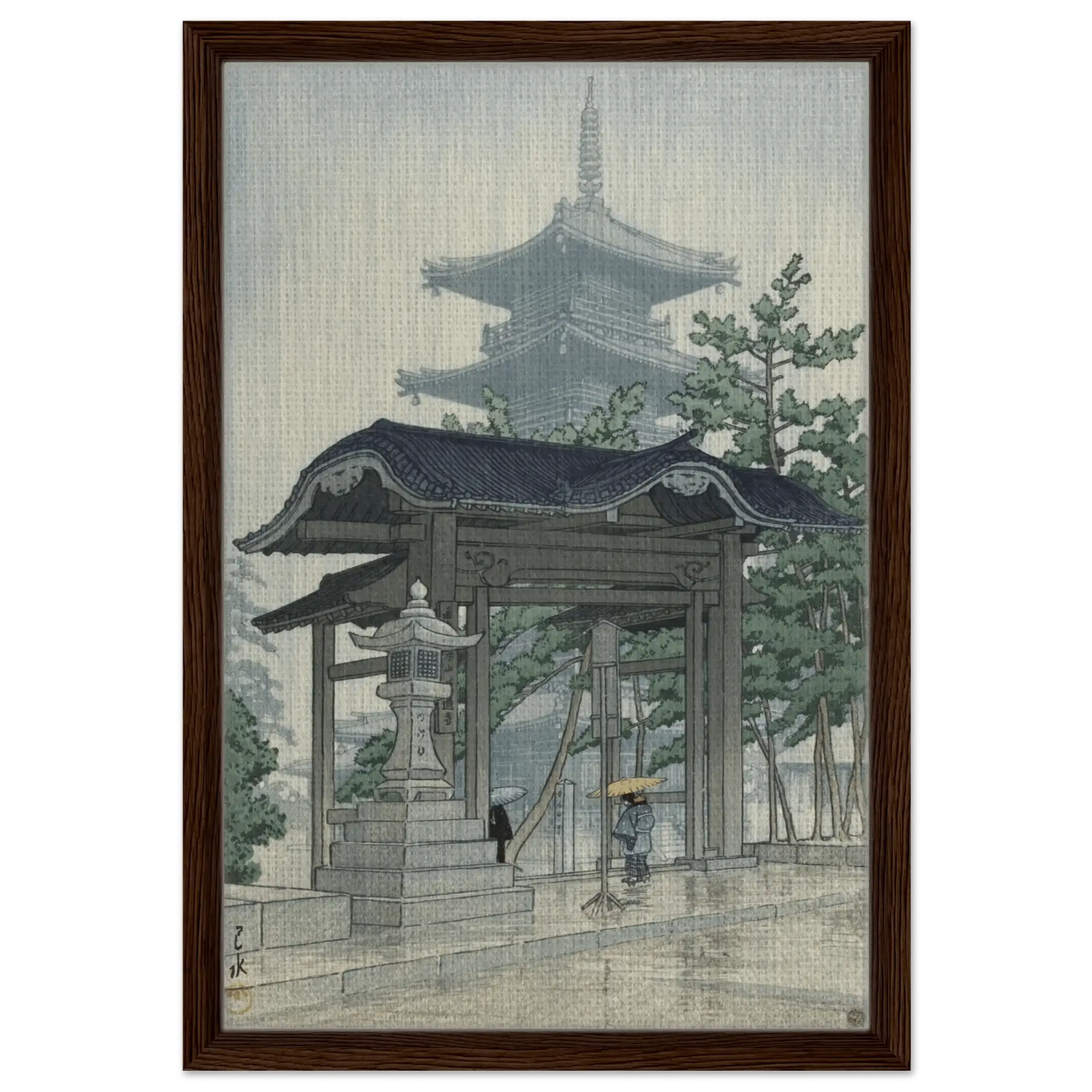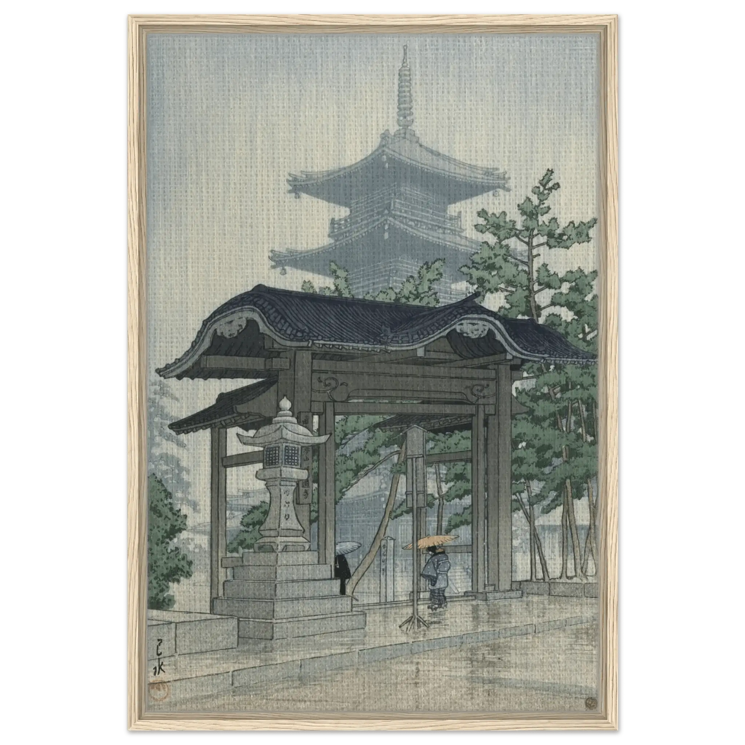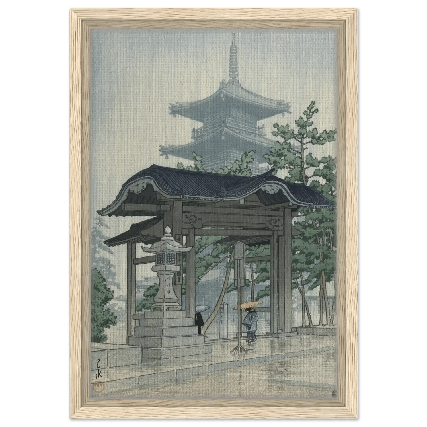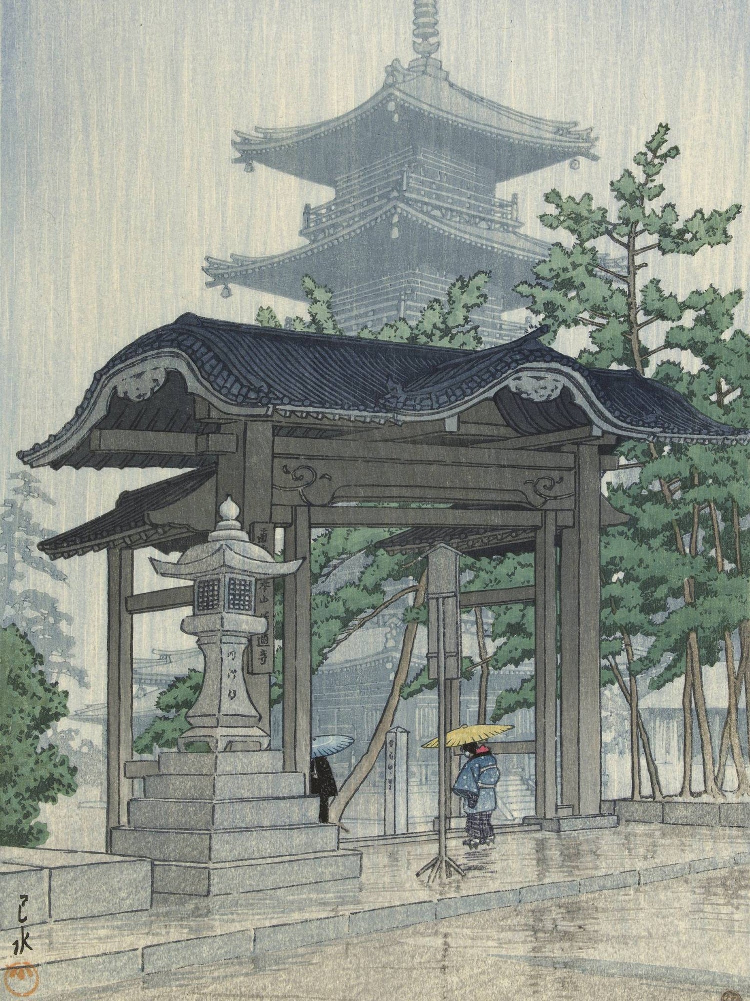 Feiner Regen fällt in stillen Bahnen und lässt die Steinpfade glänzen, während die Silhouette einer Pagode im Dunst verblasst. Eine einzelne Gestalt unter einem gelben Schirm schreitet durch das Tempeltor – ein Moment flüchtiger Schönheit, eingefangen mit leiser Melancholie. Kawase Hasui verwandelt die Szenerie in eine Meditation aus Licht, Wasser und Erinnerung, in der der Regen selbst zur Stimme der Stille wird.