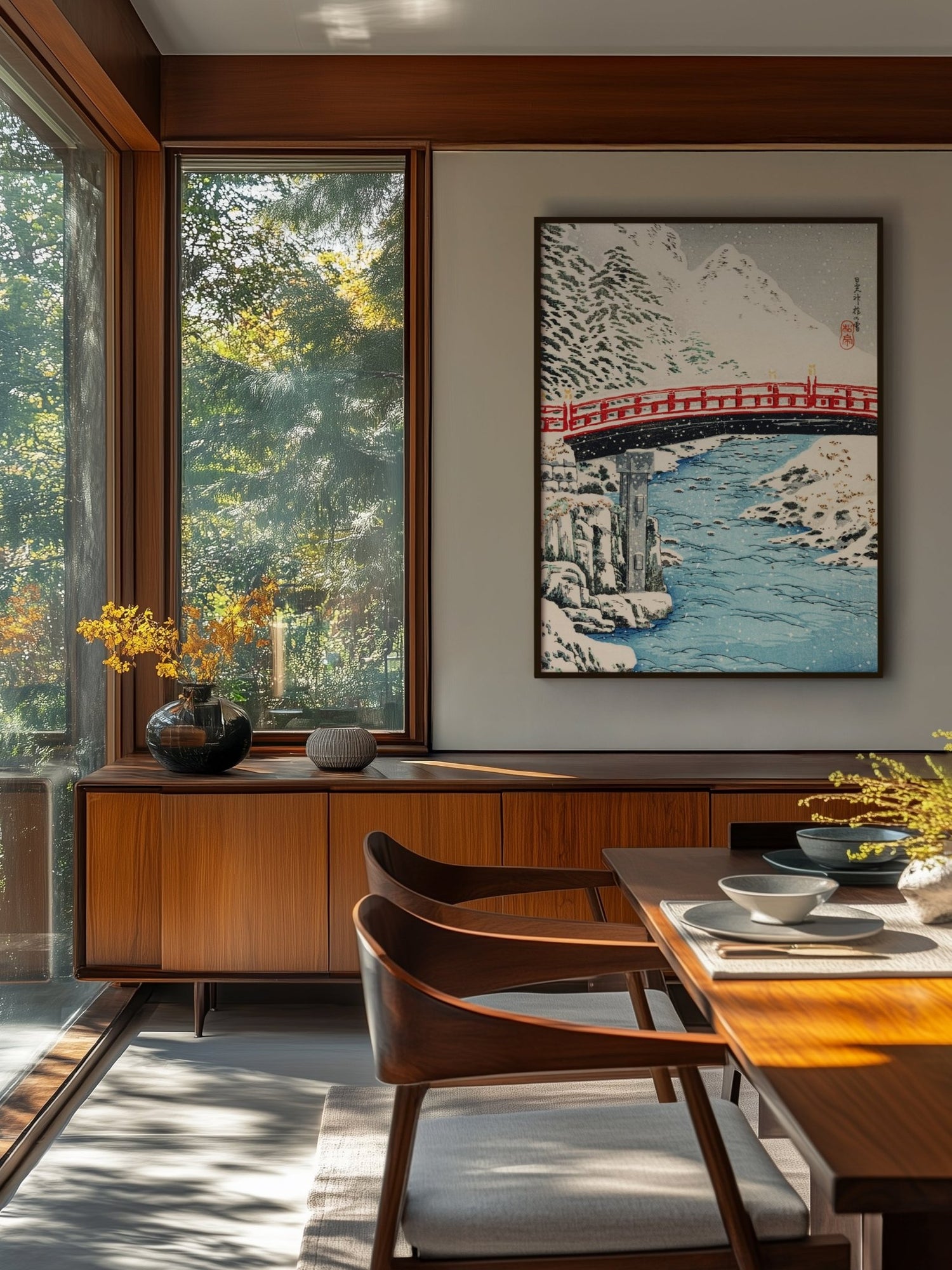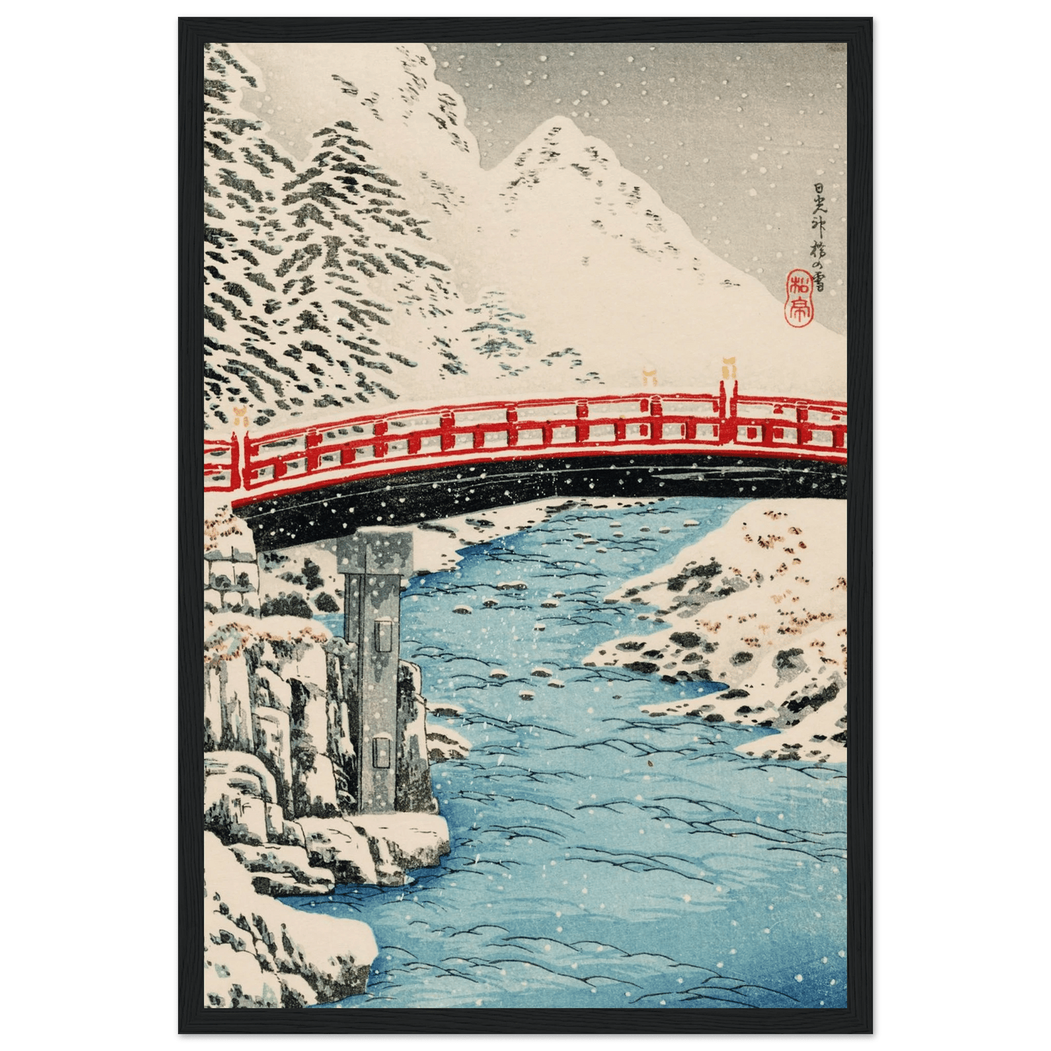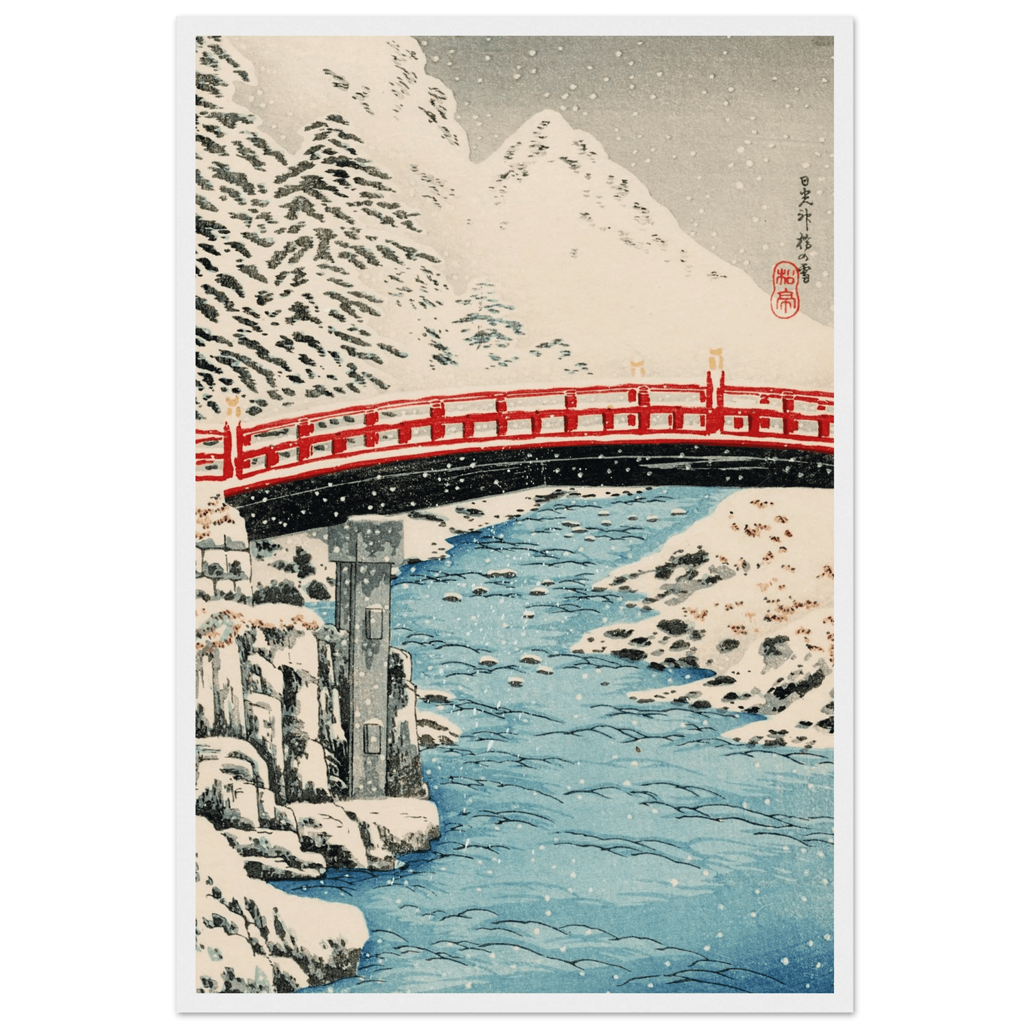 Der Schnee legt sich lautlos über Landschaft und Wasser, während die rote Brücke wie ein ruhiger Akzent inmitten der winterlichen Stille erscheint. Der klare Fluss spiegelt das fahle Licht eines kalten Tages, und die verschneiten Hänge dahinter wirken wie in eine ferne, fast mythische Welt entrückt. Takahashi Shōtei erfasst mit feiner Linienführung und sanften Farbabstufungen die stille Erhabenheit eines heiligen Ortes, an dem Natur und Architektur in vollkommener Harmonie ruhen.