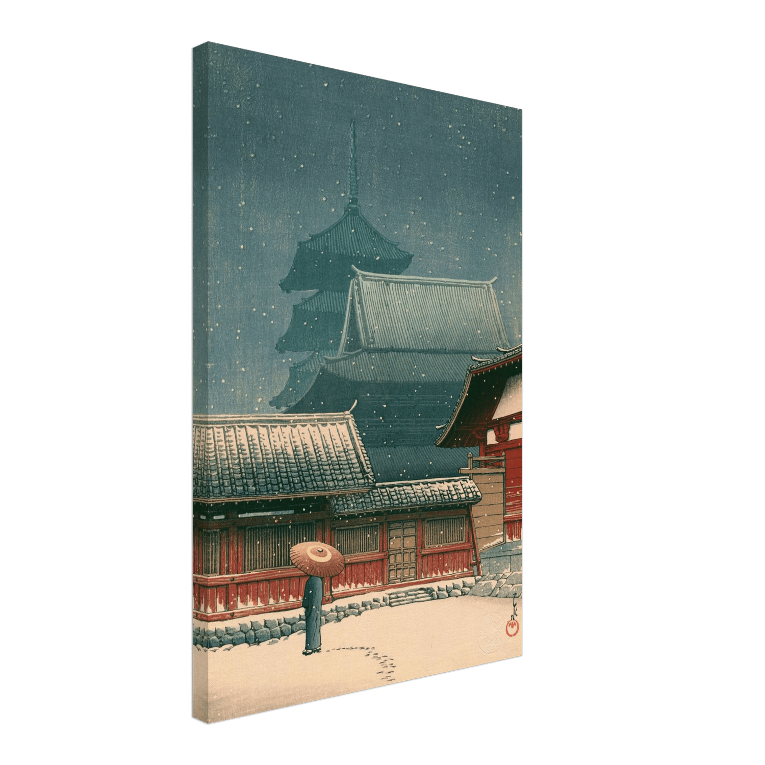 Motiv: Pagode und Tempelgebäude im Schnee, mit einer Figur unter einem Schirm