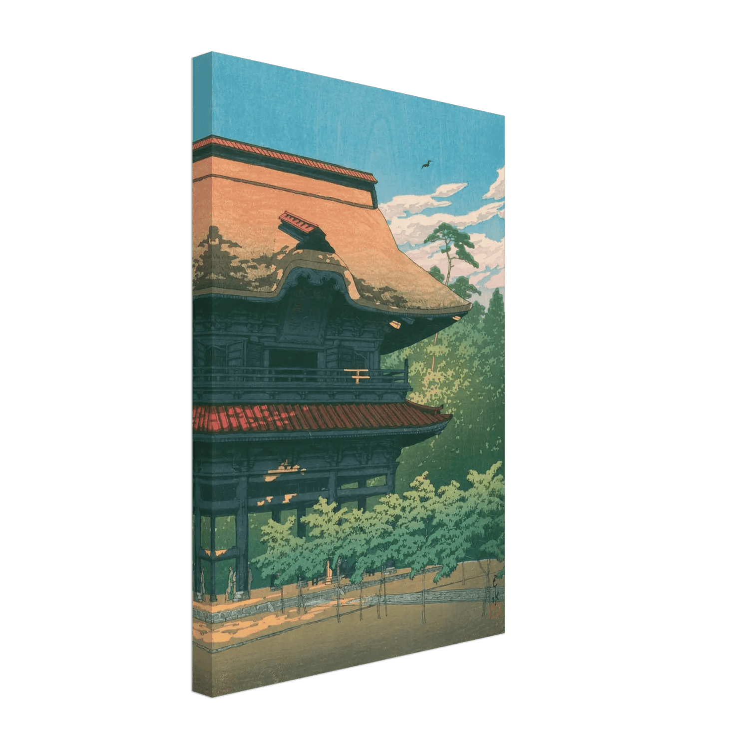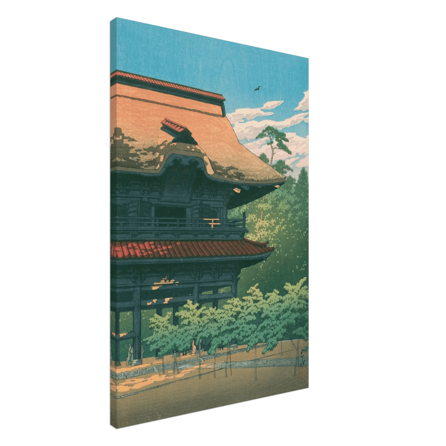 Das warme Licht des Nachmittags streift das Dach des Kenchō-ji-Tempels, dessen mächtige Holzstruktur still im Grün der Zedern ruht. Über den Bäumen zieht ein Vogel seine Bahn, als würde er die Zeit selbst begleiten. Kawase Hasui fängt hier den friedvollen Atem der Sommerluft ein – eine stille Hommage an die spiritische Gelassenheit der Zen-Tempel von Kamakura.