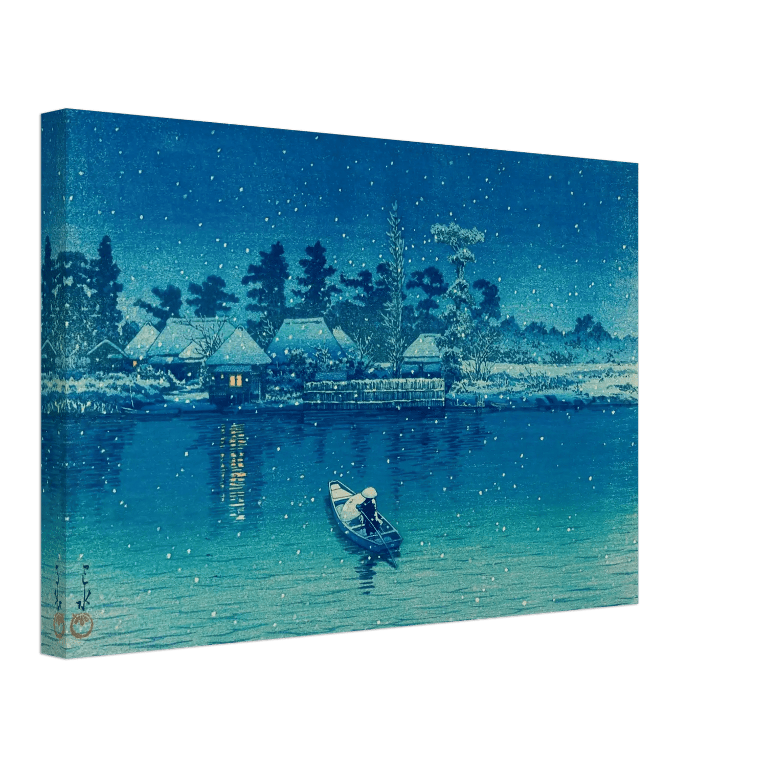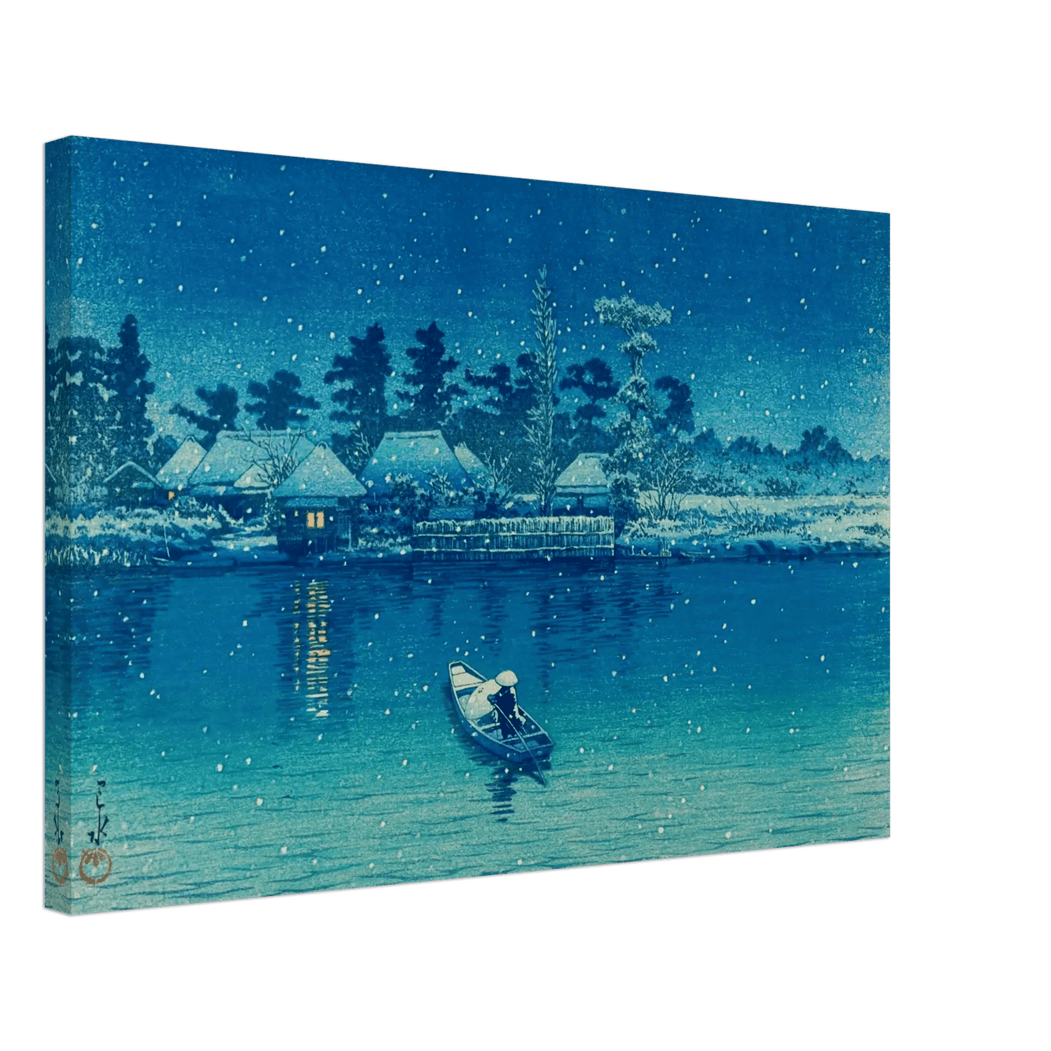 Leise fällt der Schnee auf das stille Wasser von Ushibori. Ein einsamer Ruderer gleitet durch die winterliche Nacht, während das Licht der Häuser am Ufer wie kleine Sterne im Dunkel glimmt. Kawase Hasui verwandelt diese Szenerie in ein stilles Gedicht aus Blau und Weiß – ein Moment voll Frieden, Einsamkeit und zeitloser Schönheit.
