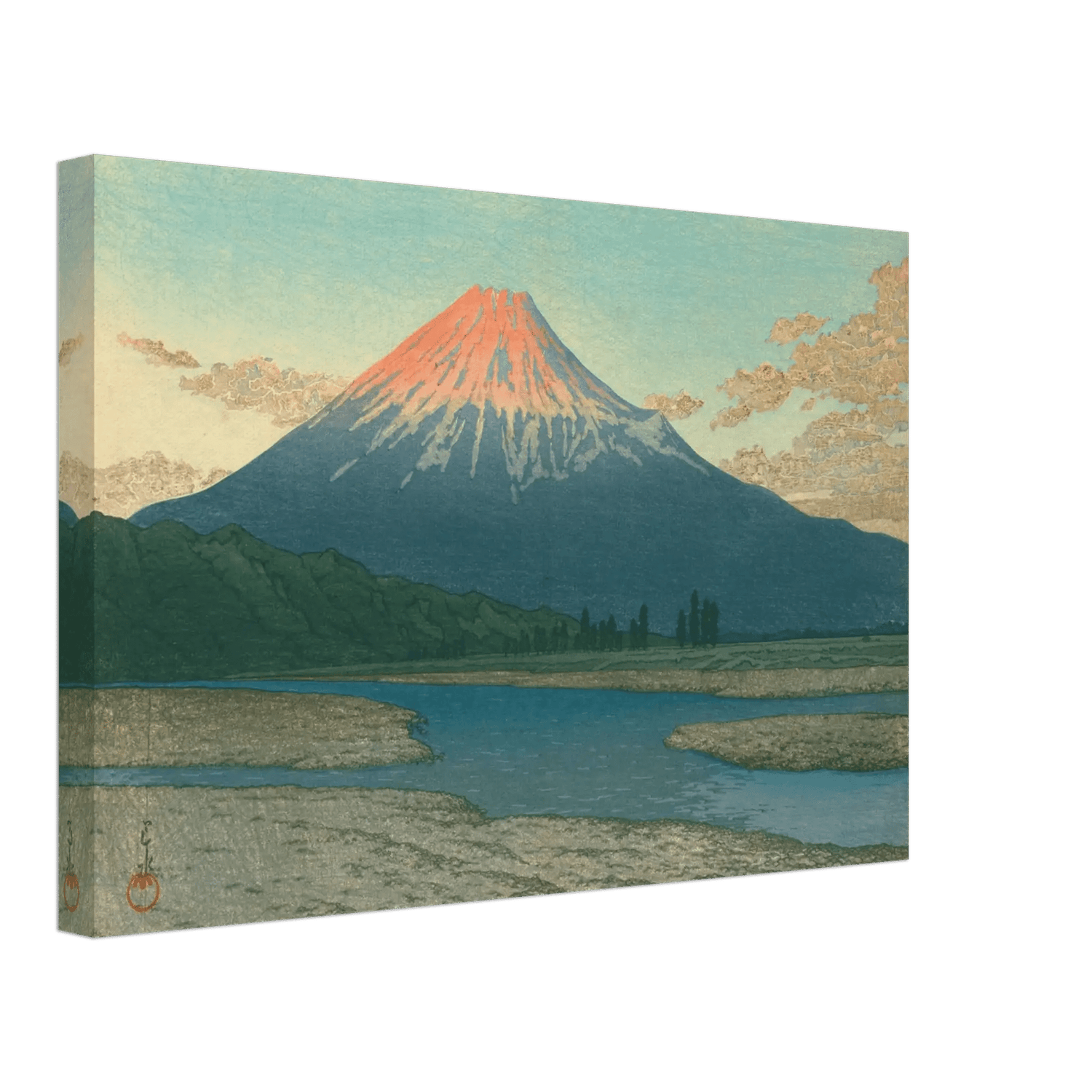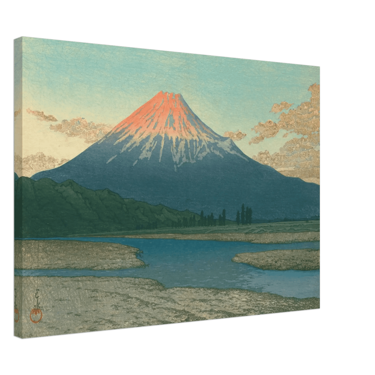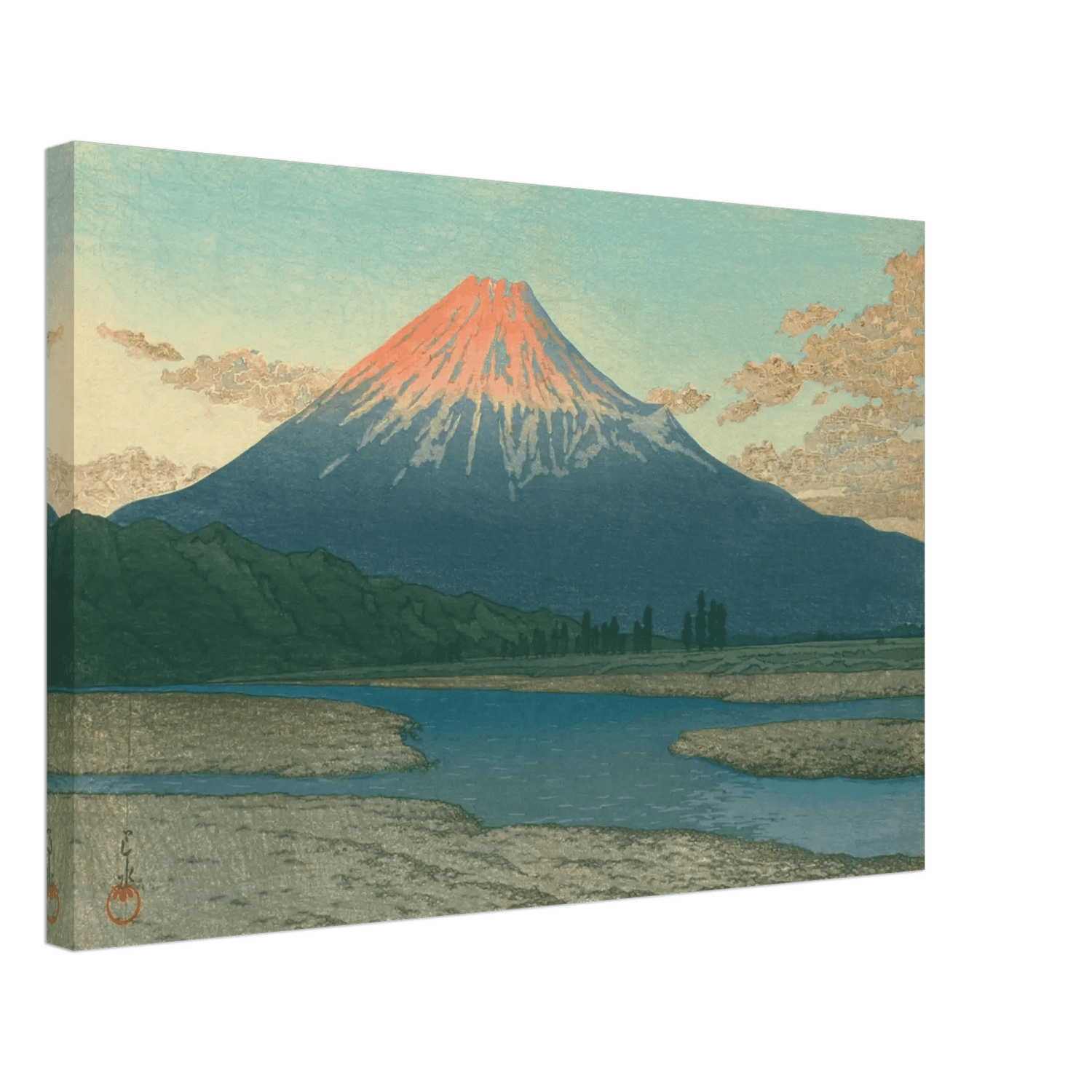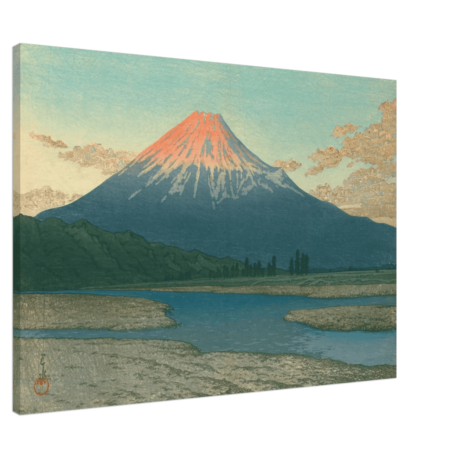 Im Licht der aufgehenden Sonne erglüht der Fuji in leuchtendem Rot, während der Himmel in zartem Blau verblasst. Der Fluss im Vordergrund spiegelt das Licht des Morgens und führt den Blick in die Weite der Landschaft. Kawase Hasui verwandelt diesen Anblick in ein Symbol stiller Erhabenheit – die Begegnung von Licht, Natur und zeitloser Schönheit.
