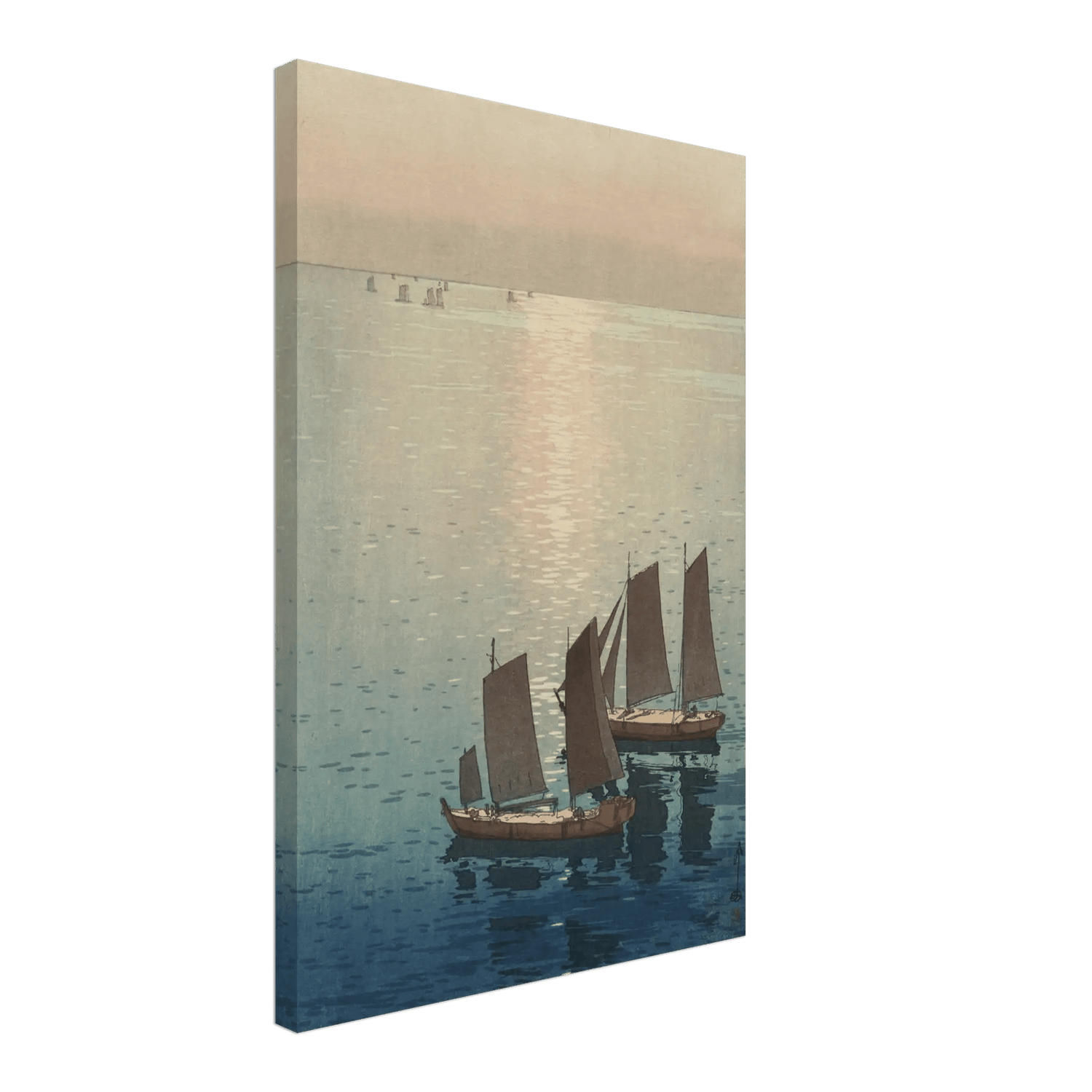 Ein sanftes Licht breitet sich über die ruhige Wasserfläche aus, wo die letzten Sonnenstrahlen das Meer in schimmerndes Gold tauchen. Die Segelboote gleiten still über das spiegelnde Wasser, als wären sie Teil eines endlosen Traums zwischen Himmel und Meer. In dieser Komposition fängt Hiroshi Yoshida den Moment ein, in dem Bewegung und Stille ineinander übergehen – eine Meditation über Licht, Zeit und Vergänglichkeit.