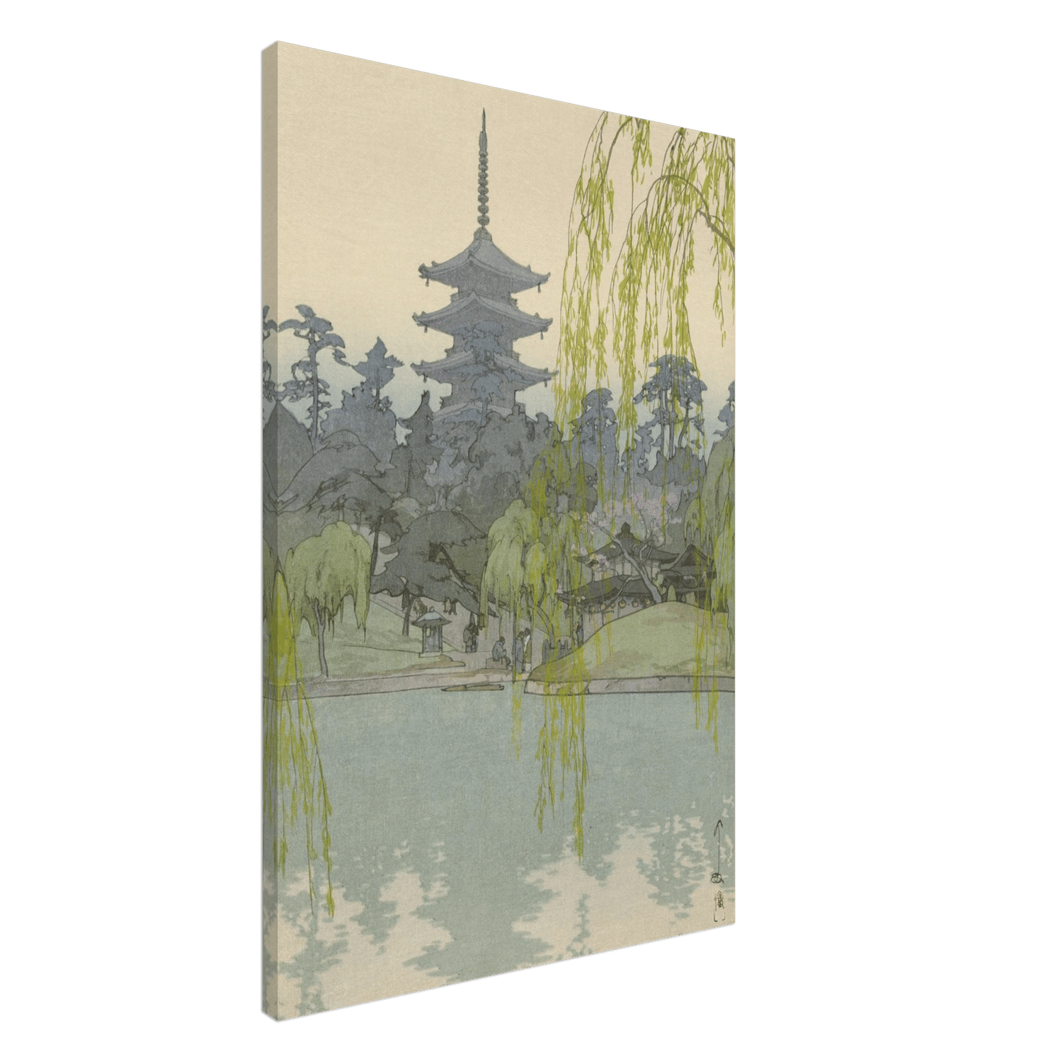 Zarte Weidenzweige neigen sich über das stille Wasser, das die Pagode in weichem Licht spiegelt. In dieser friedvollen Komposition verbindet Hiroshi Yoshida Natur, Architektur und Mensch zu einer harmonischen Einheit. Das Werk strahlt jene leise Melancholie aus, die im Frühling von Nara über den Sarusawa-Teich zieht – ein Ort, an dem Vergangenheit und Gegenwart still ineinander übergehen.