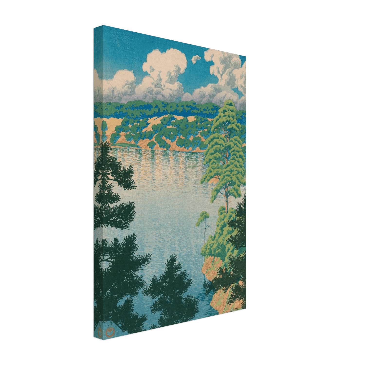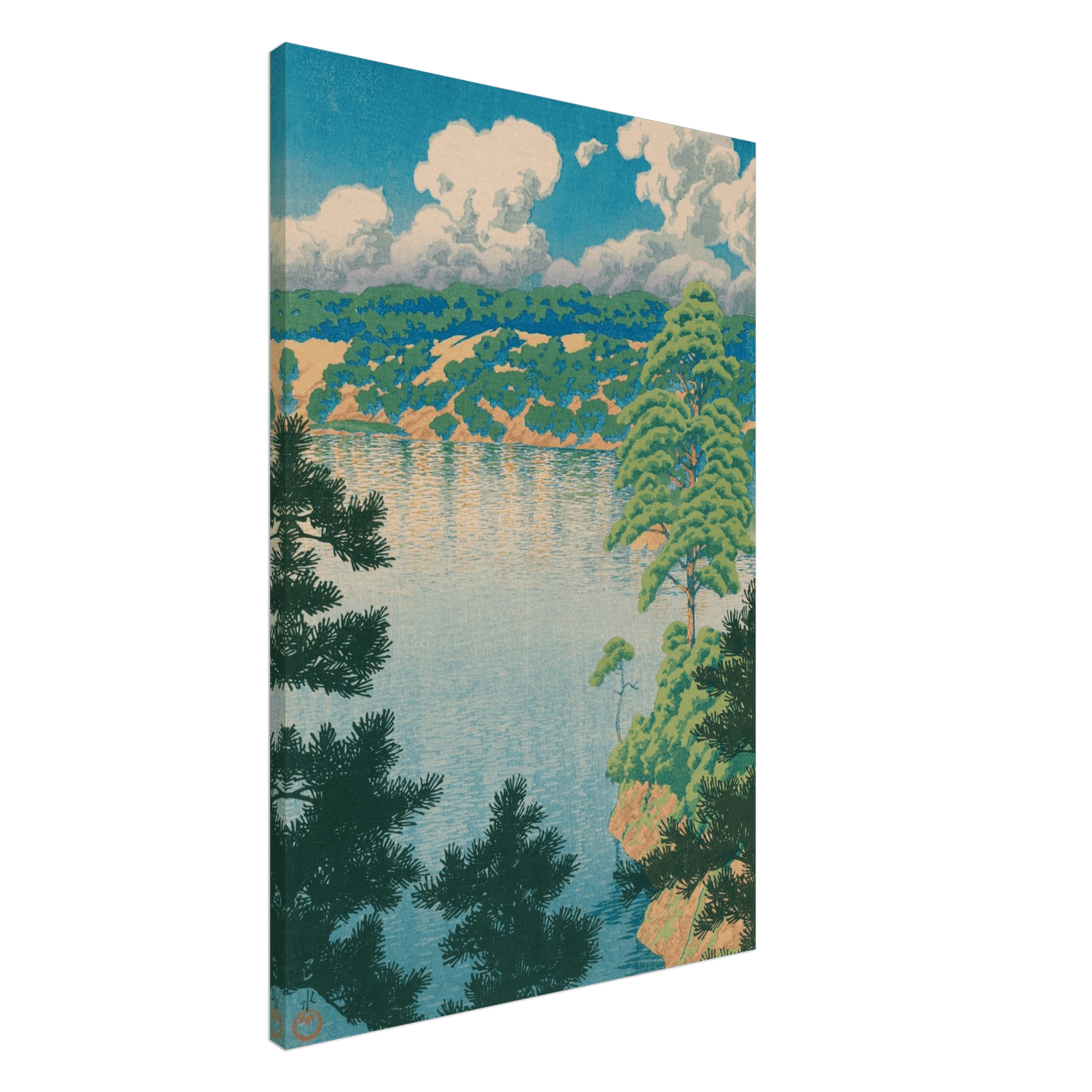 Über dem stillen Wasser des Karasu-Sumpfes breiten sich mächtige Wolken aus, deren Formen im hellen Sommerlicht leuchten. Das Grün der Kiefern spiegelt sich in sanften Wellen, während die Luft erfüllt scheint von Wärme und Weite. Kawase Hasui zeigt hier die Schönheit der nordjapanischen Landschaft in ihrer klarsten Form – ein Augenblick reiner Natur, unberührt und friedvoll.