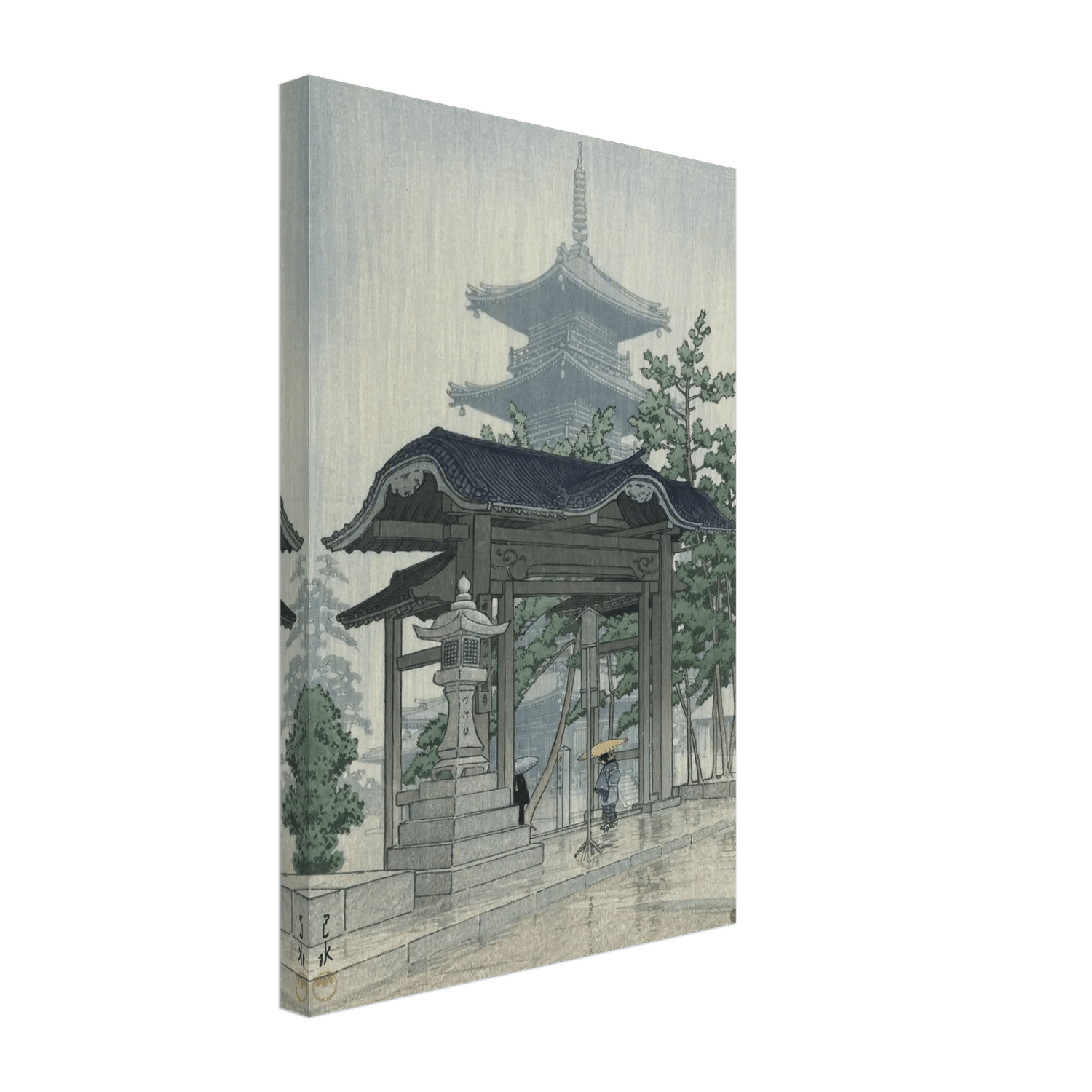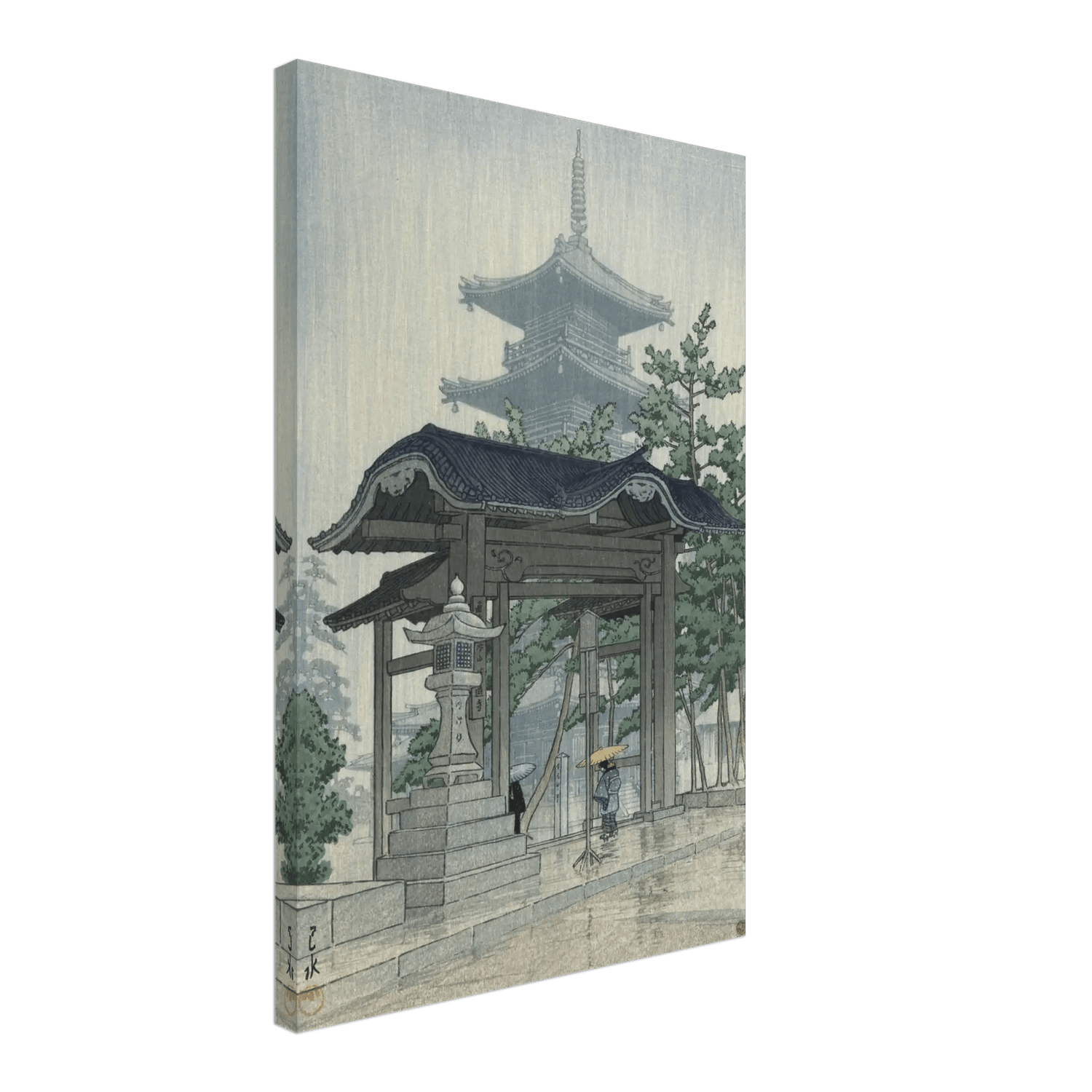 Feiner Regen fällt in stillen Bahnen und lässt die Steinpfade glänzen, während die Silhouette einer Pagode im Dunst verblasst. Eine einzelne Gestalt unter einem gelben Schirm schreitet durch das Tempeltor – ein Moment flüchtiger Schönheit, eingefangen mit leiser Melancholie. Kawase Hasui verwandelt die Szenerie in eine Meditation aus Licht, Wasser und Erinnerung, in der der Regen selbst zur Stimme der Stille wird.