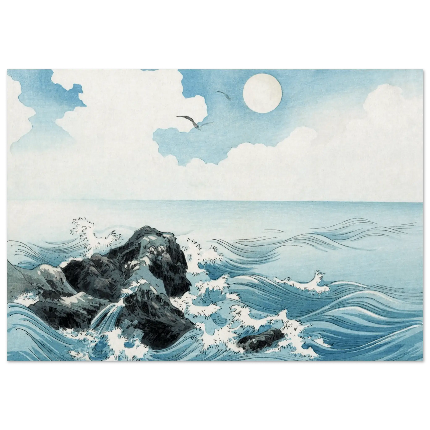 Unter einem hellen Himmel brechen die Wellen sanft an den Felsen von Kojima. Das Licht der Sonne glitzert auf dem Wasser, während Möwen ruhig über das Meer gleiten. Die Linien des Wassers wirken lebendig und zugleich geordnet – ein Sinnbild japanischer Balance zwischen Bewegung und Stille.
