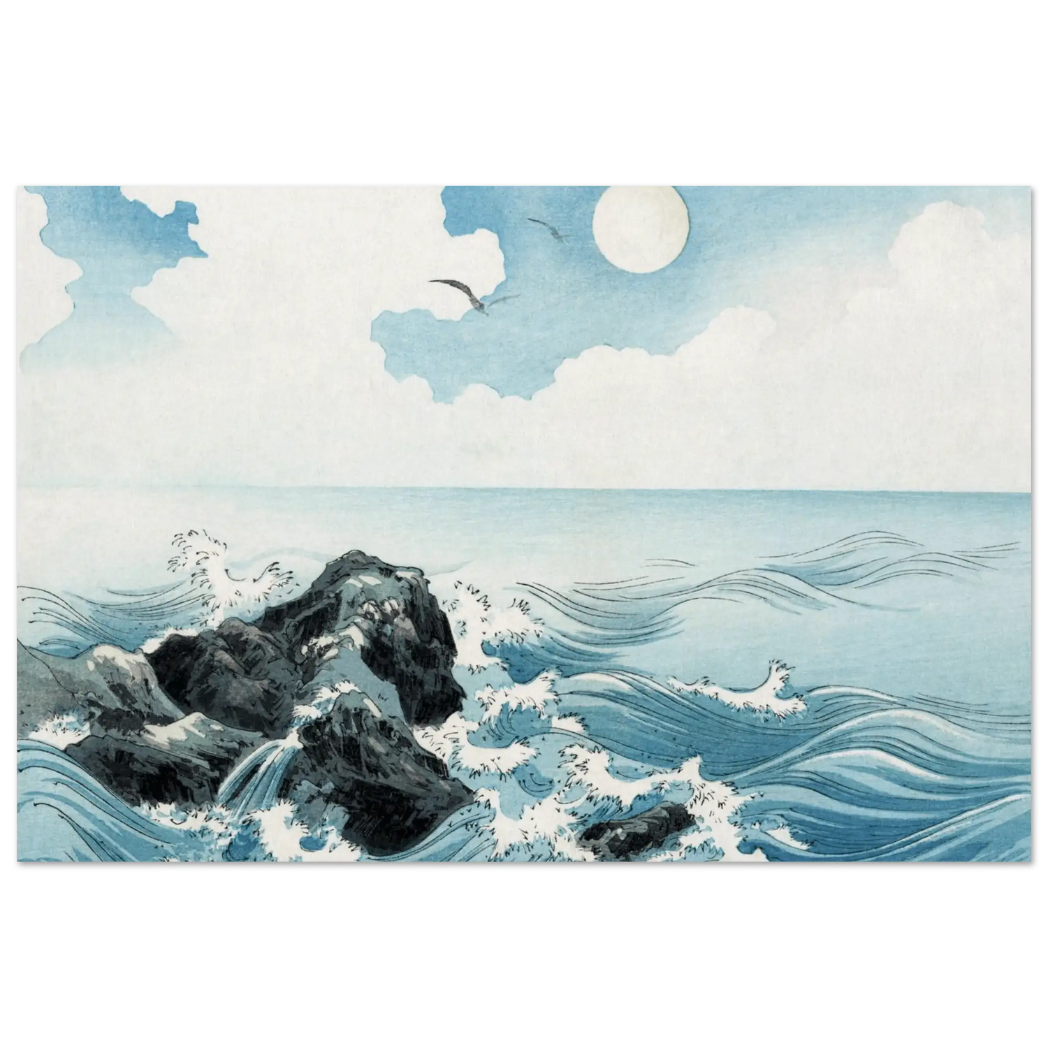 Dieses Werk aus der späten Edo- oder frühen Meiji-Zeit zeigt die für japanische Holzschnitte typische Verbindung von Naturbeobachtung und poetischer Vereinfachung. Die geschwungenen Wellen und das reine Blau fangen die Essenz des Meeres ein – nicht als Ort der Unruhe, sondern der ewigen Wiederkehr.