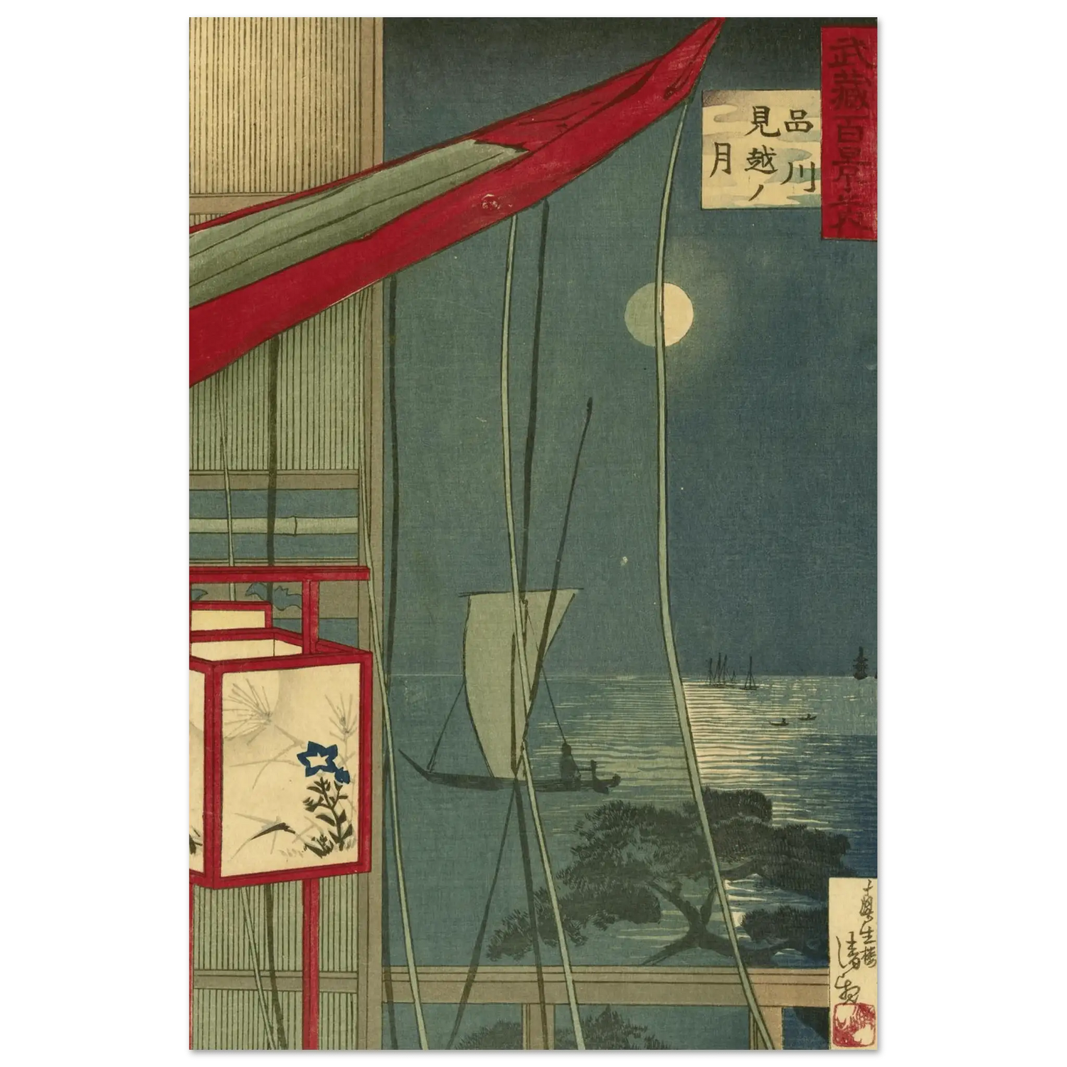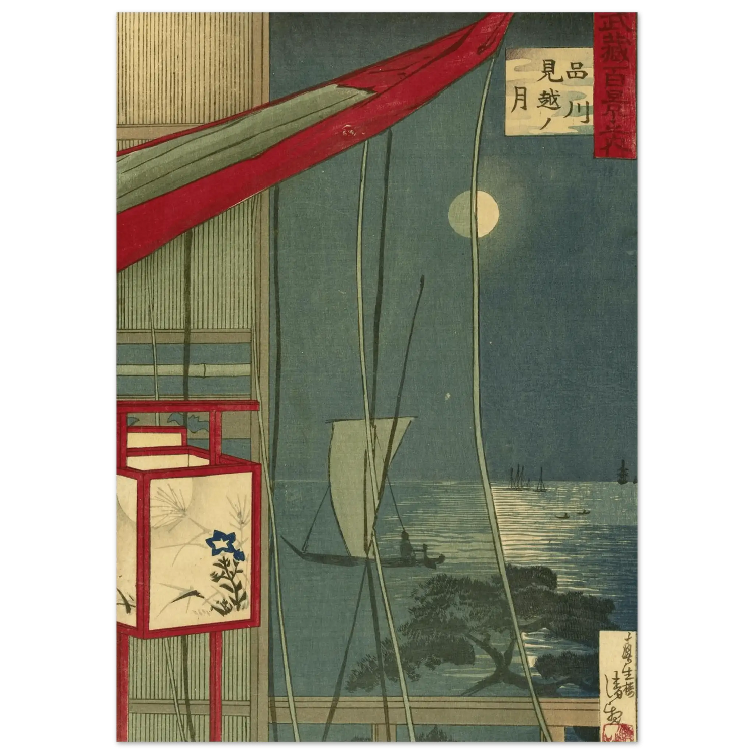 Ein stiller Sommerabend über der Bucht von Edo: Vom Balkon eines Hauses fällt der Blick auf das silbern schimmernde Meer, auf dem Segelboote lautlos über das Wasser gleiten. Die aufgehende Laterne im Vordergrund mit ihrer feinen Blumenmalerei kontrastiert sanft mit dem hellen Mondlicht, das den Himmel in tiefes Blau taucht.