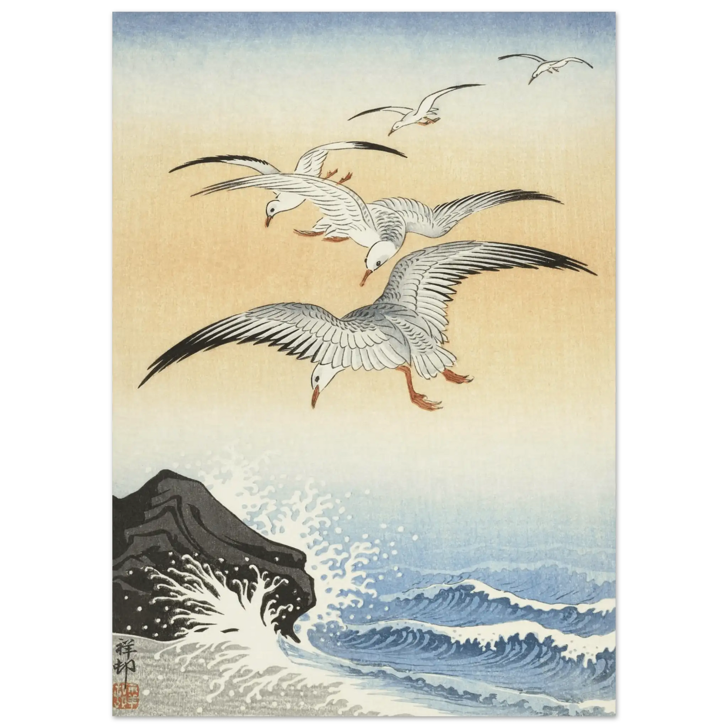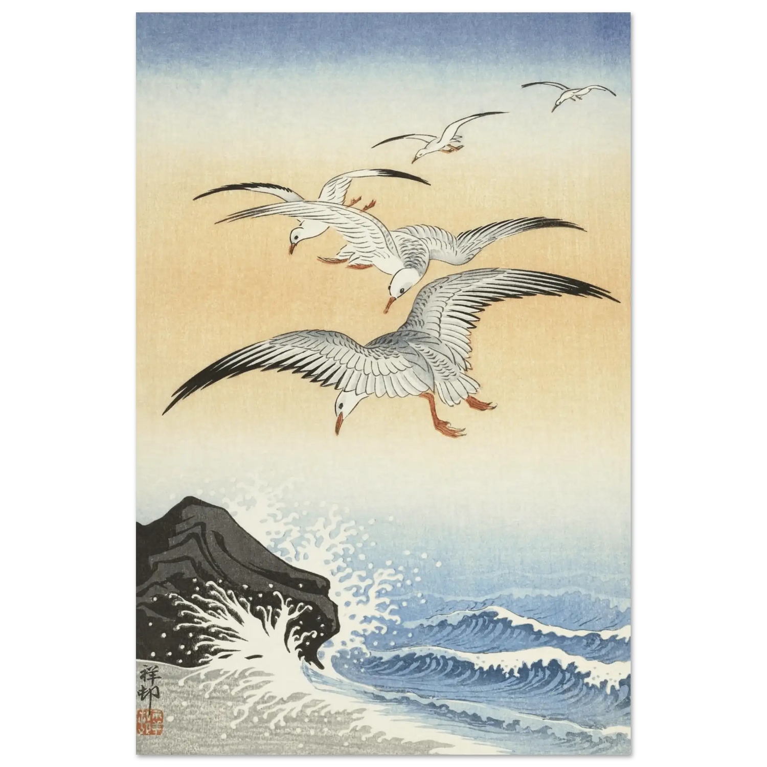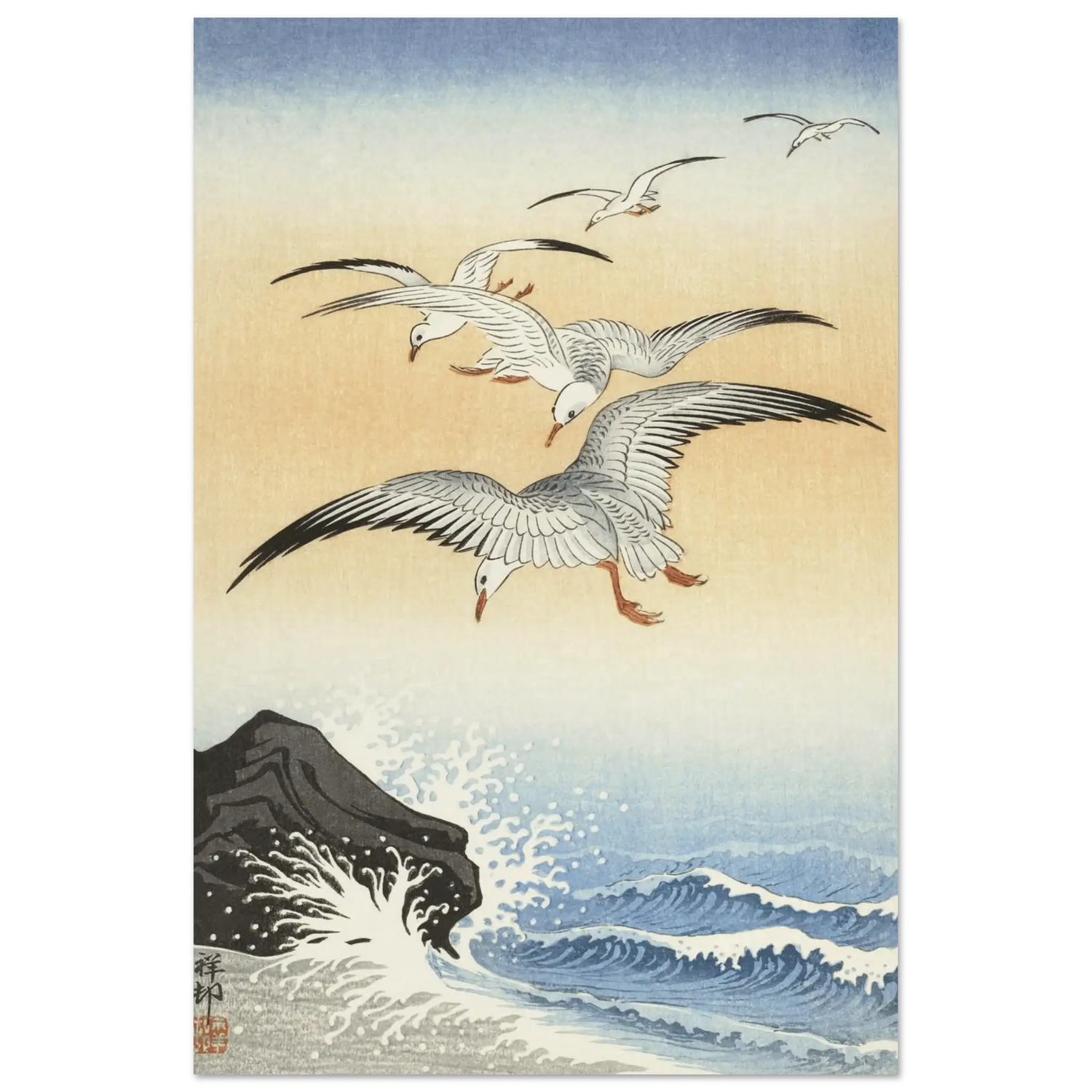 Dieses Werk stammt von Ohara Koson (1877–1945), dem Meister der Shin Hanga-Bewegung. In „Möwen über stürmischem Meer“ verbindet Koson die Kraft des Ozeans mit der Leichtigkeit des Fliegens.