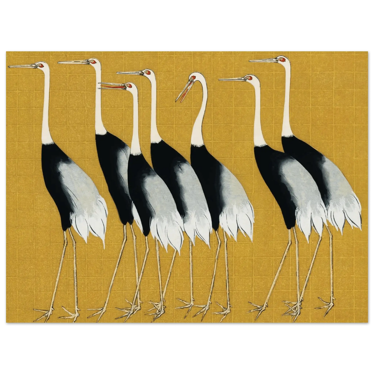 Sieben elegante Kraniche schreiten würdevoll über einen goldenen Hintergrund – ihre anmutige Haltung, die feinen Linien ihrer Flügel und die ruhige Balance der Komposition spiegeln vollkommene Harmonie wider.