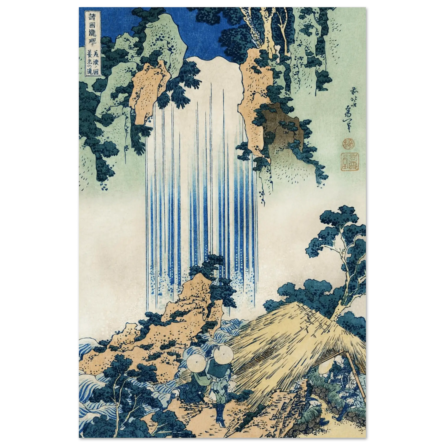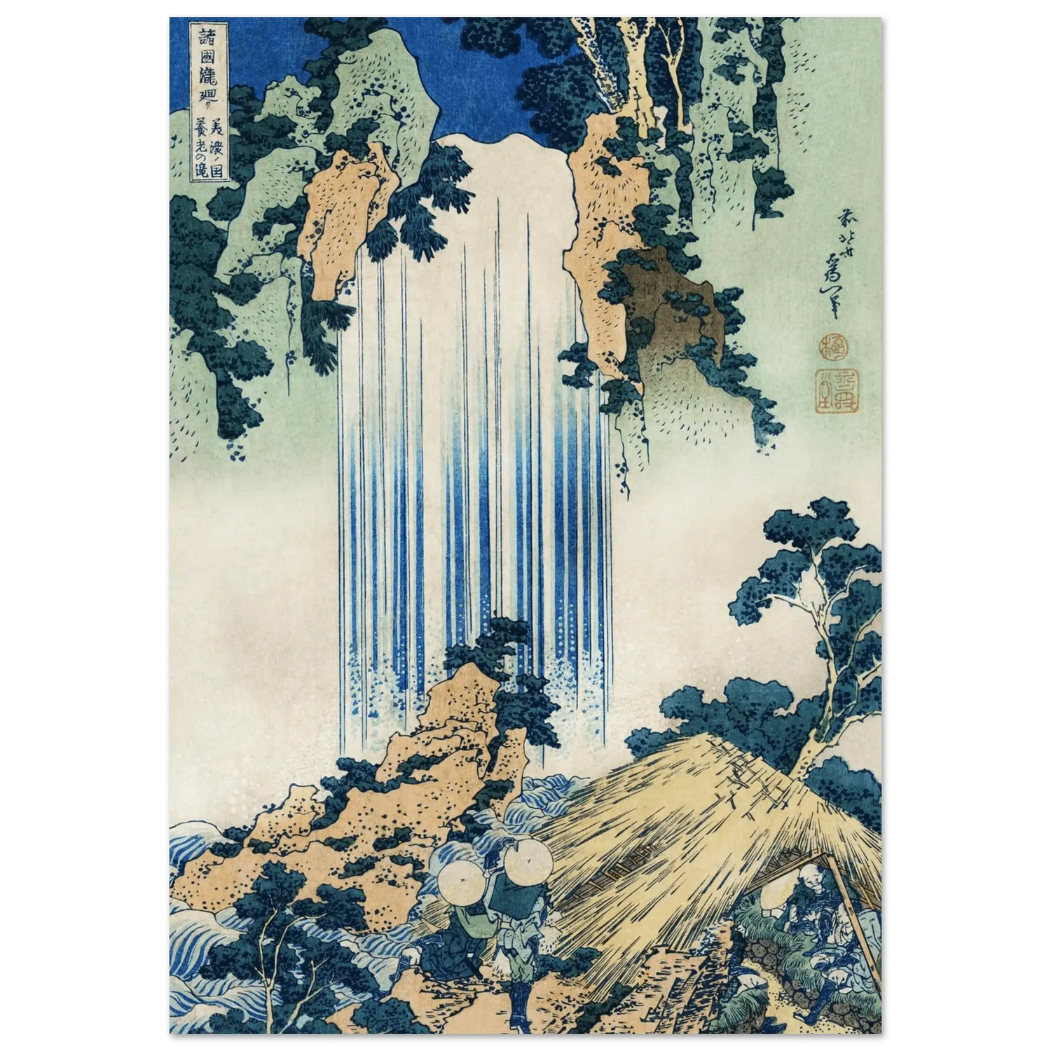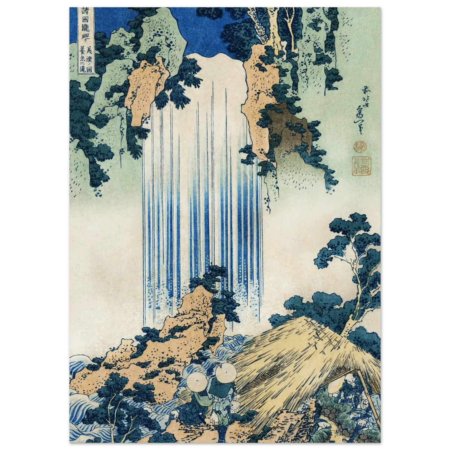 In „Yōrō-Wasserfall in Mino“ fängt er das Zusammenspiel zwischen Mensch und Natur in vollendeter Harmonie ein. Die senkrechten Linien des Wassers symbolisieren Reinheit und Beständigkeit, während die Landschaft durch die typisch tiefen Blautöne seiner aizuri-e-Technik lebendig wirkt.