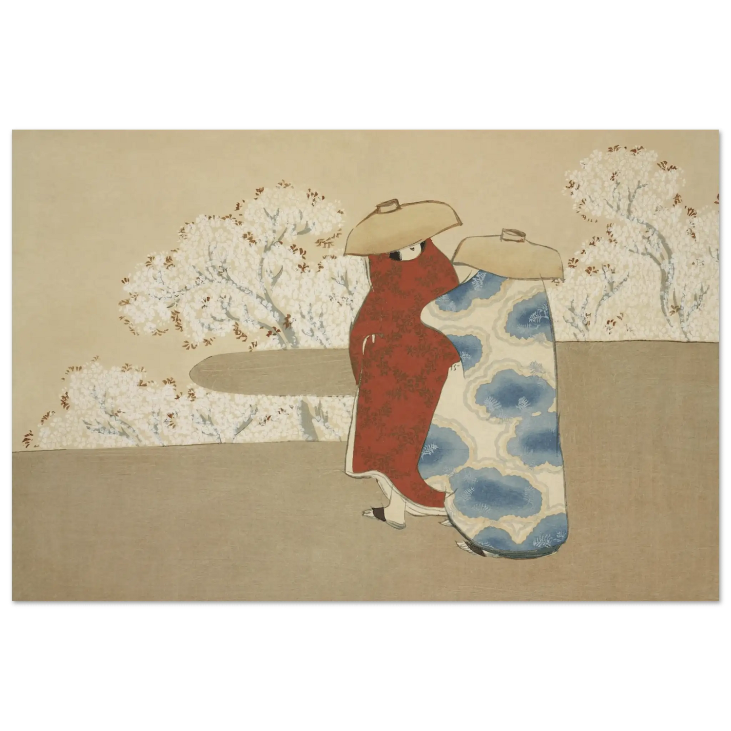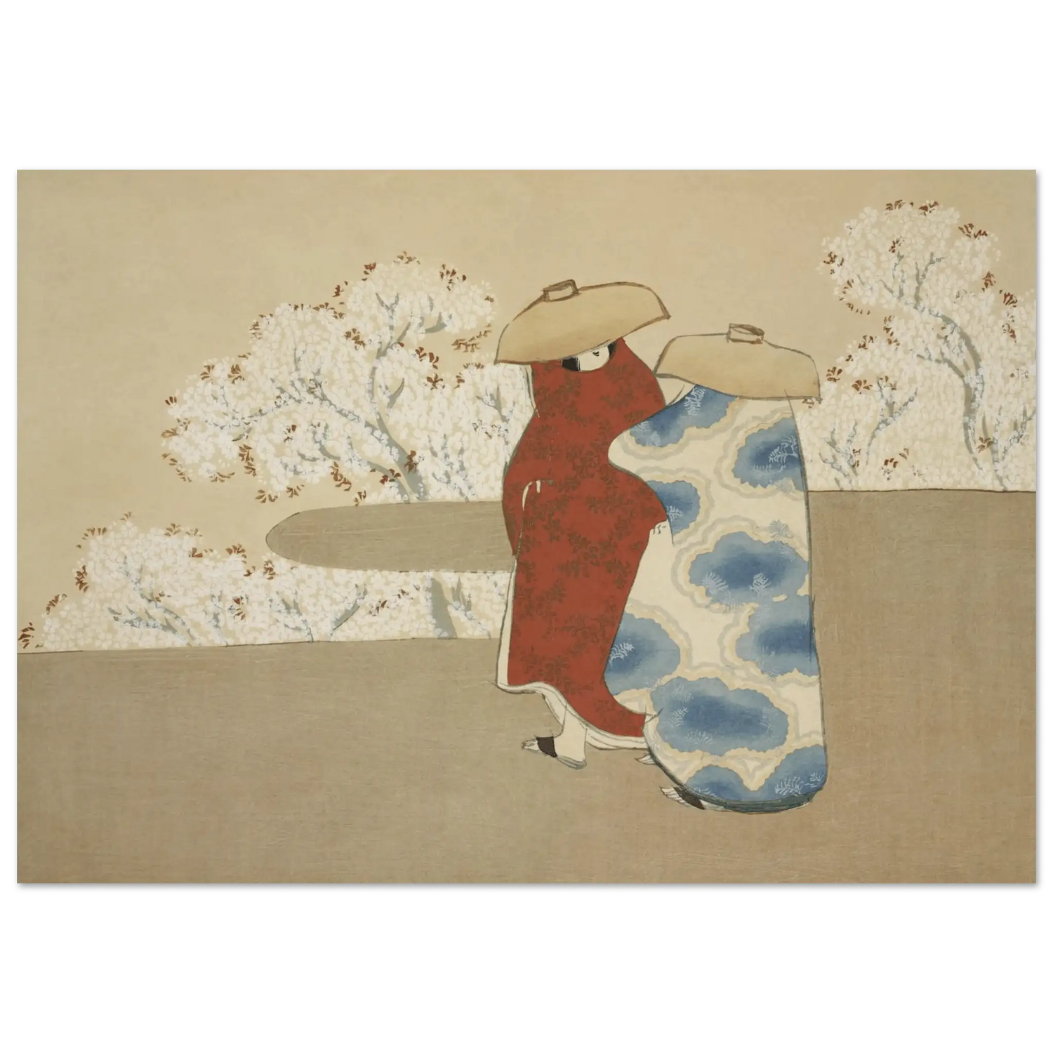 In „Hanami im Frühling“ zeigt Sekka sein einzigartiges Talent, traditionelle Themen in zeitgenössischer Formensprache zu interpretieren. Die klaren Linien, die stilisierte Farbfläche und die sanfte Komposition verleihen dem Bild eine fast träumerische Eleganz.