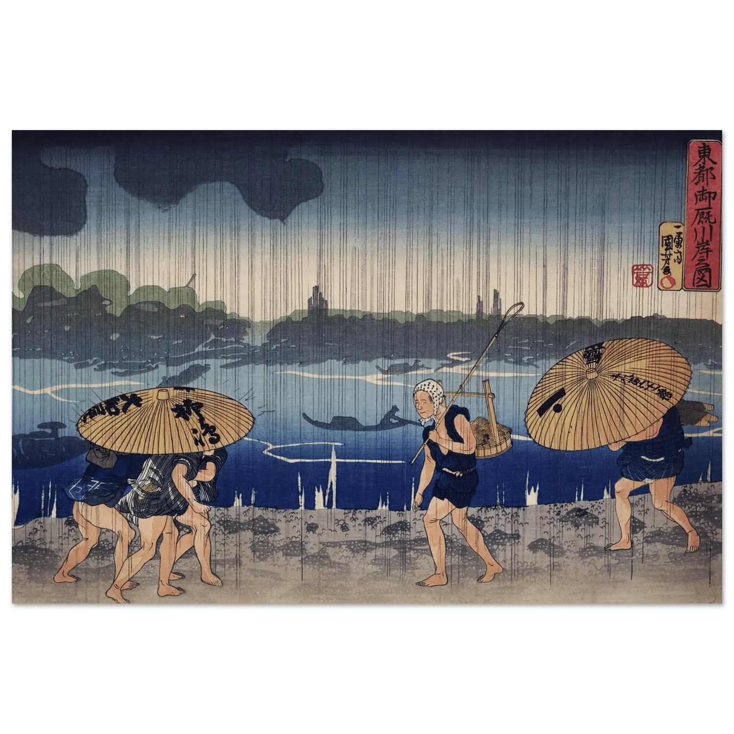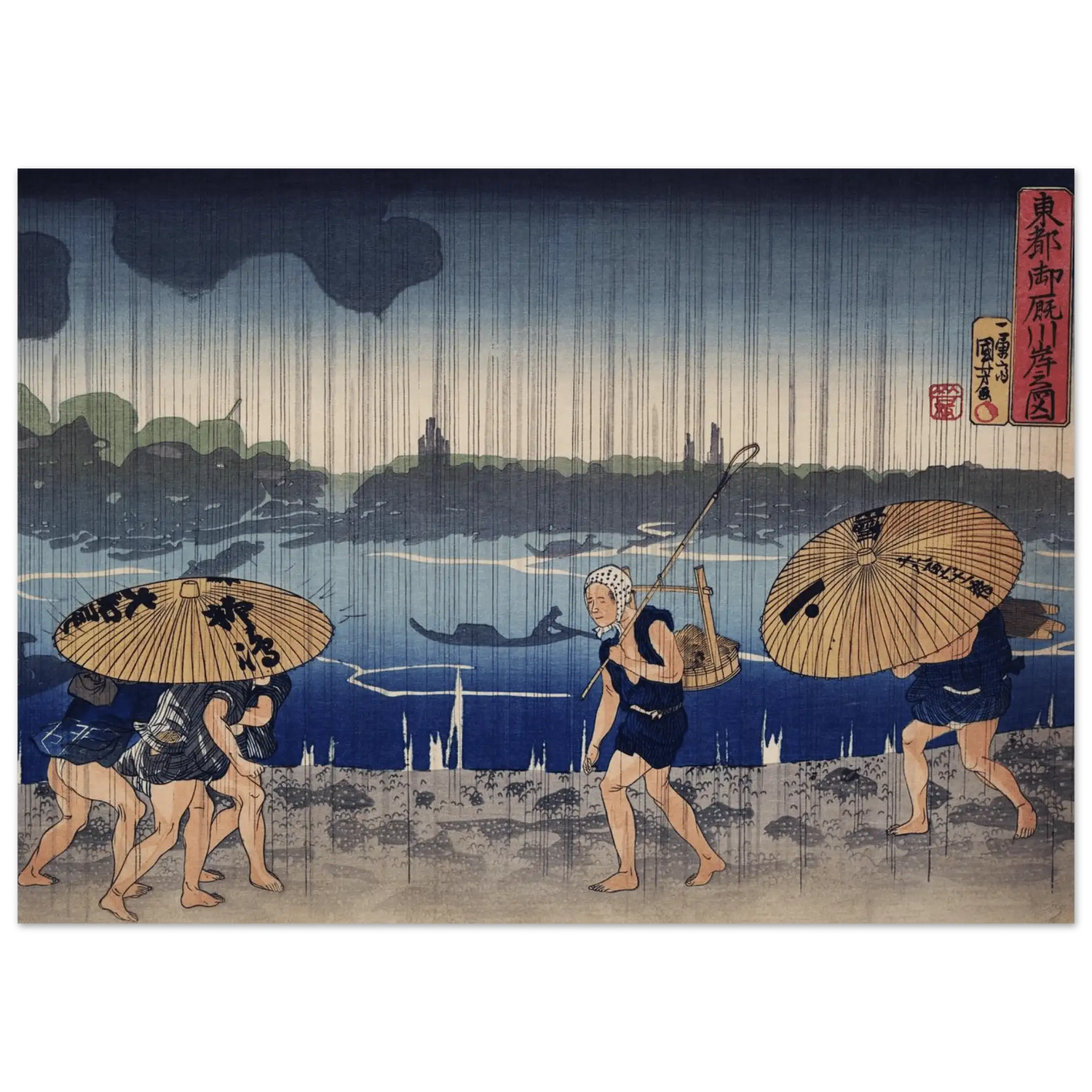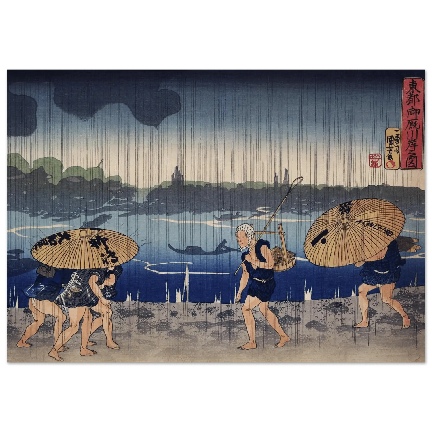 Dieses Werk von Utagawa Kuniyoshi (1798–1861) zeigt die Schönheit des Flüchtigen, die Stille im Regen, das Zusammenwirken von Mensch und Natur.