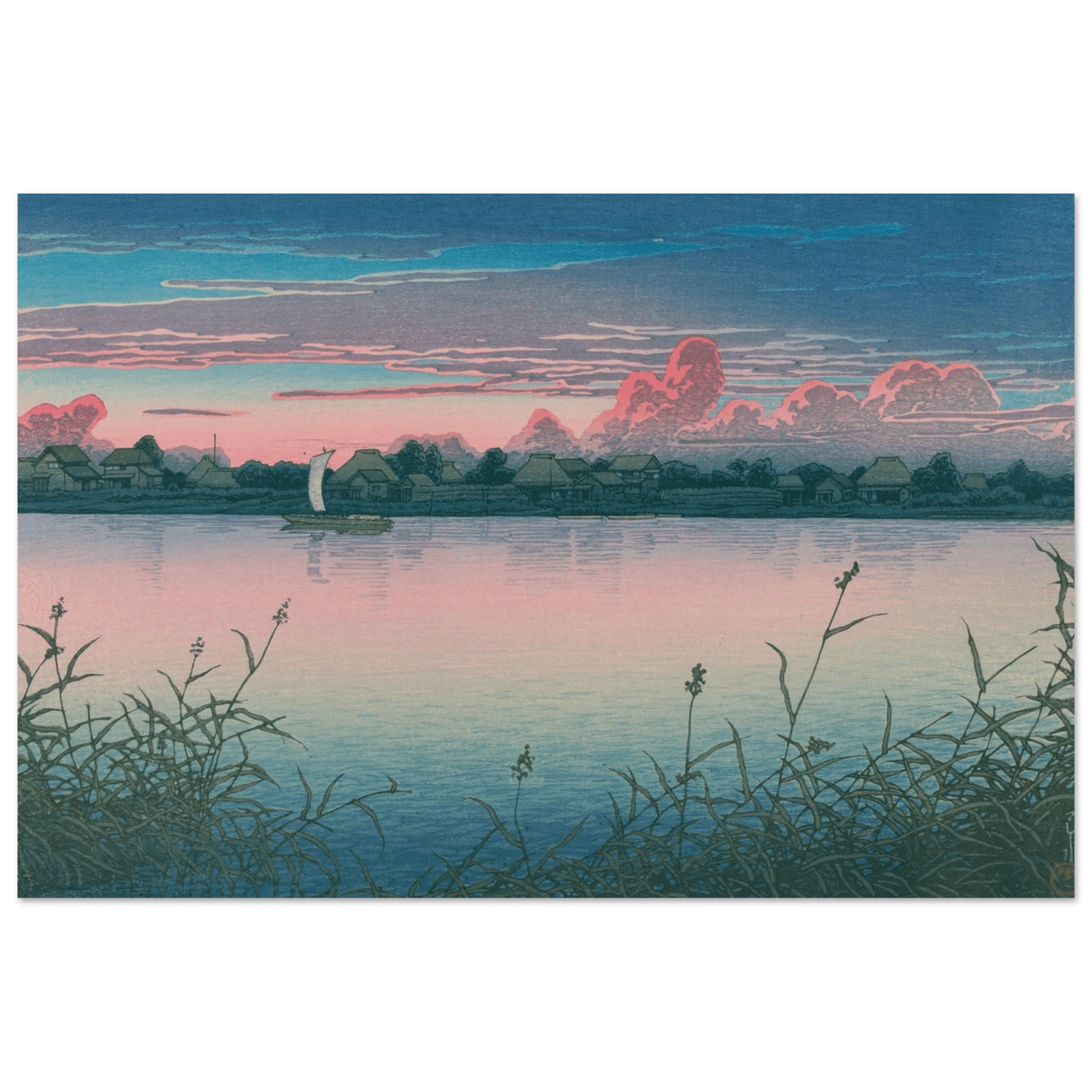 Ein stiller Abend senkt sich über das Wasser von Urayasu, wo das Licht des Herbstes Himmel und Fluss in sanftes Rosa und Blau taucht. Ein einsames Segel gleitet lautlos dahin, während die letzten Sonnenstrahlen die Wolken in leuchtendes Purpur färben. Kawase Hasui verwandelt diesen Moment in ein Gedicht aus Farbe und Stille – ein Sinnbild des vergänglichen Gleichgewichts zwischen Mensch und Natur.