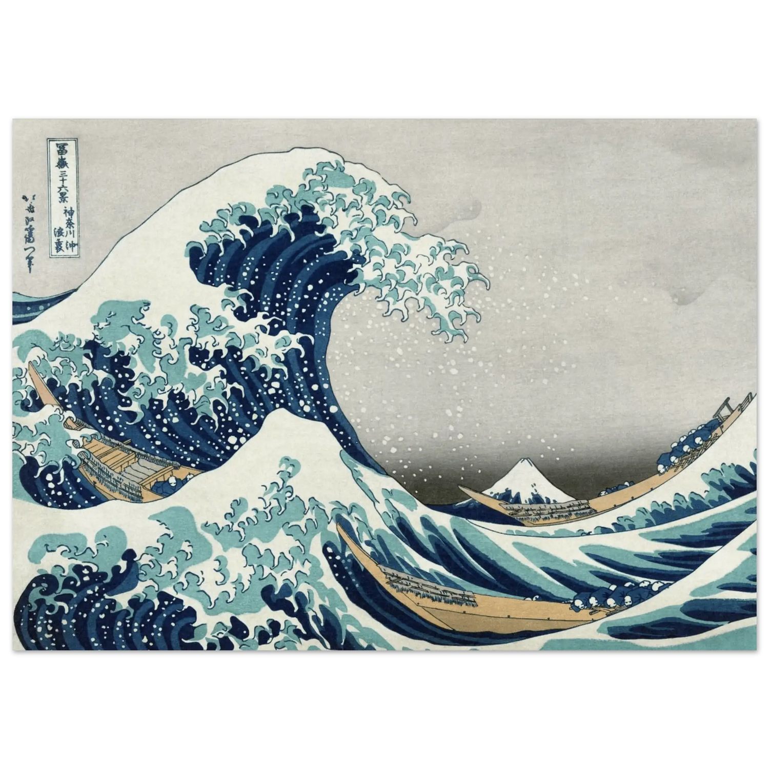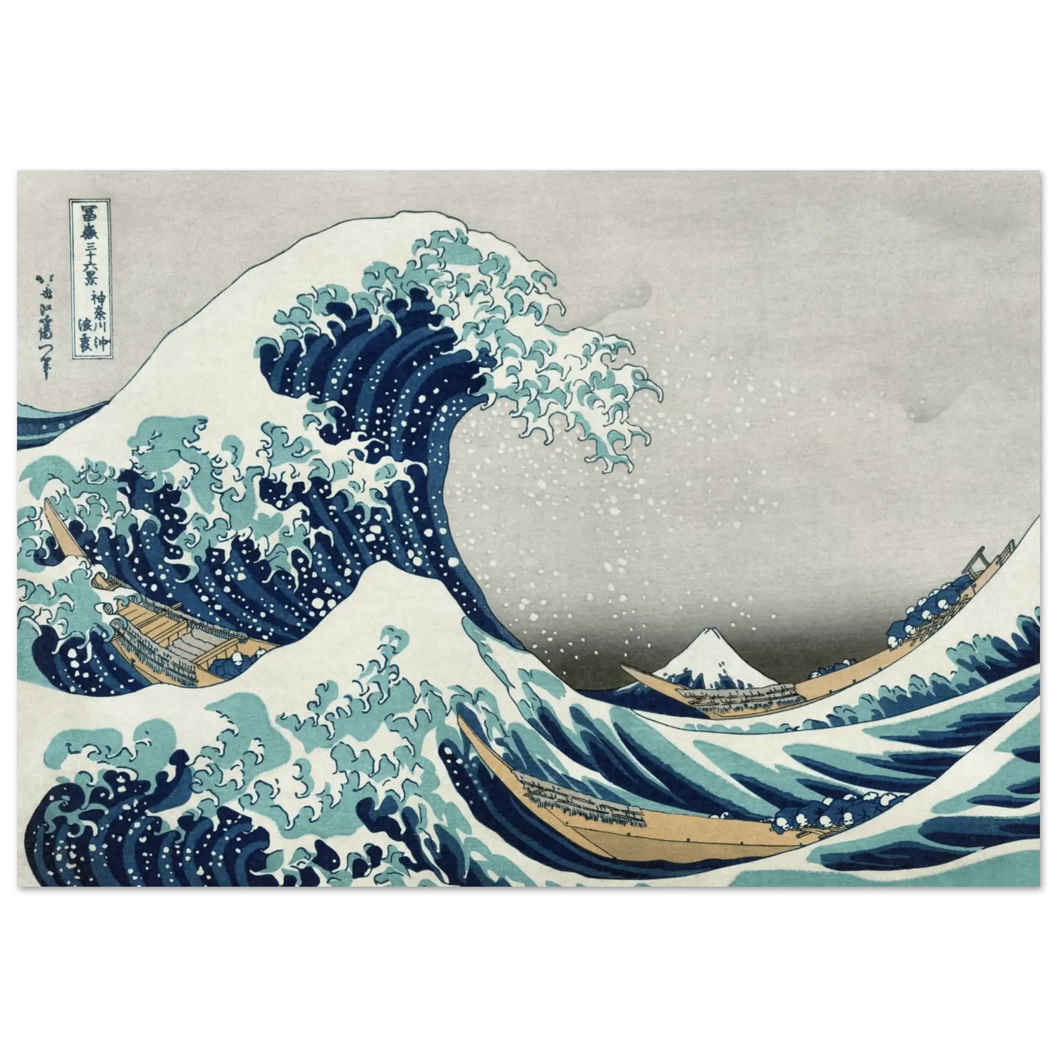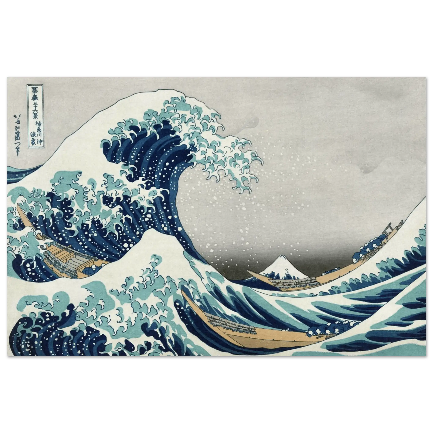Eine gewaltige Welle erhebt sich drohend über kleine Fischerboote, ihre weißen Schaumkronen krümmen sich wie Krallen über dem Meer. Im Hintergrund, ruhig und unerschütterlich, steht der heilige Berg Fuji – Symbol der Beständigkeit inmitten des Chaos.
