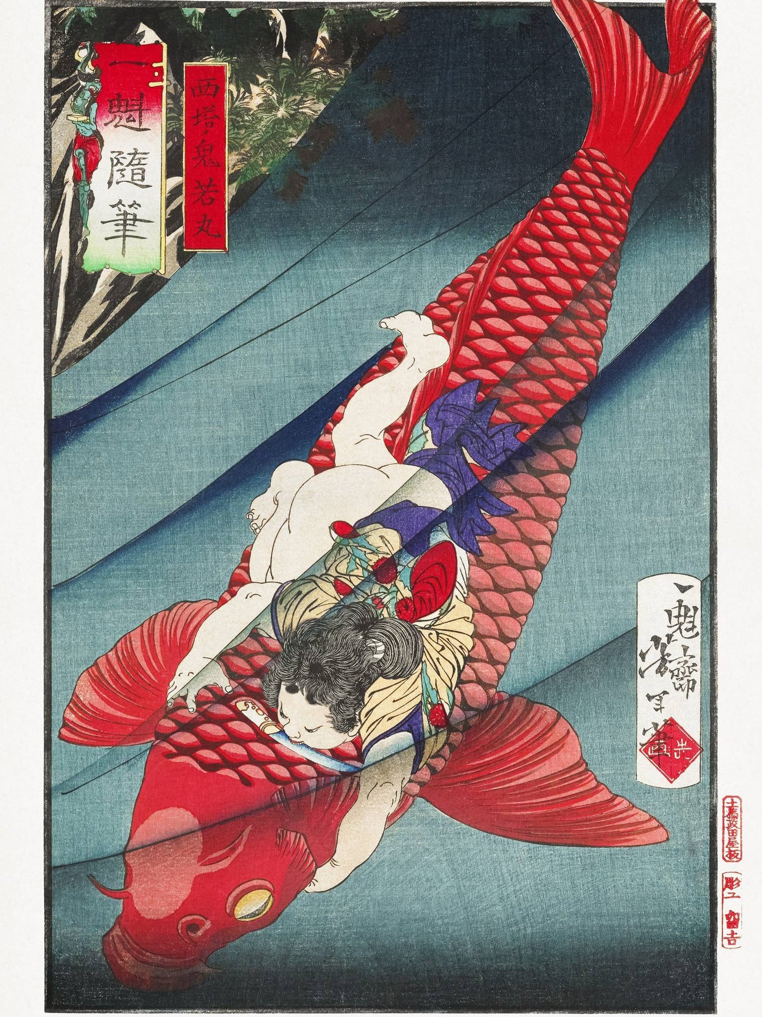 Dieses Werk stammt von Tsukioka Yoshitoshi (1839–1892) und wurde um 1872–1873 geschaffen. Es zeigt den jungen Helden Oniwakamaru, der unter einem Wasserfall gegen einen monströsen Karpfen kämpft – ein Sinnbild für Mut, Stärke und den Kampf gegen das Schicksal.