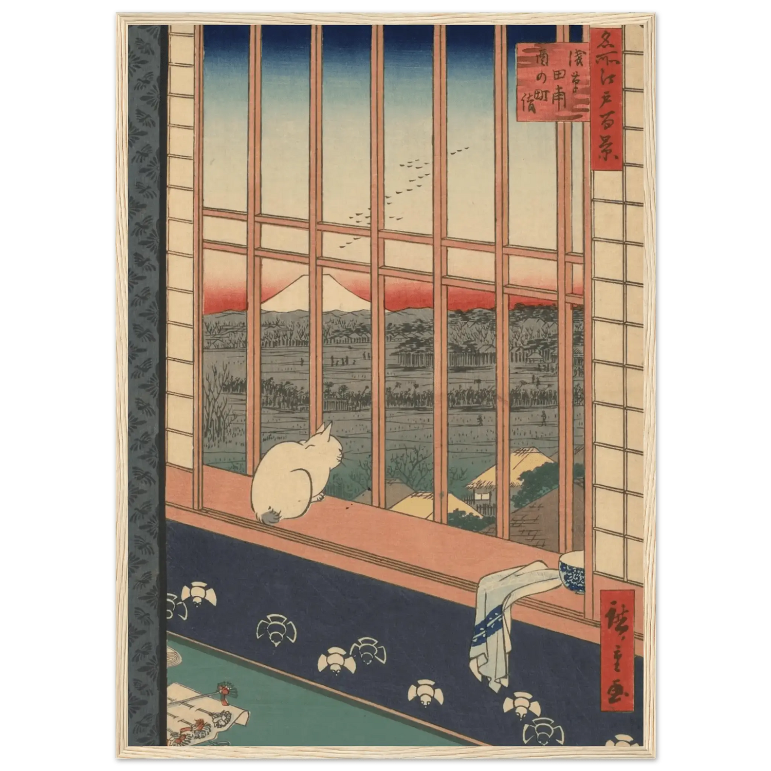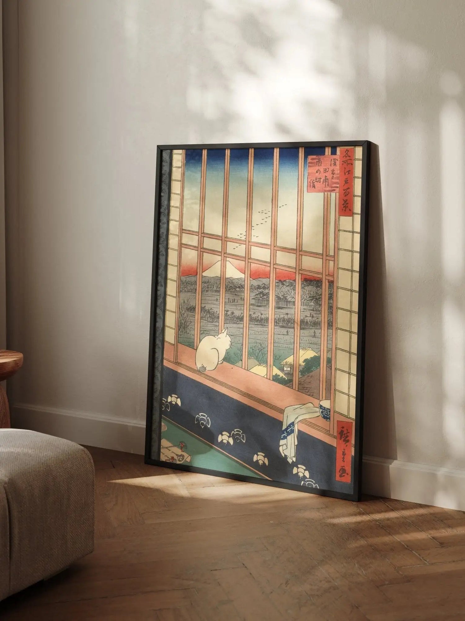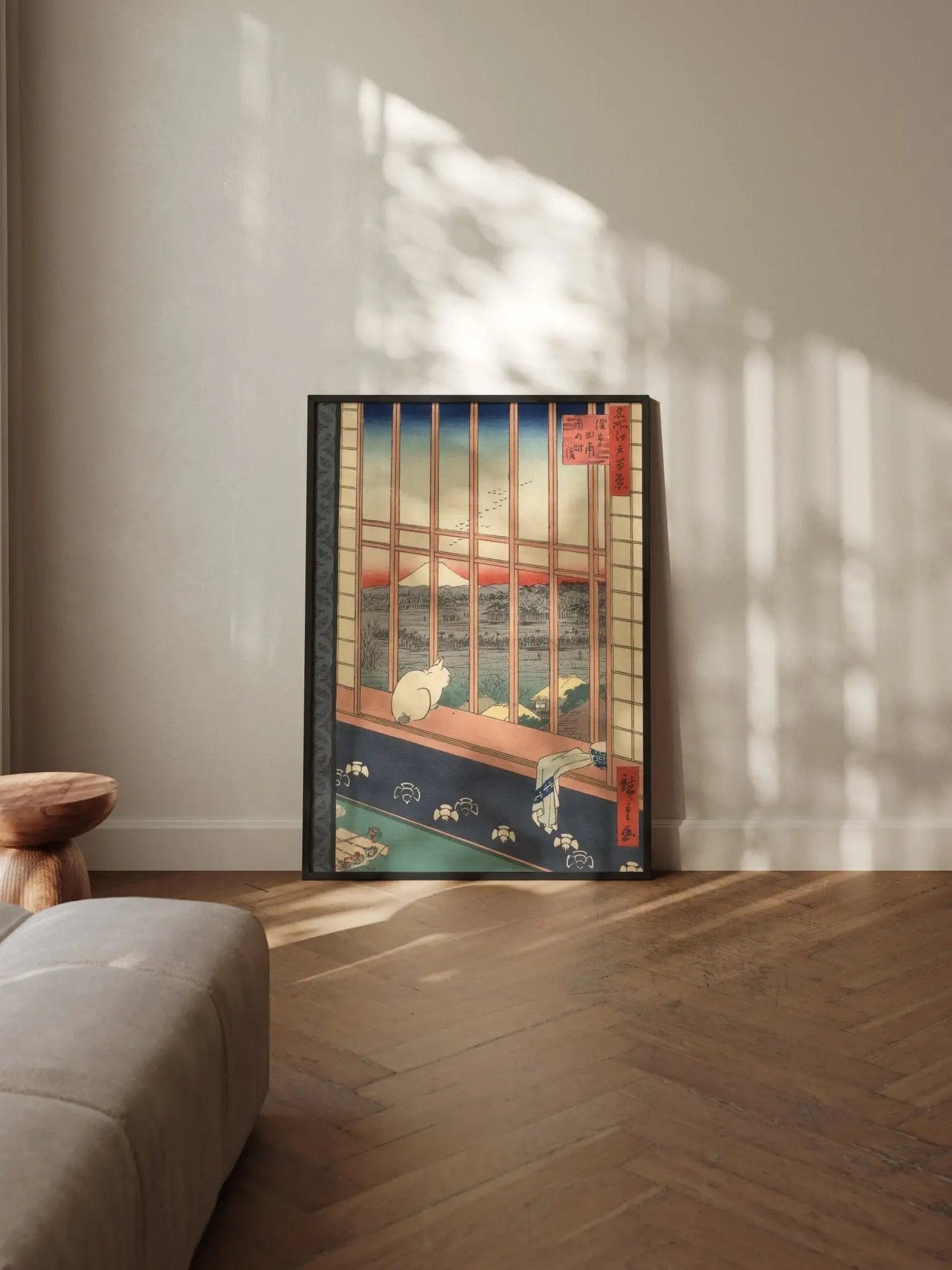 Ein Werk japanischer Meisterkunst – vollendet in Form und Proportion. Der präzise Kiefernholzrahmen verleiht dem Motiv architektonische Klarheit und verankert es im Raum. Eine Ausführung mit Haltung.