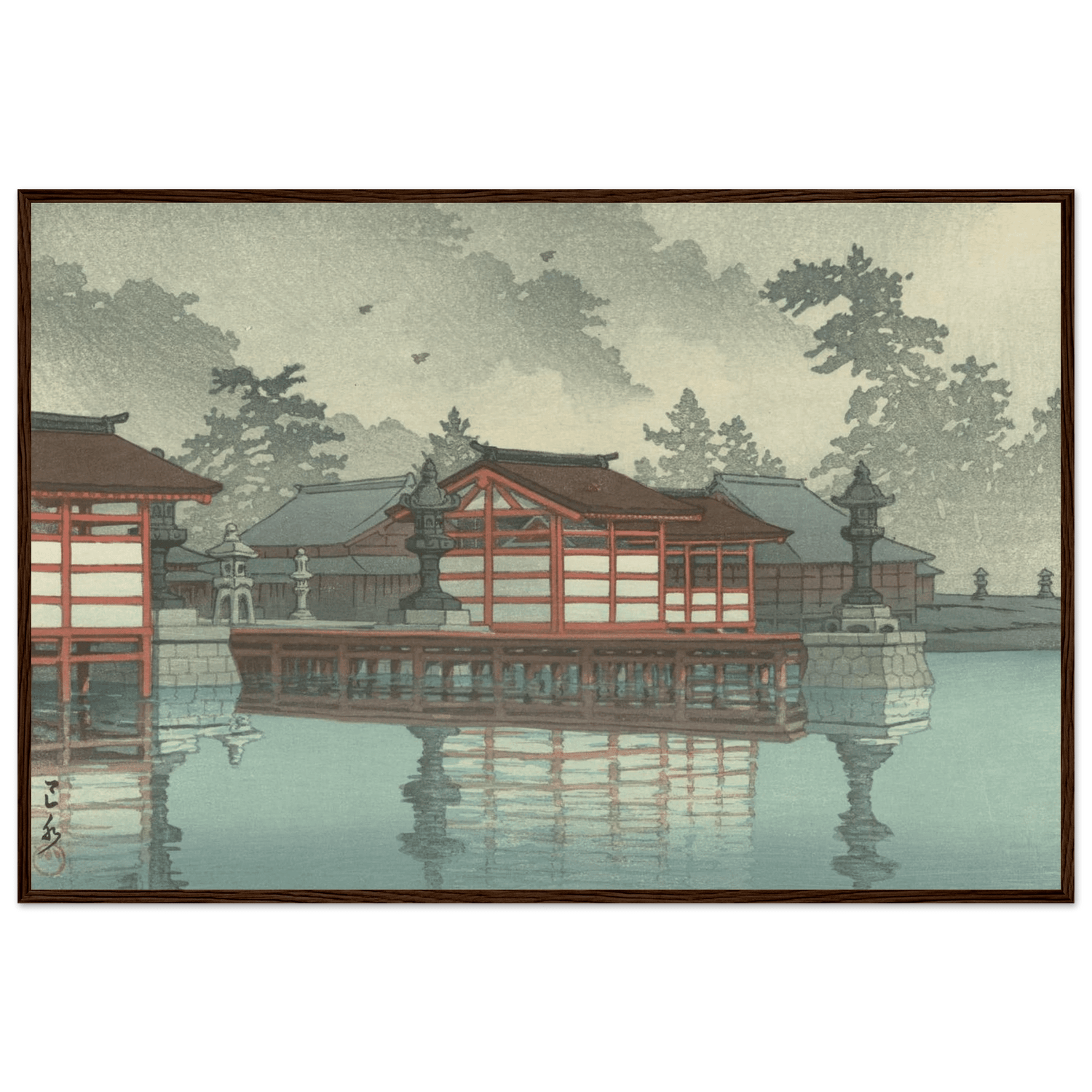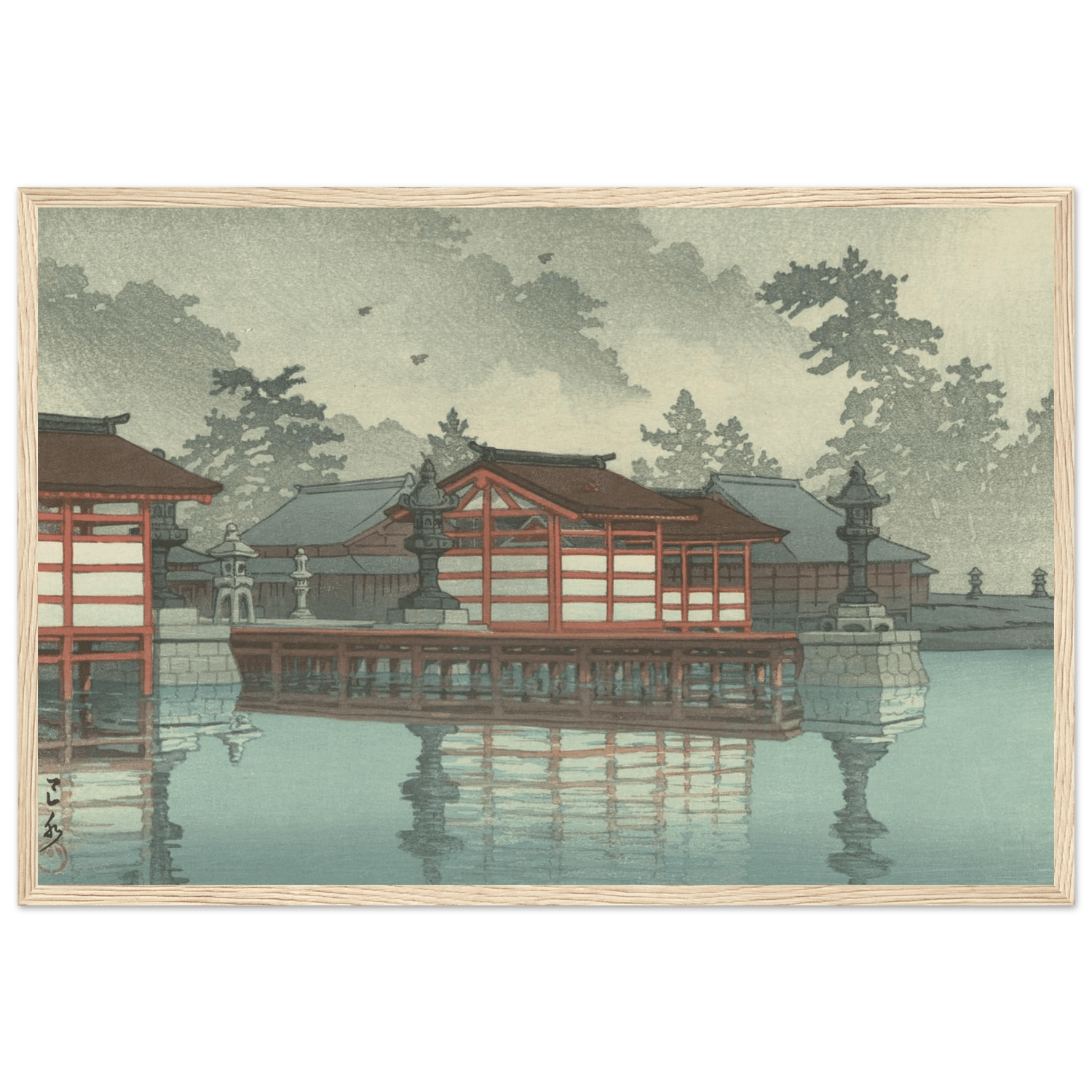 Ein zarter Nebel liegt über dem Wasser und verwischt die Grenzen zwischen Himmel, Tempel und Spiegelung. Die roten Pavillons des Itsukushima-Schreins schimmern still im matten Morgenlicht, ihre Formen lösen sich sanft im Dunst auf. Kawase Hasui verwandelt die heilige Insel Miyajima in ein Sinnbild der Vergänglichkeit – ein Ort, an dem Stille und Ewigkeit sich berühren.