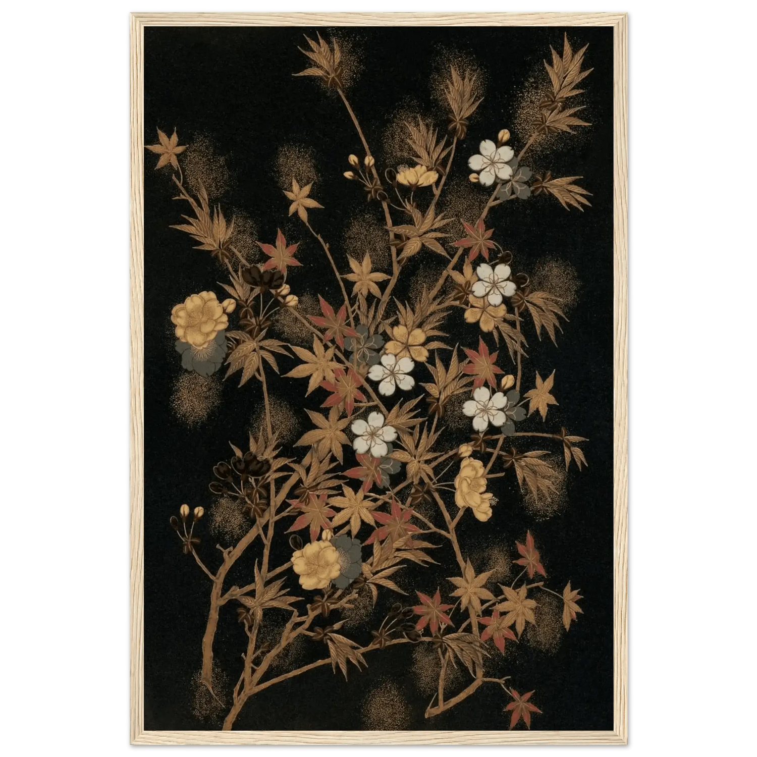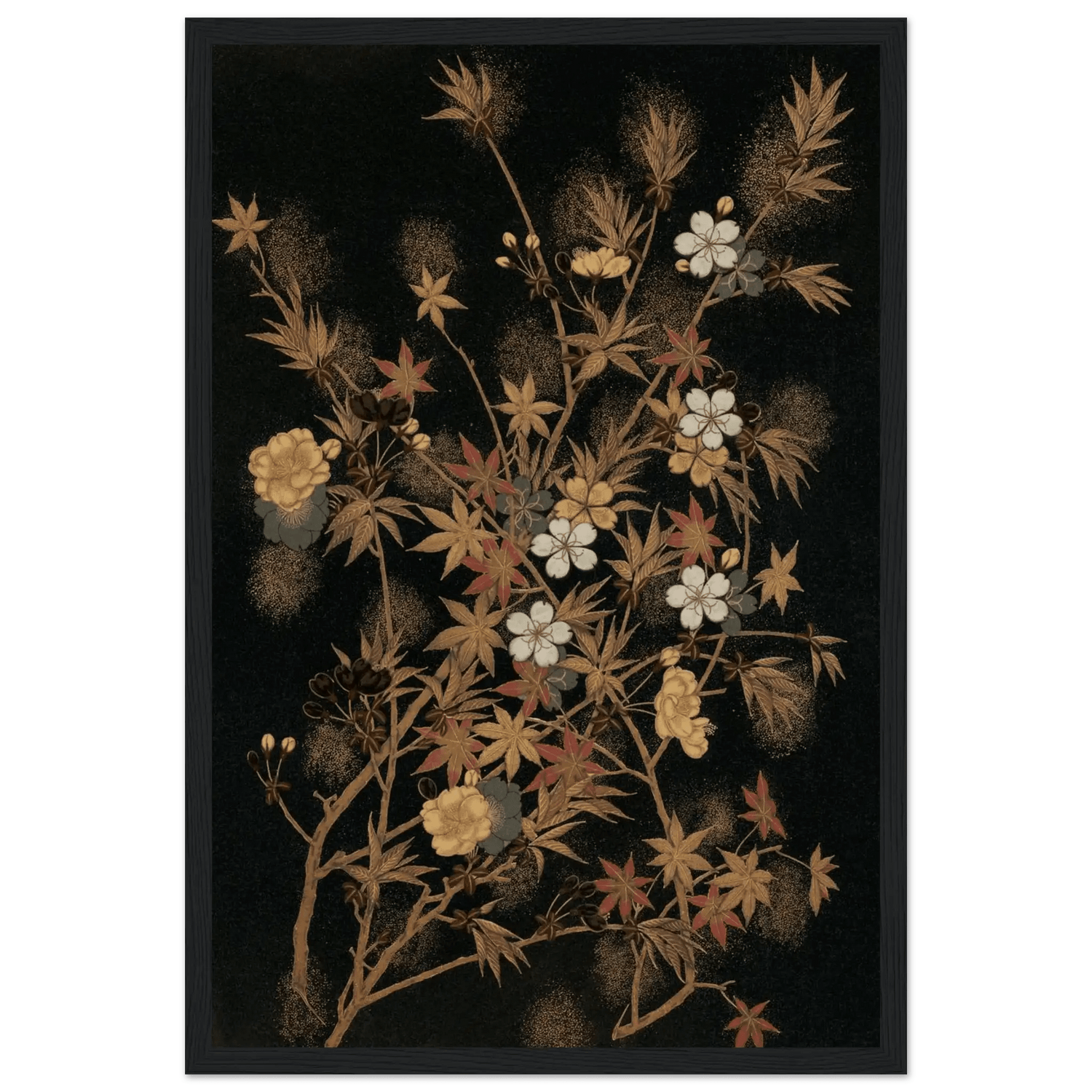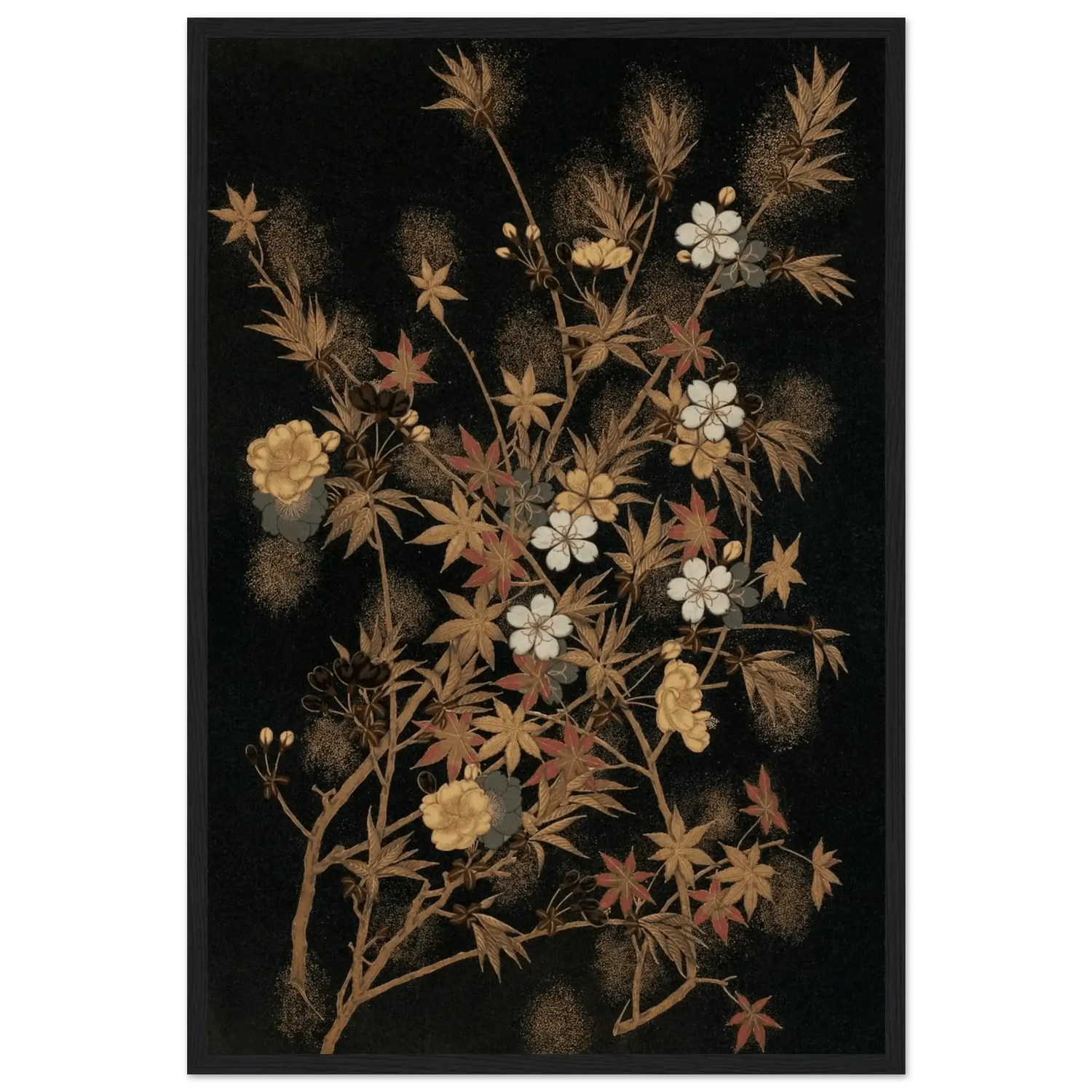 Ein feines Geflecht aus zarten Zweigen, Ahornblättern und Blüten entfaltet sich vor tiefschwarzem Hintergrund. Goldene und kupferfarbene Akzente, durchsetzt von weißen Kirschblüten und roten Herbstblättern, schaffen eine subtile Balance zwischen Fülle und Leichtigkeit.