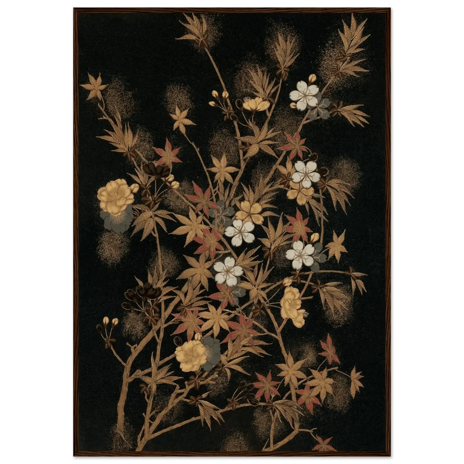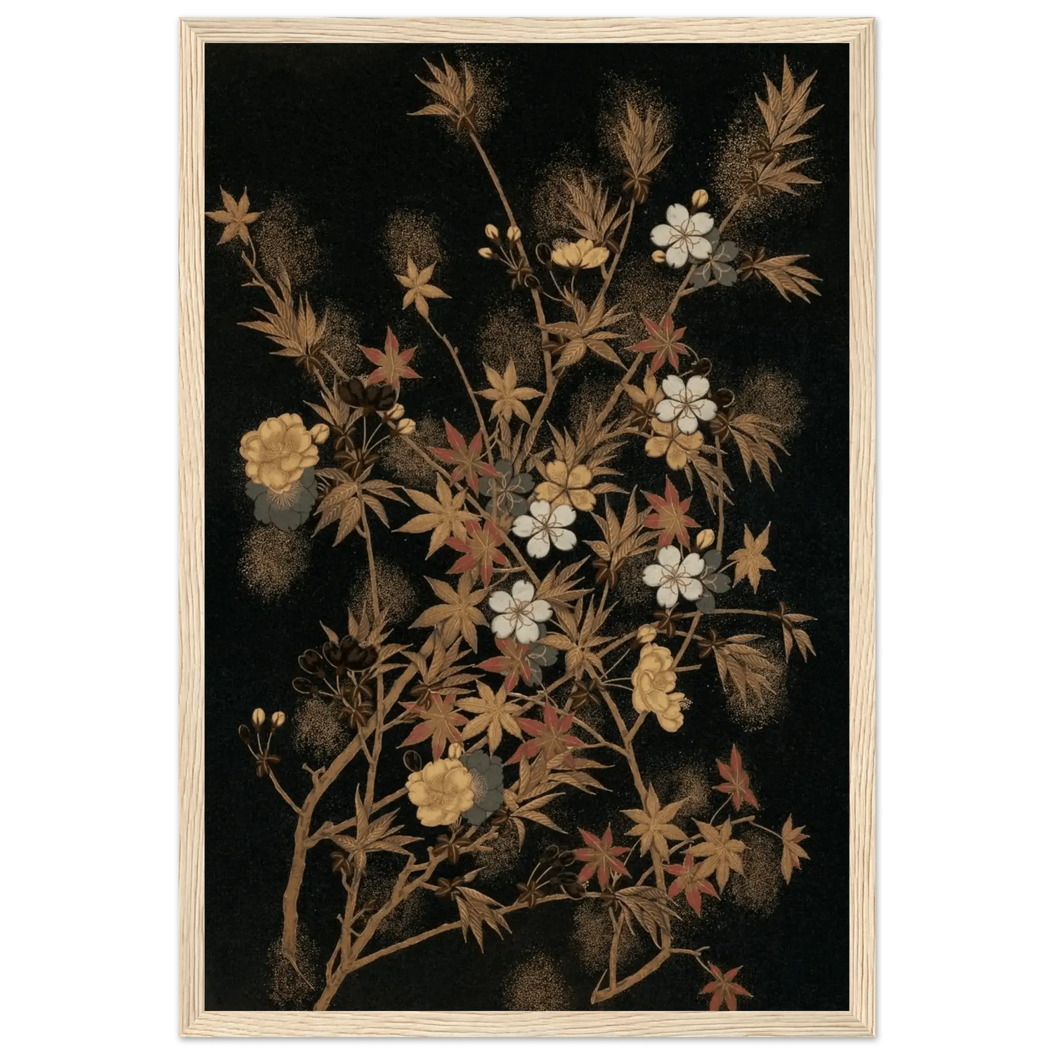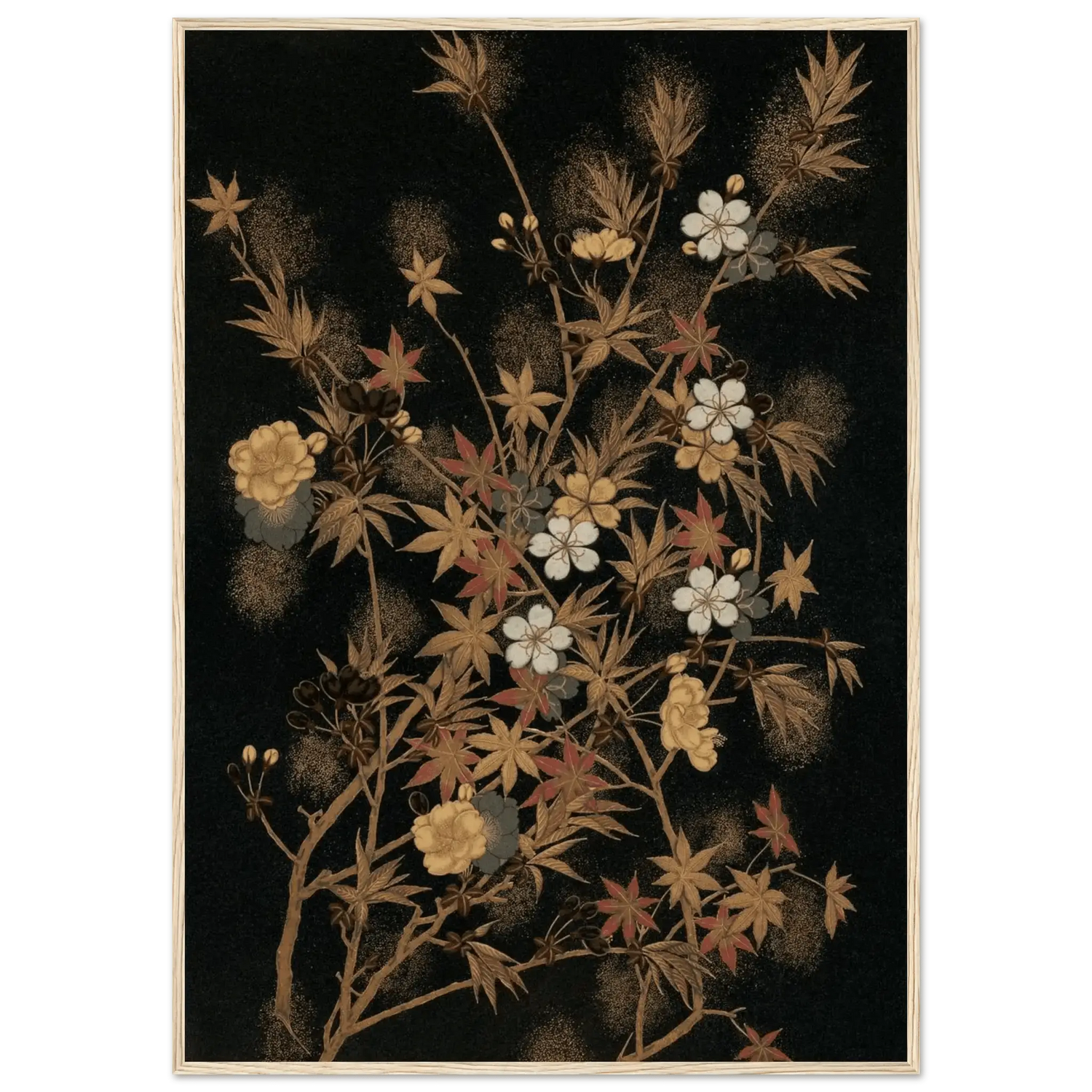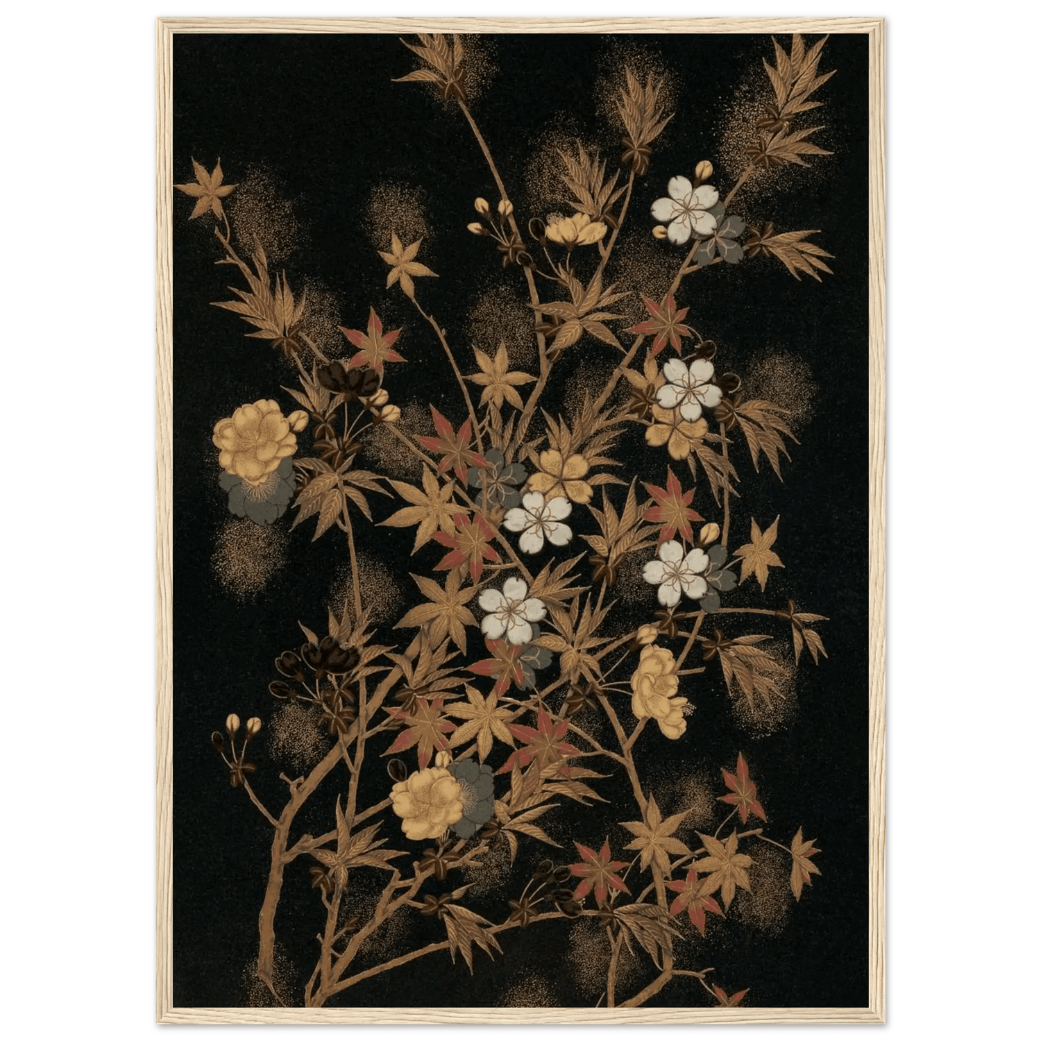 Ein feines Geflecht aus zarten Zweigen, Ahornblättern und Blüten entfaltet sich vor tiefschwarzem Hintergrund. Goldene und kupferfarbene Akzente, durchsetzt von weißen Kirschblüten und roten Herbstblättern, schaffen eine subtile Balance zwischen Fülle und Leichtigkeit.