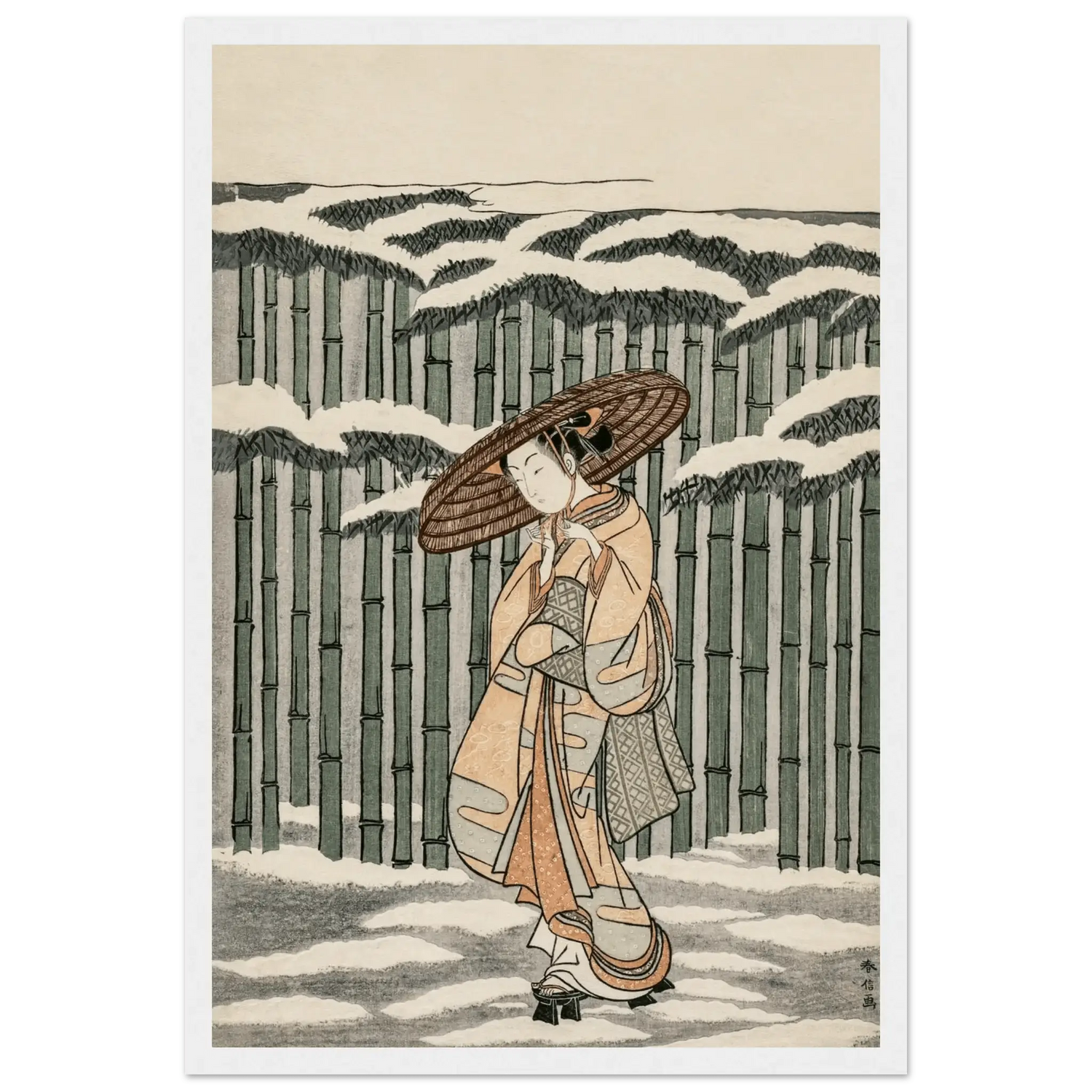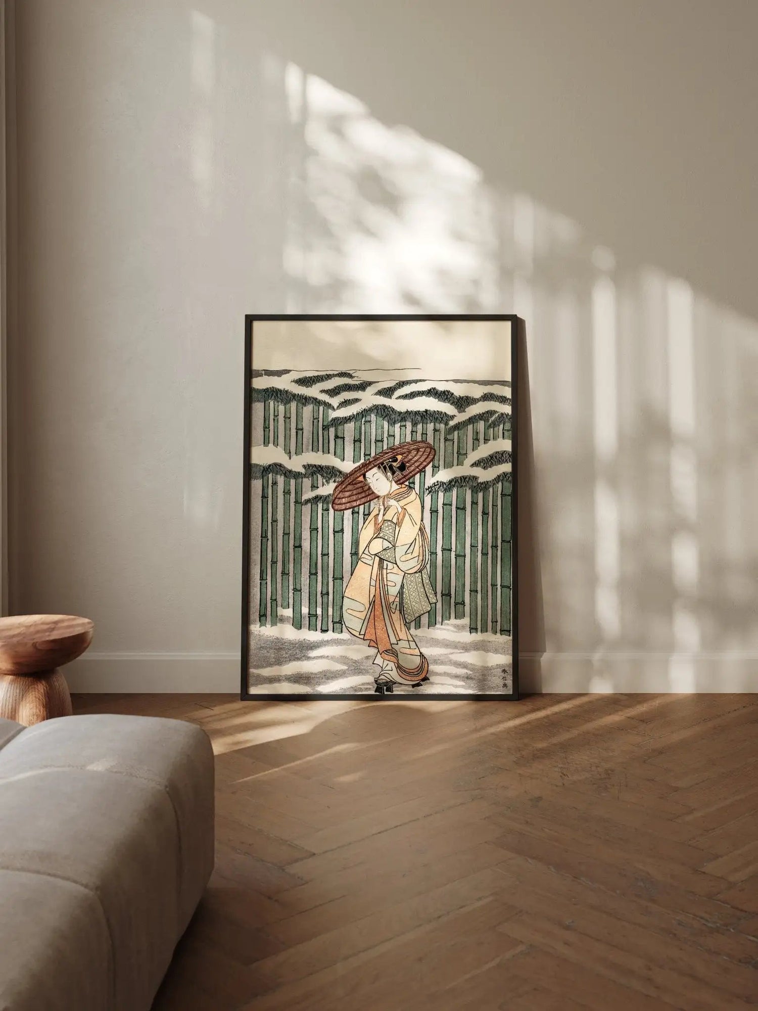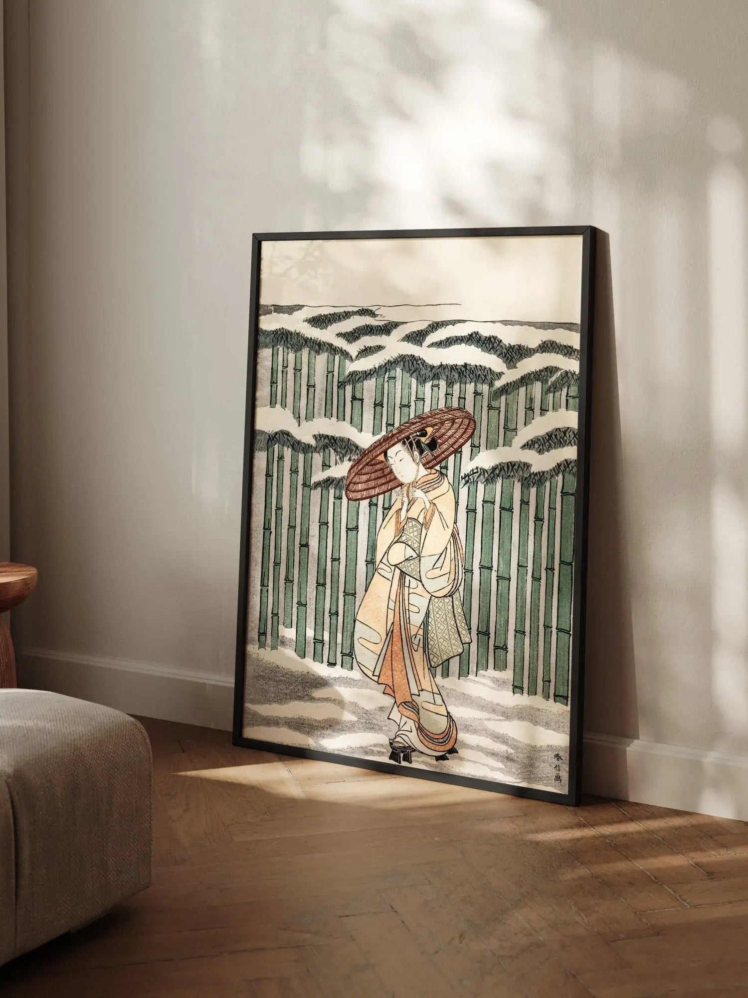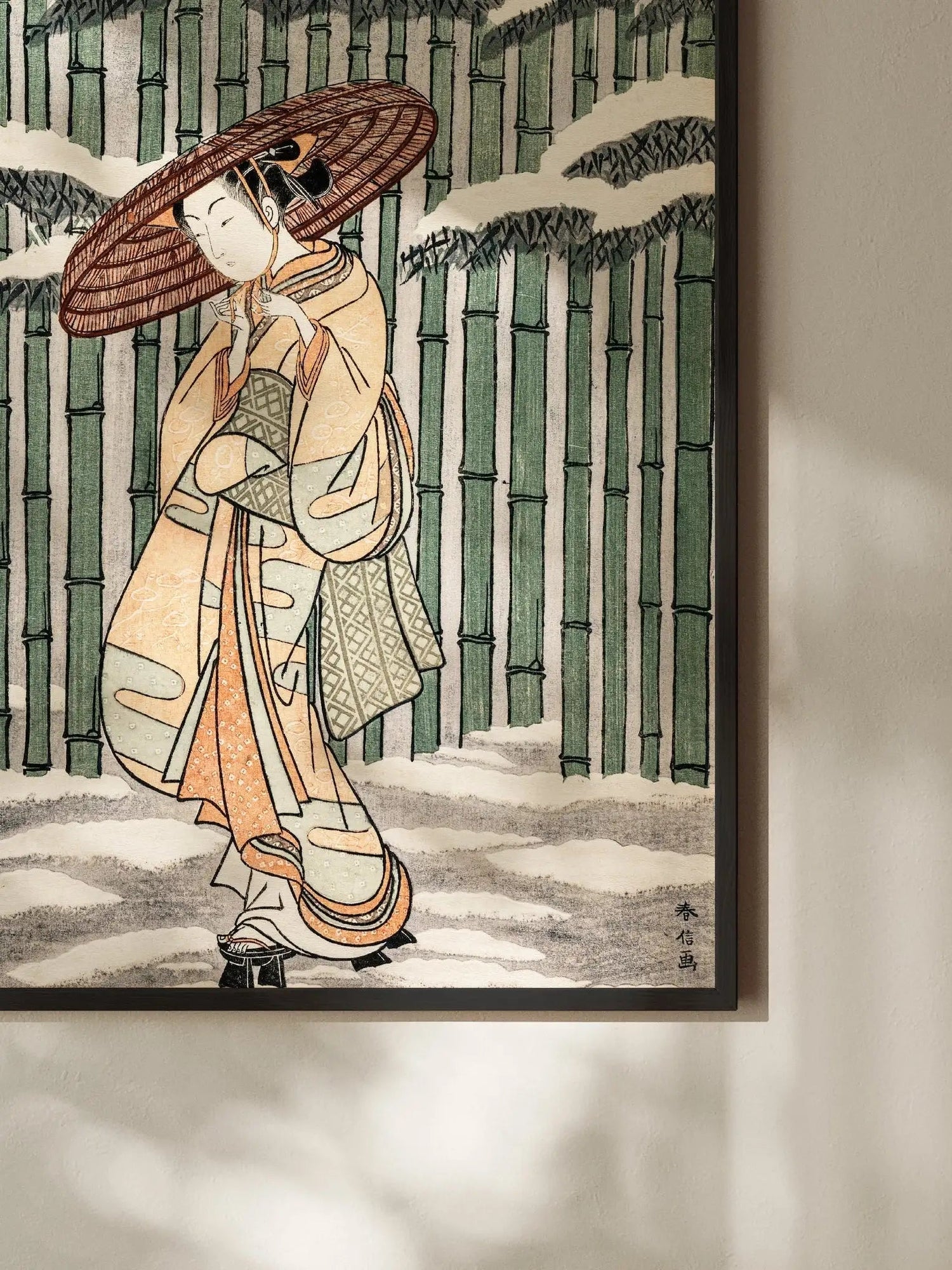 Eine junge Frau schreitet anmutig durch einen verschneiten Bambuswald. Ihr zarter Kimono in Pfirsich- und Grüntönen hebt sich sanft vom stillen Weiß des Schnees ab. Über ihr senken sich die Bambushalme, schwer von der winterlichen Last, während sie ihren Weg mit ruhiger Eleganz fortsetzt – geschützt unter einem breiten Strohhut, der sie vor der Kälte bewahrt.