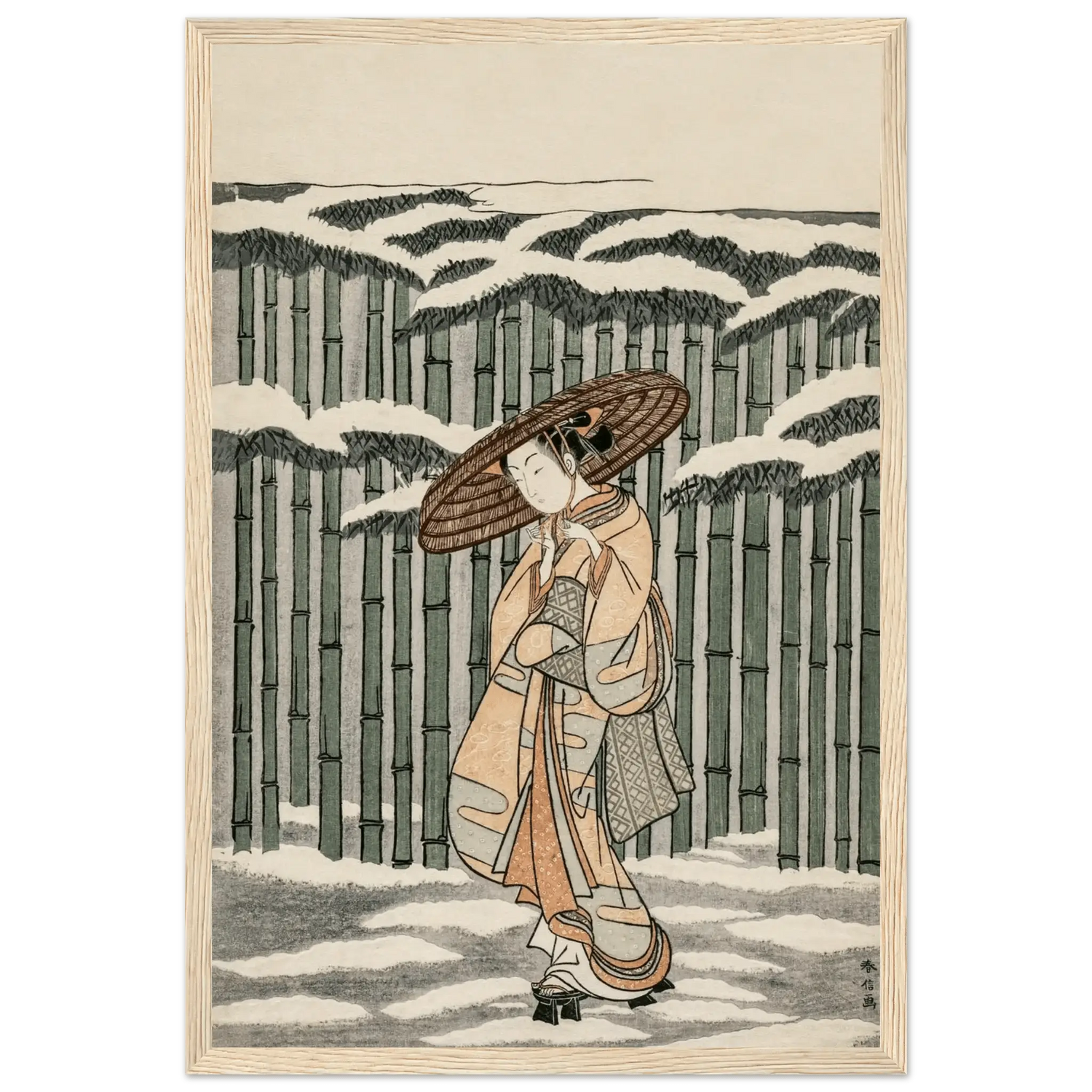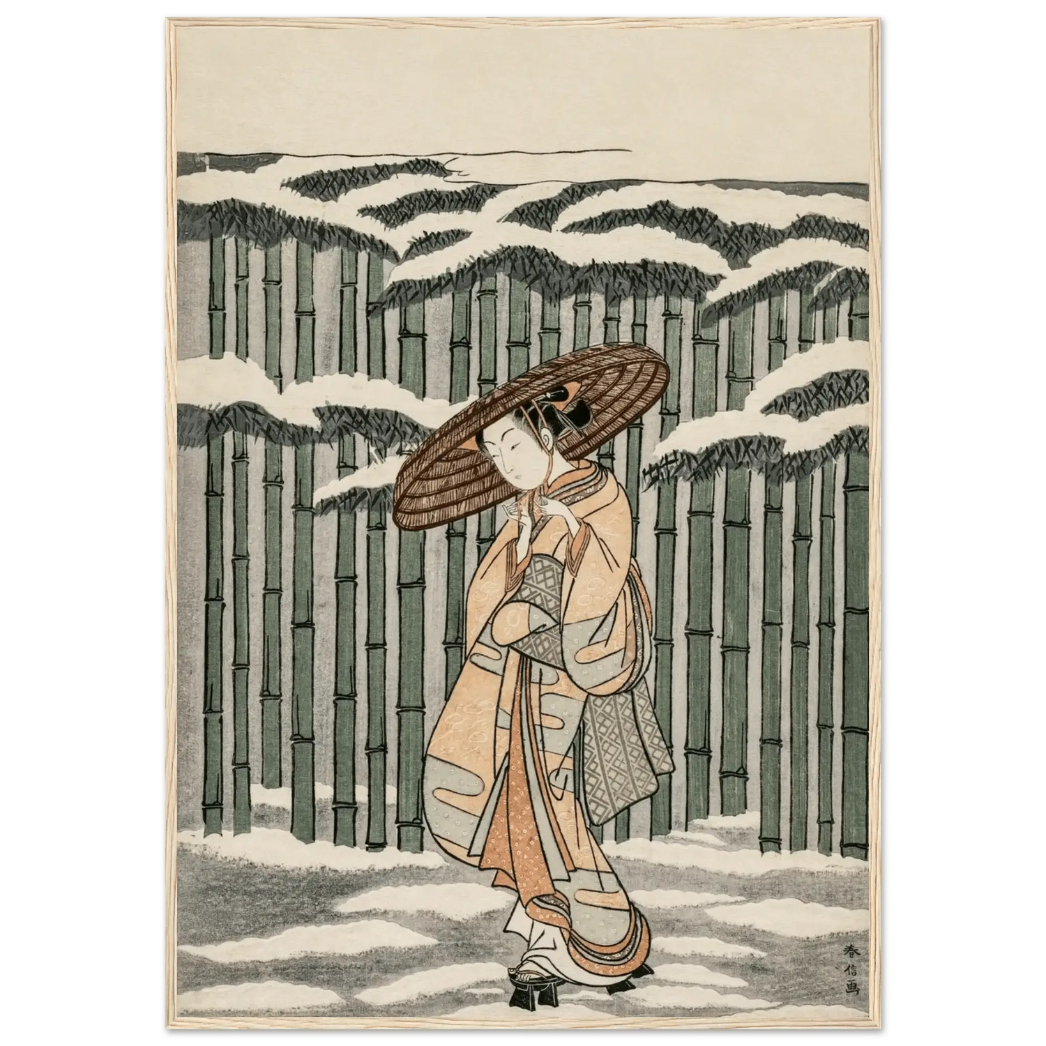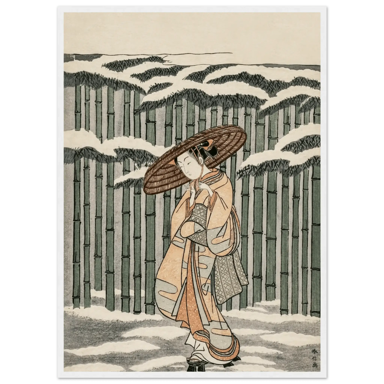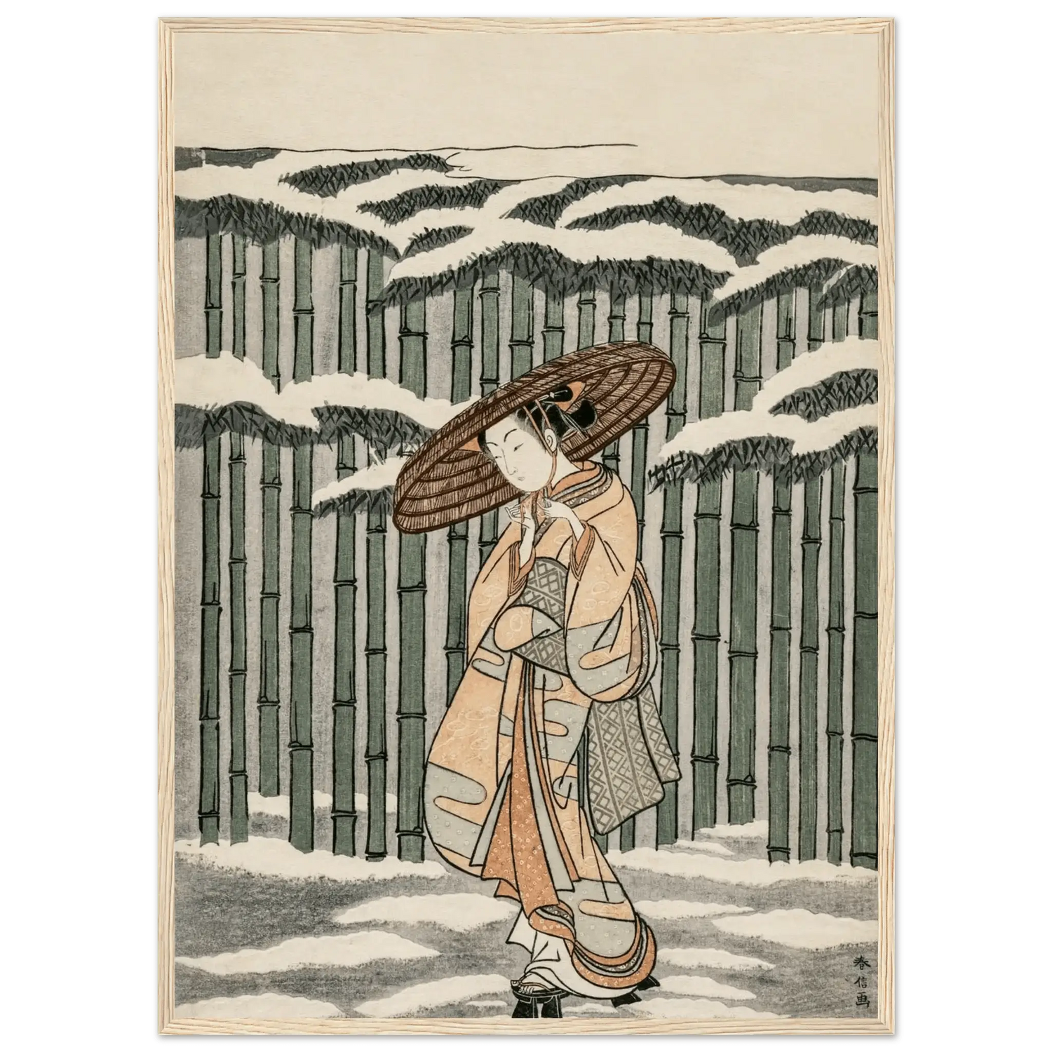 Eine junge Frau schreitet anmutig durch einen verschneiten Bambuswald. Ihr zarter Kimono in Pfirsich- und Grüntönen hebt sich sanft vom stillen Weiß des Schnees ab. Über ihr senken sich die Bambushalme, schwer von der winterlichen Last, während sie ihren Weg mit ruhiger Eleganz fortsetzt – geschützt unter einem breiten Strohhut, der sie vor der Kälte bewahrt.