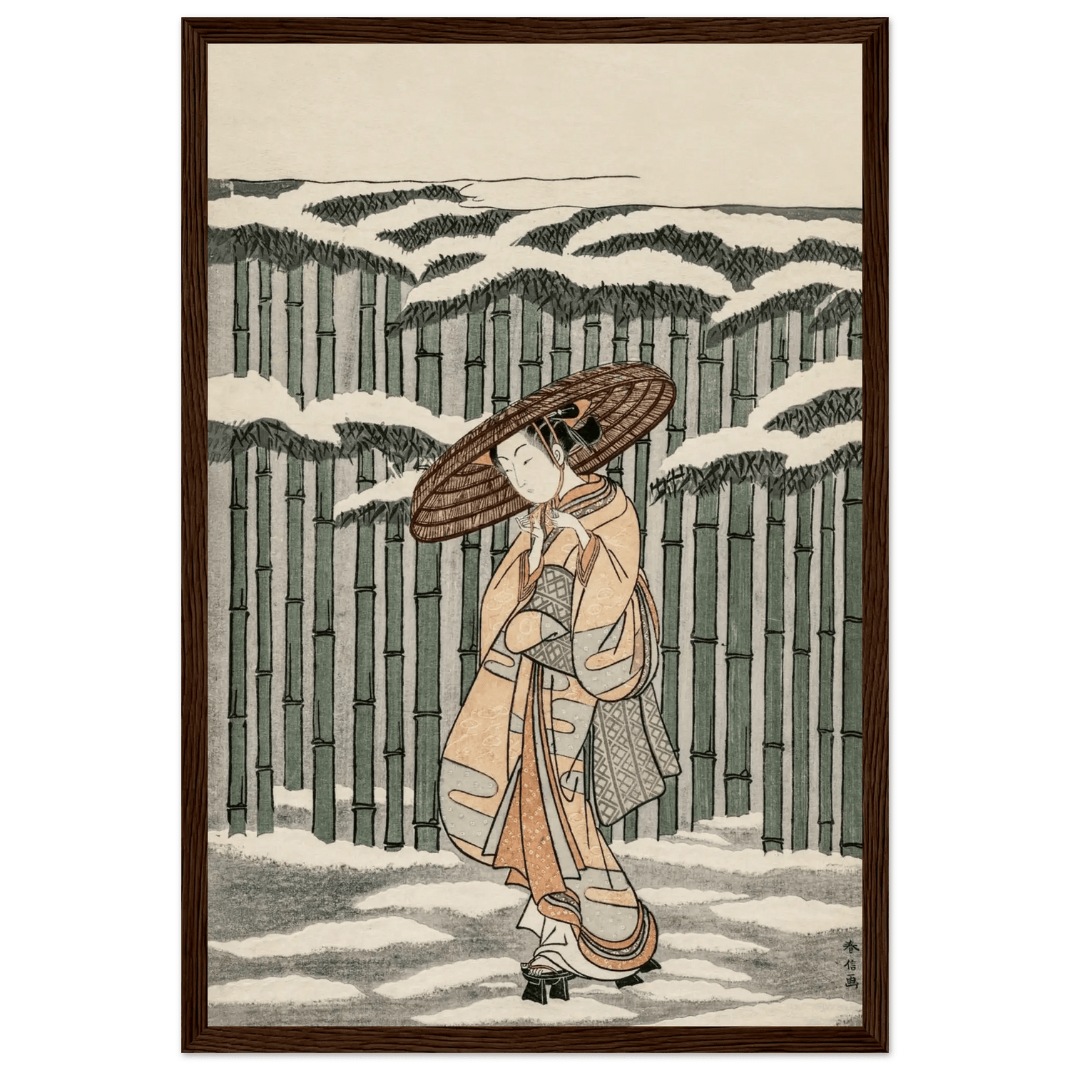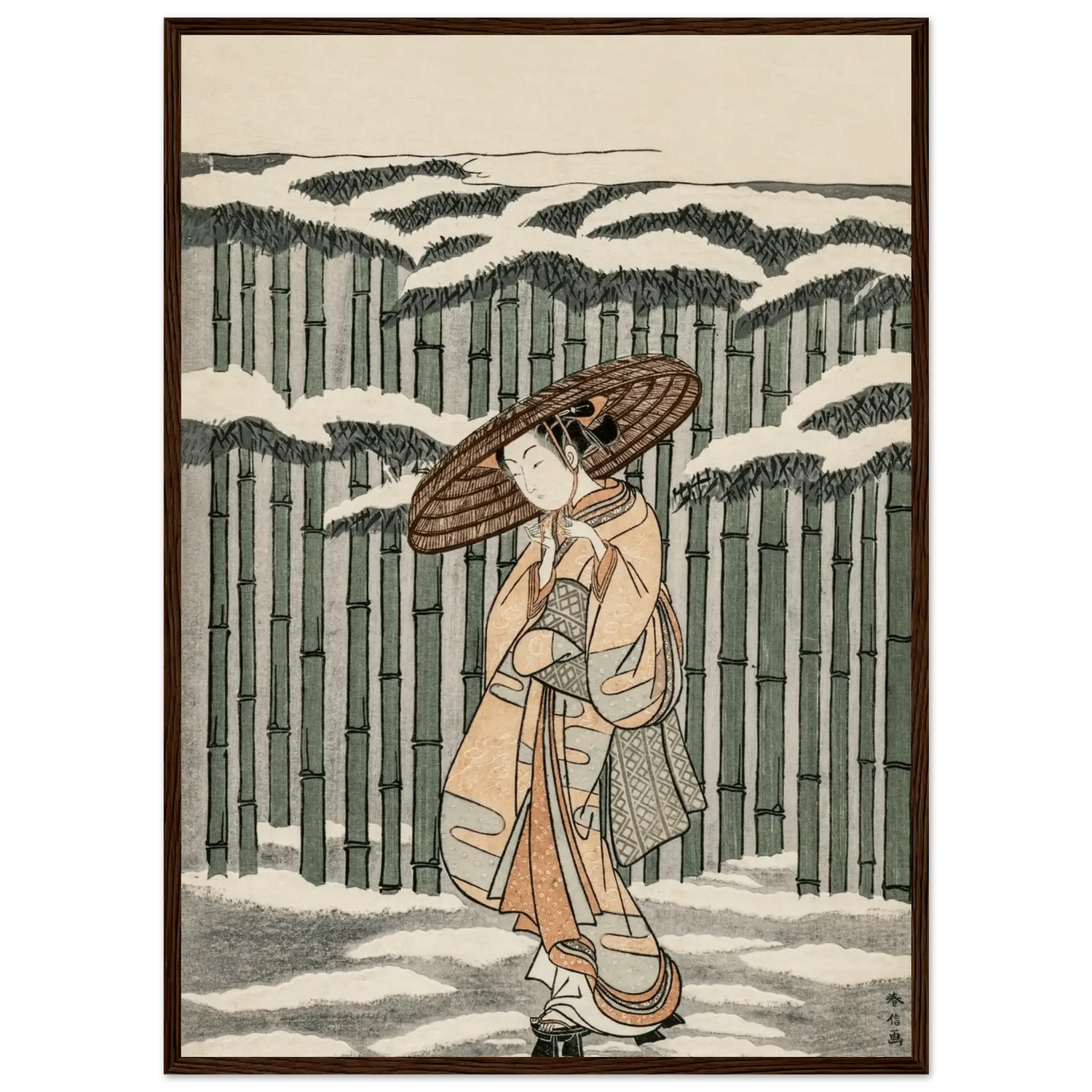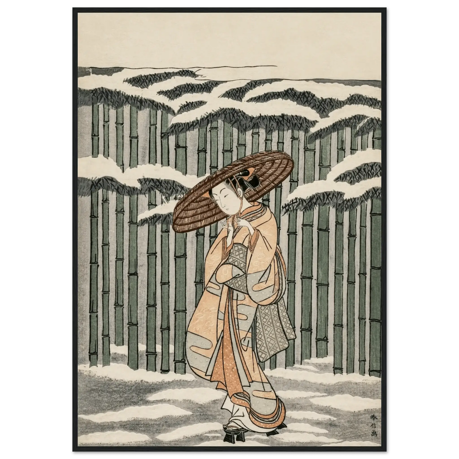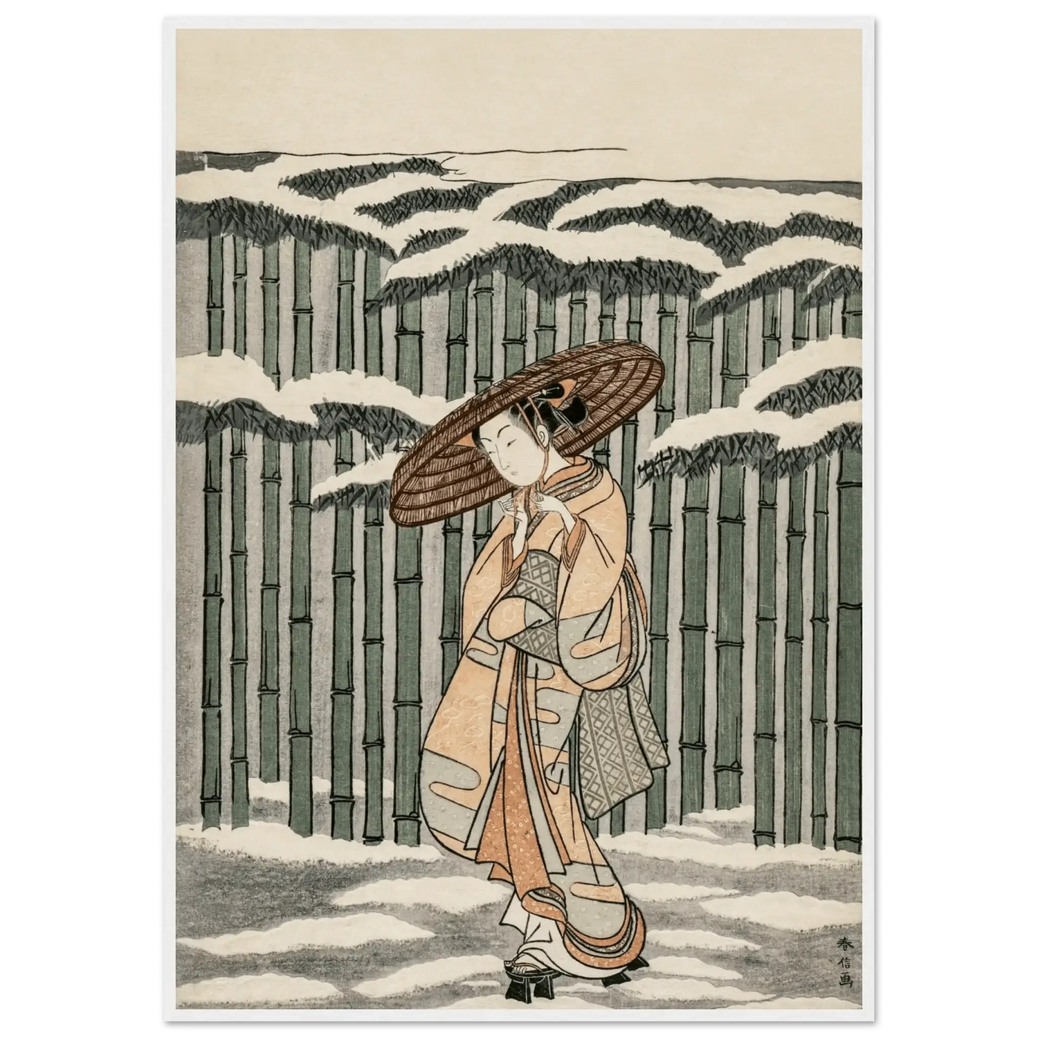 Eine junge Frau schreitet anmutig durch einen verschneiten Bambuswald. Ihr zarter Kimono in Pfirsich- und Grüntönen hebt sich sanft vom stillen Weiß des Schnees ab. Über ihr senken sich die Bambushalme, schwer von der winterlichen Last, während sie ihren Weg mit ruhiger Eleganz fortsetzt – geschützt unter einem breiten Strohhut, der sie vor der Kälte bewahrt.