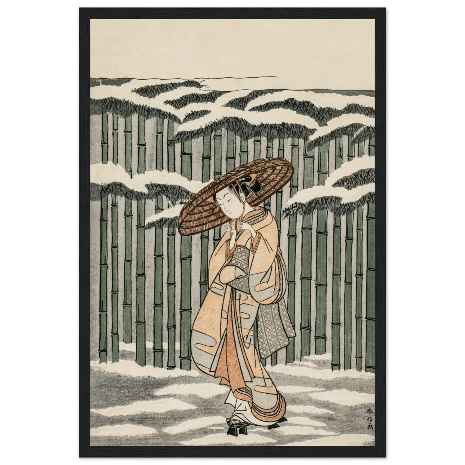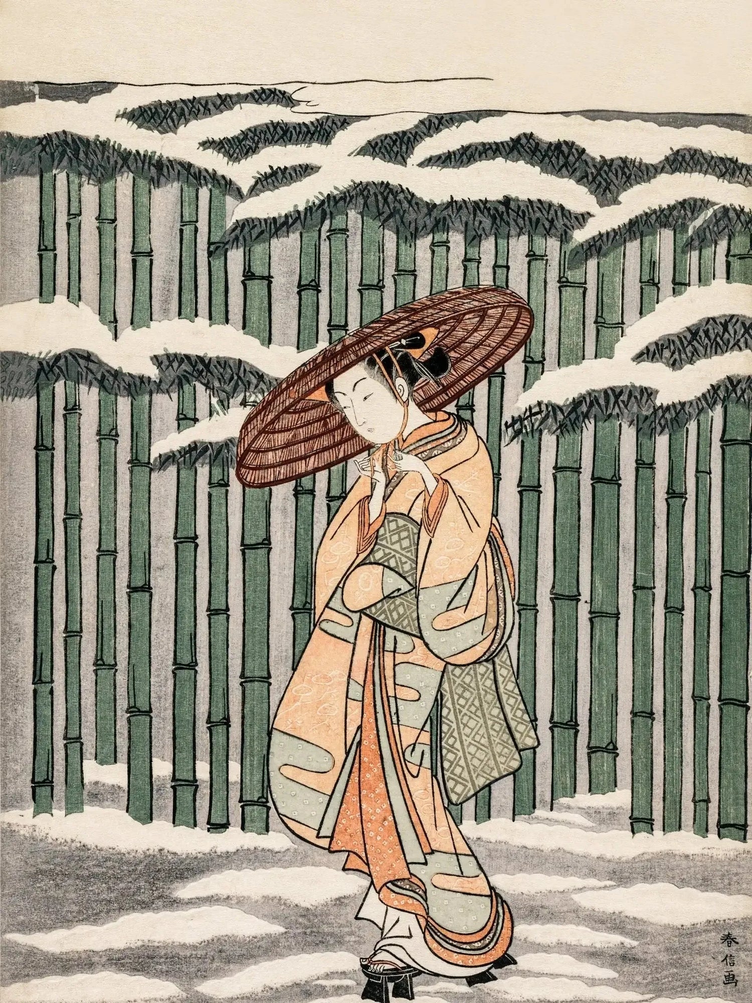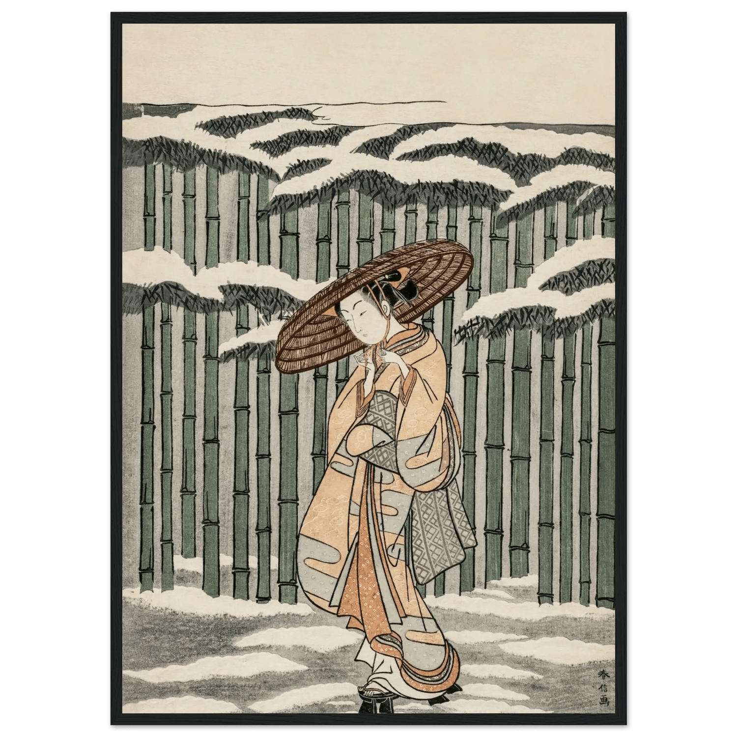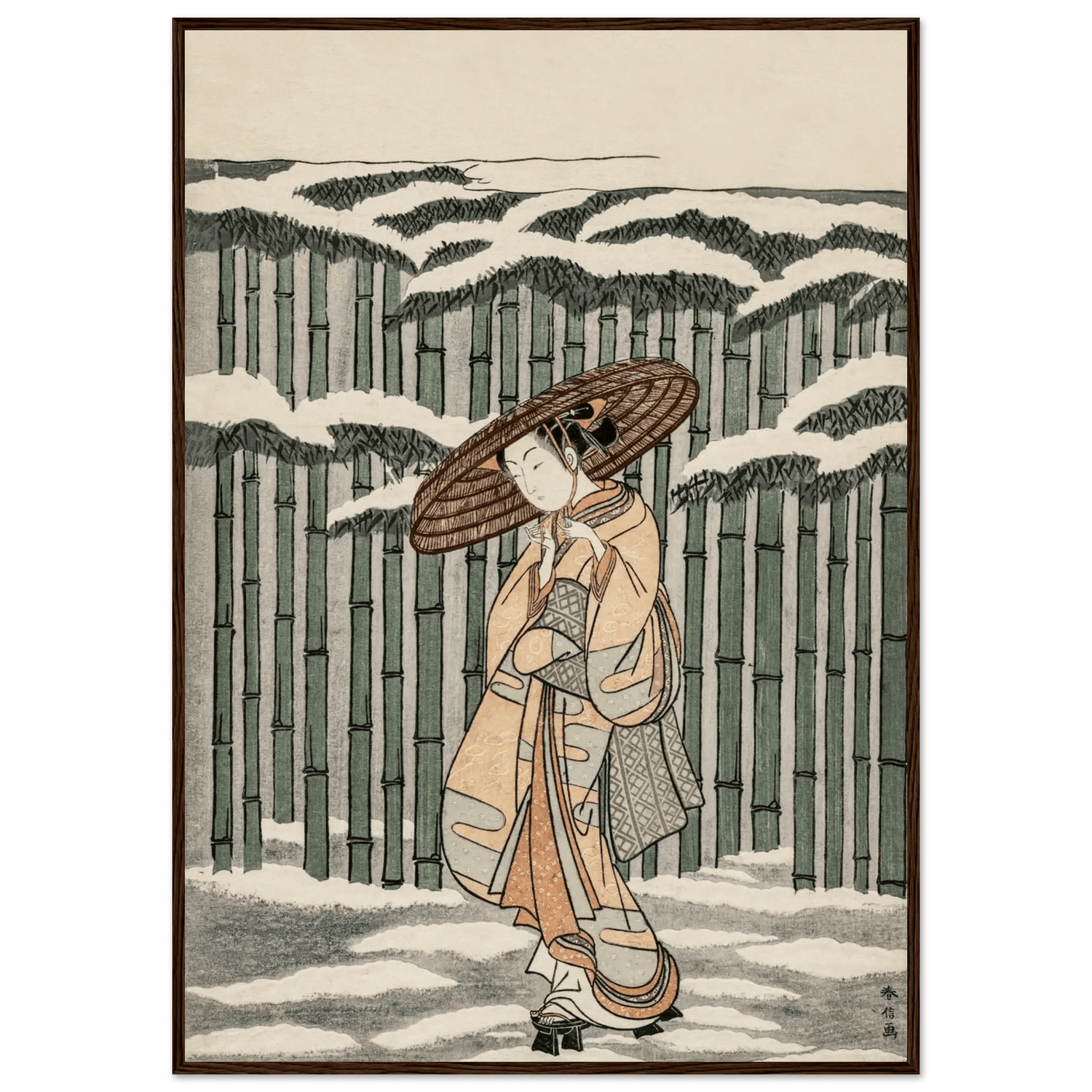 Eine junge Frau schreitet anmutig durch einen verschneiten Bambuswald. Ihr zarter Kimono in Pfirsich- und Grüntönen hebt sich sanft vom stillen Weiß des Schnees ab. Über ihr senken sich die Bambushalme, schwer von der winterlichen Last, während sie ihren Weg mit ruhiger Eleganz fortsetzt – geschützt unter einem breiten Strohhut, der sie vor der Kälte bewahrt.