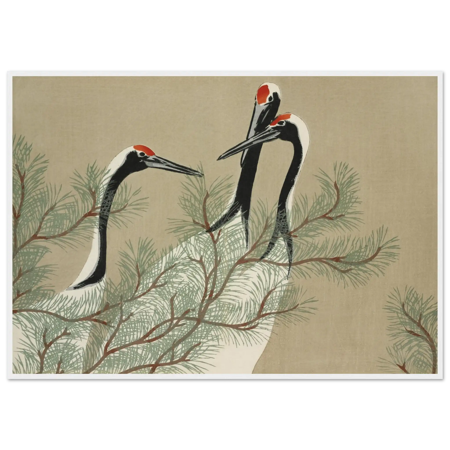 Drei Kraniche erheben ihre schlanken Hälse zwischen den weichen Nadeln einer Kiefer. Ihre Körper sind in zarten Weiß- und Schwarztönen gehalten, während leuchtendes Rot auf ihren Köpfen wie ein stilles Symbol der Lebenskraft schimmert.