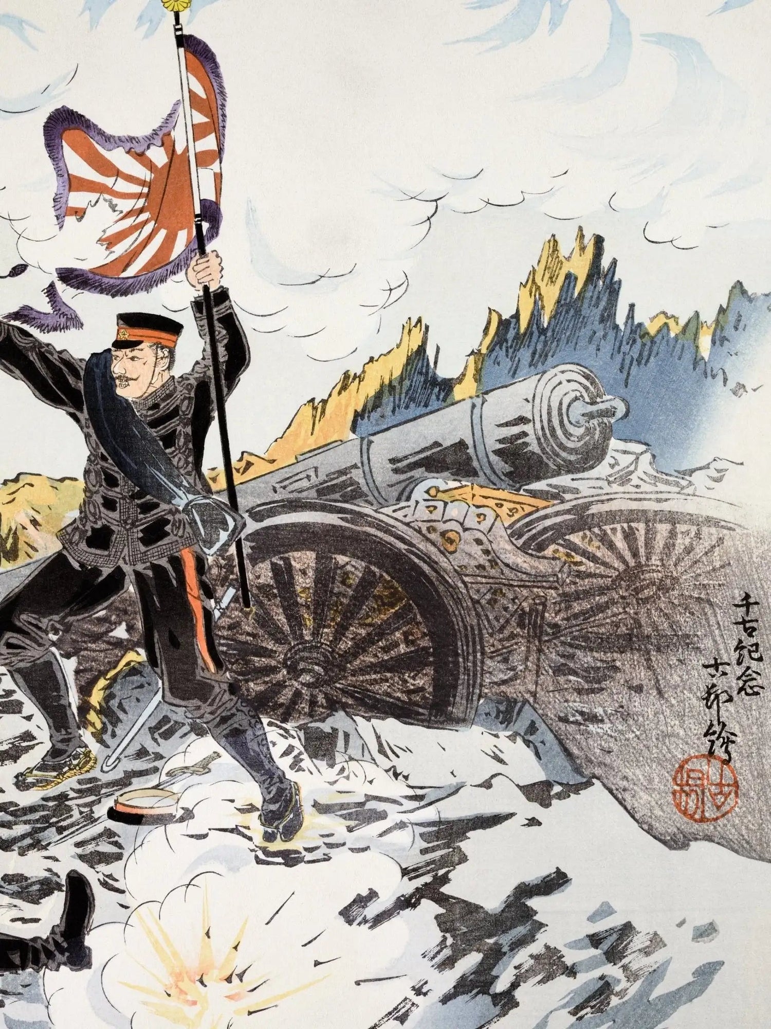 Dieses Werk entstand 1904 von Ohara Koson (1877–1945), zu einer Zeit, als Japan sich im Krieg mit Russland befand. Es gehört zu den sogenannten Senso-e – Kriegsdrucken, die patriotische Szenen in eindrucksvoller Farbigkeit festhielten.