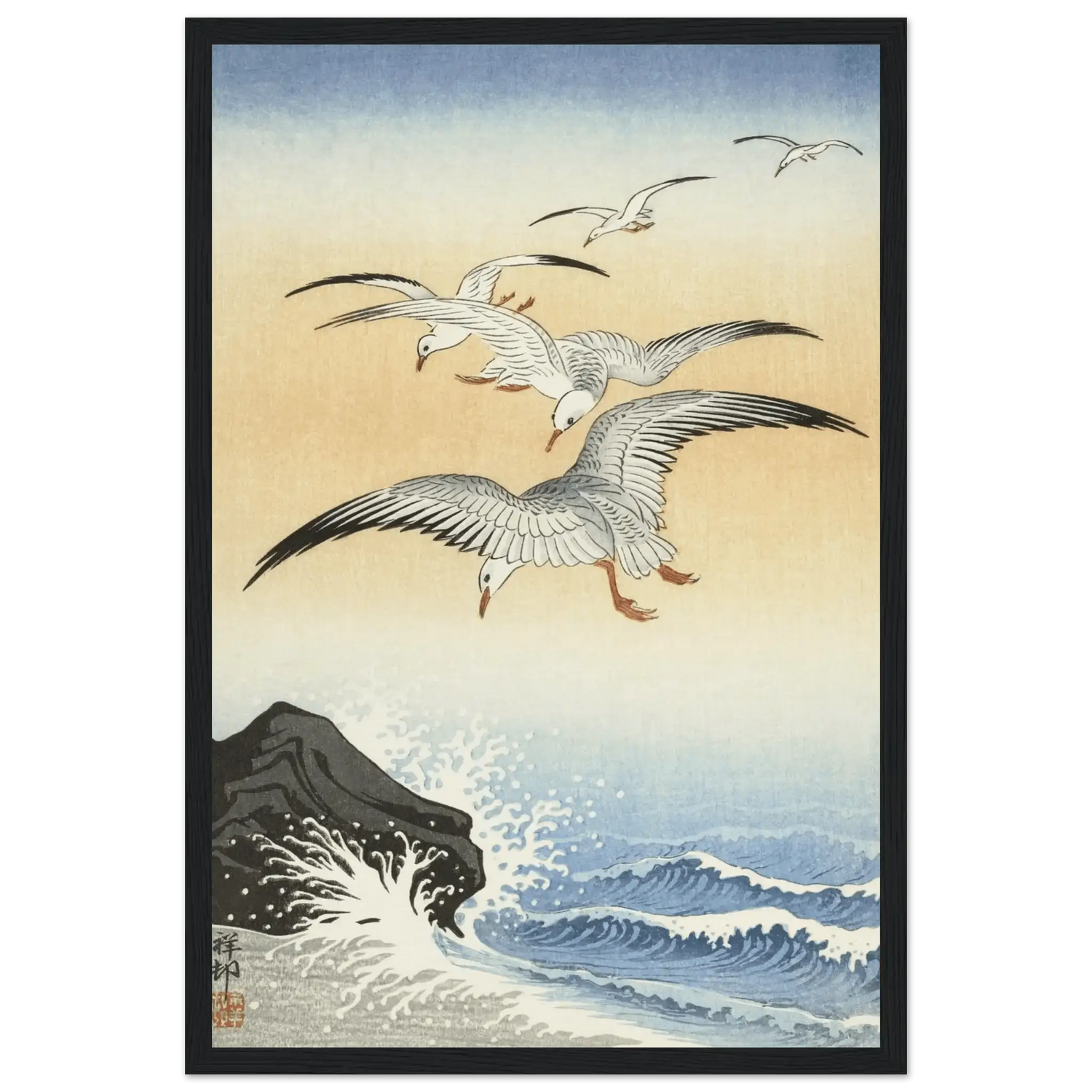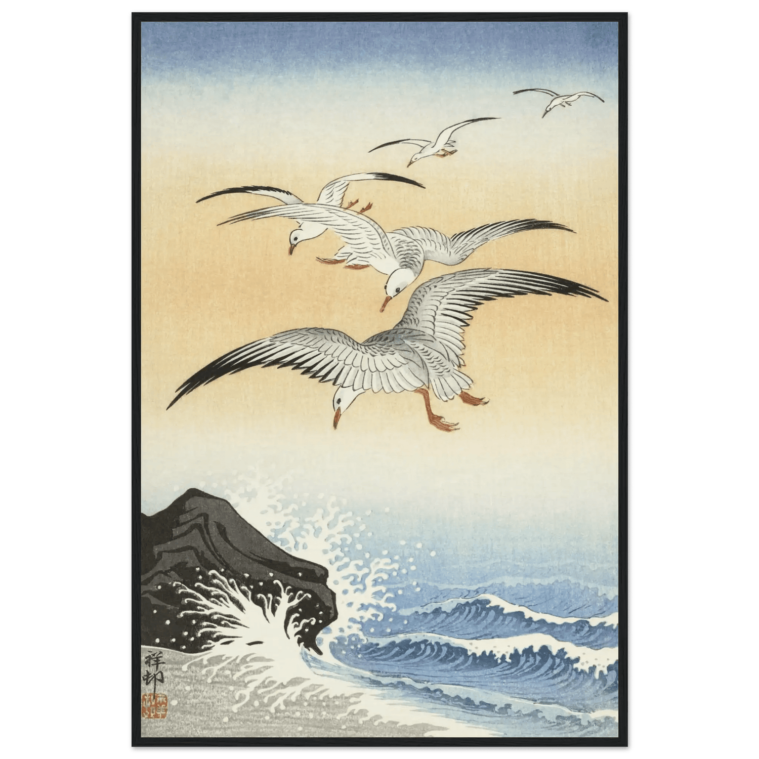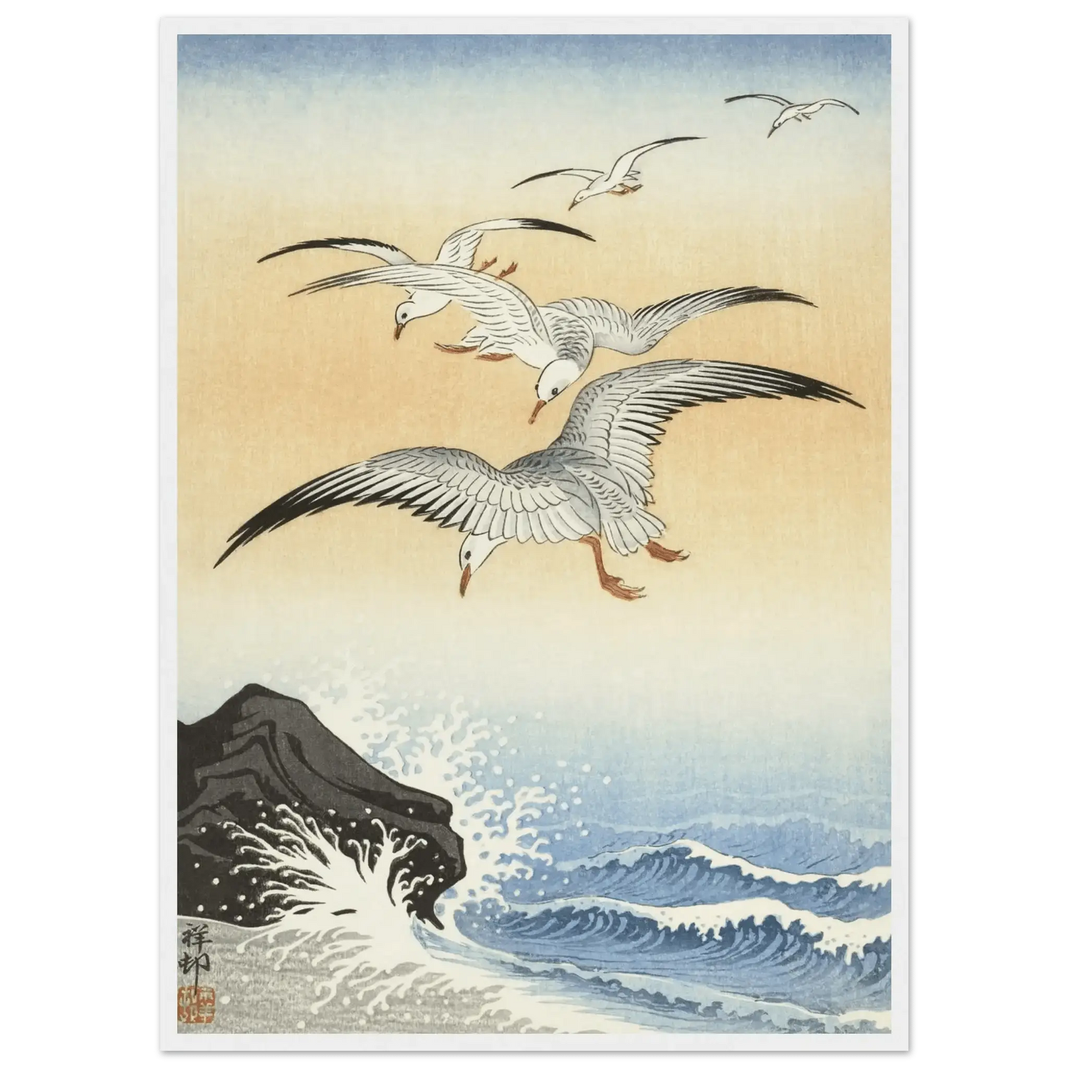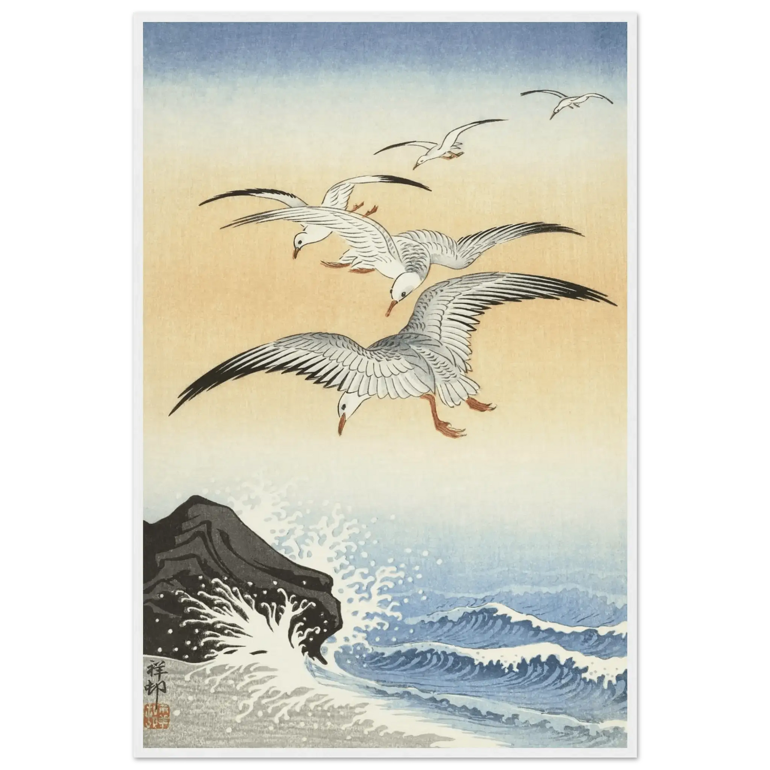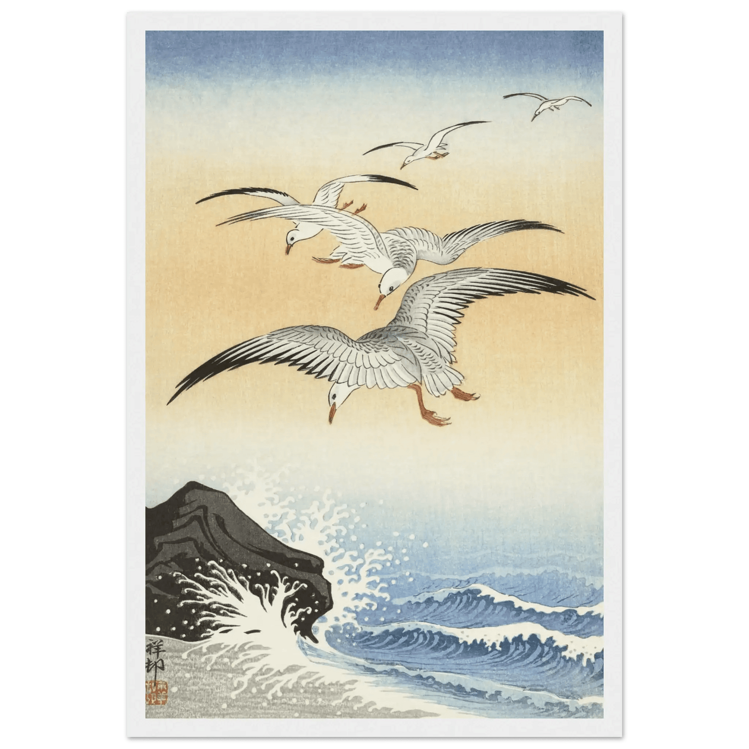 Dieses Werk stammt von Ohara Koson (1877–1945), dem Meister der Shin Hanga-Bewegung. In „Möwen über stürmischem Meer“ verbindet Koson die Kraft des Ozeans mit der Leichtigkeit des Fliegens.
