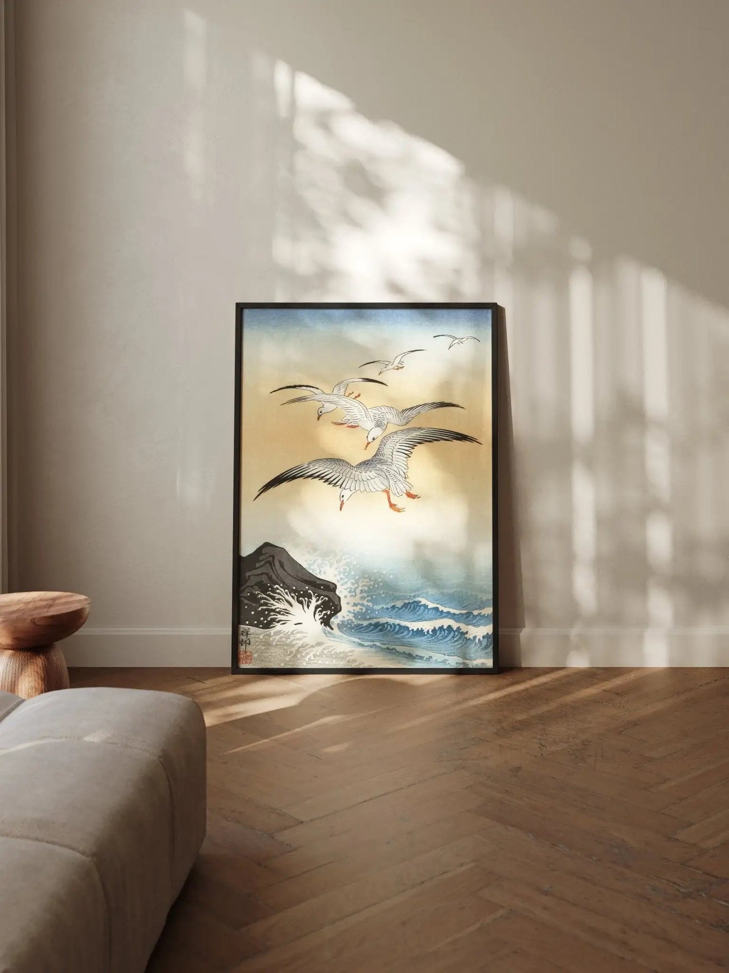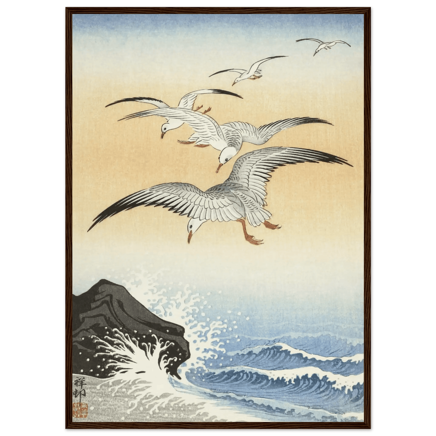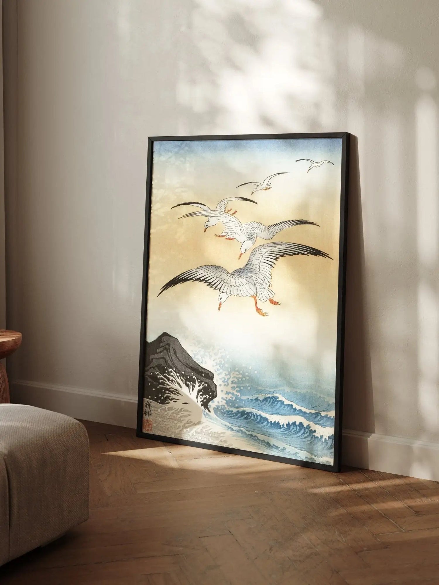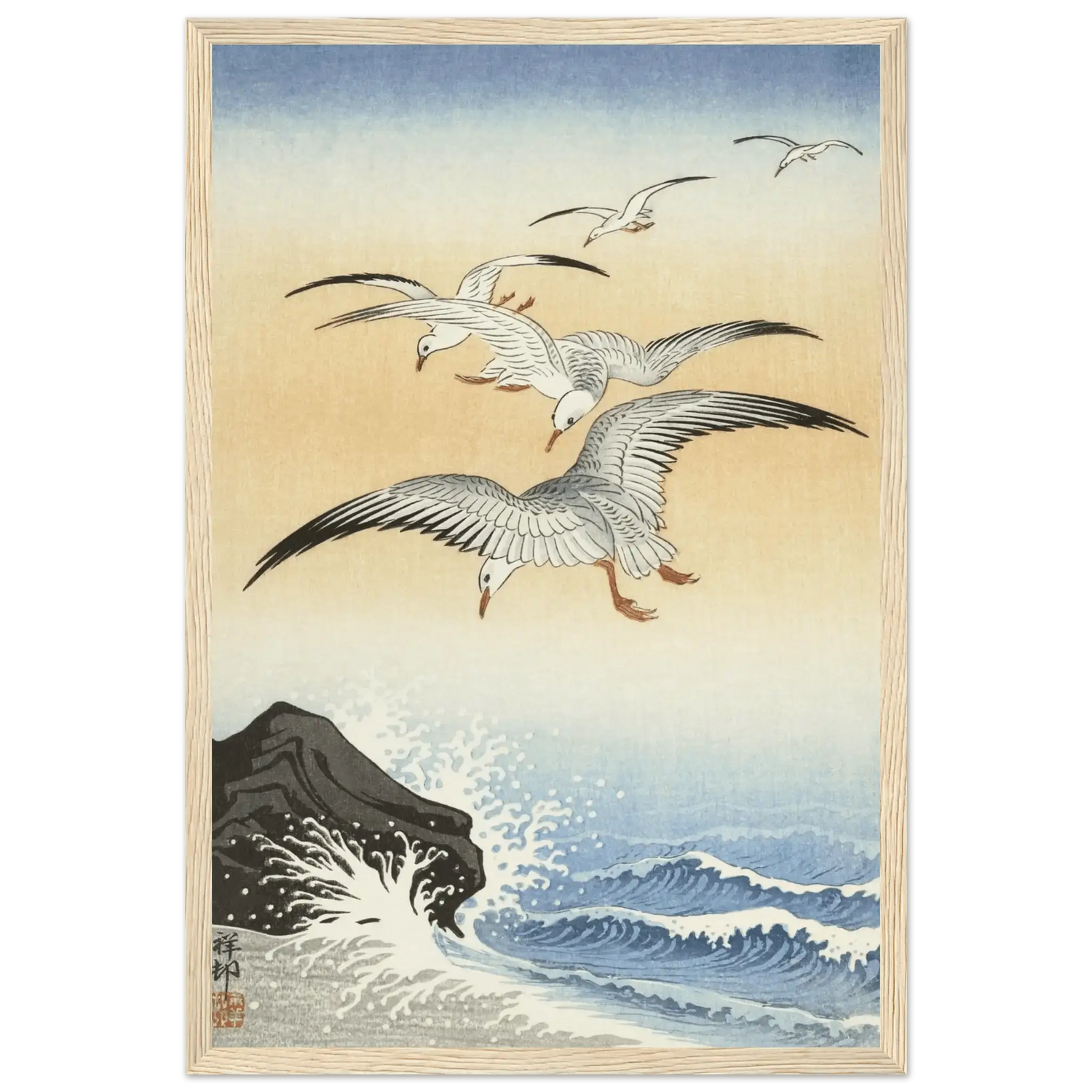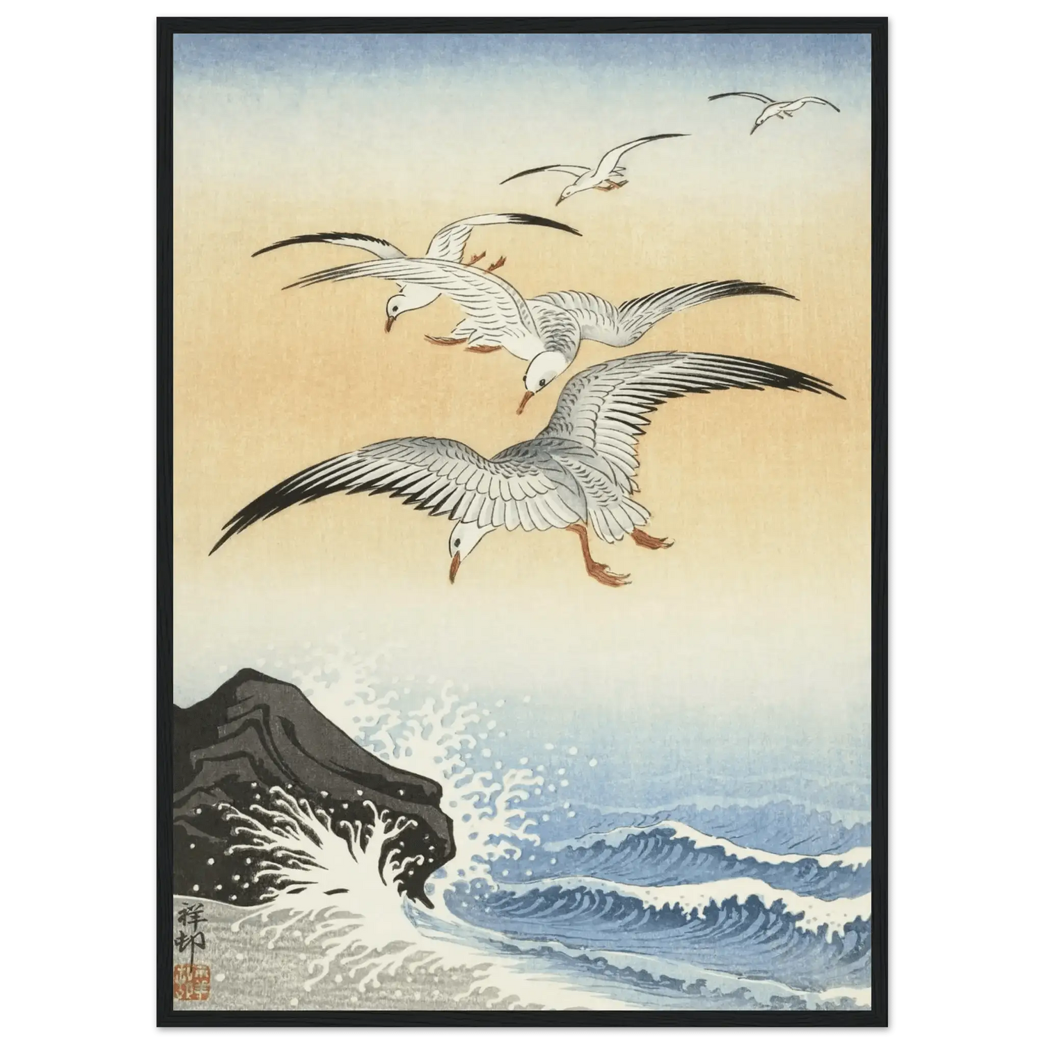 Dieses Werk stammt von Ohara Koson (1877–1945), dem Meister der Shin Hanga-Bewegung. In „Möwen über stürmischem Meer“ verbindet Koson die Kraft des Ozeans mit der Leichtigkeit des Fliegens.