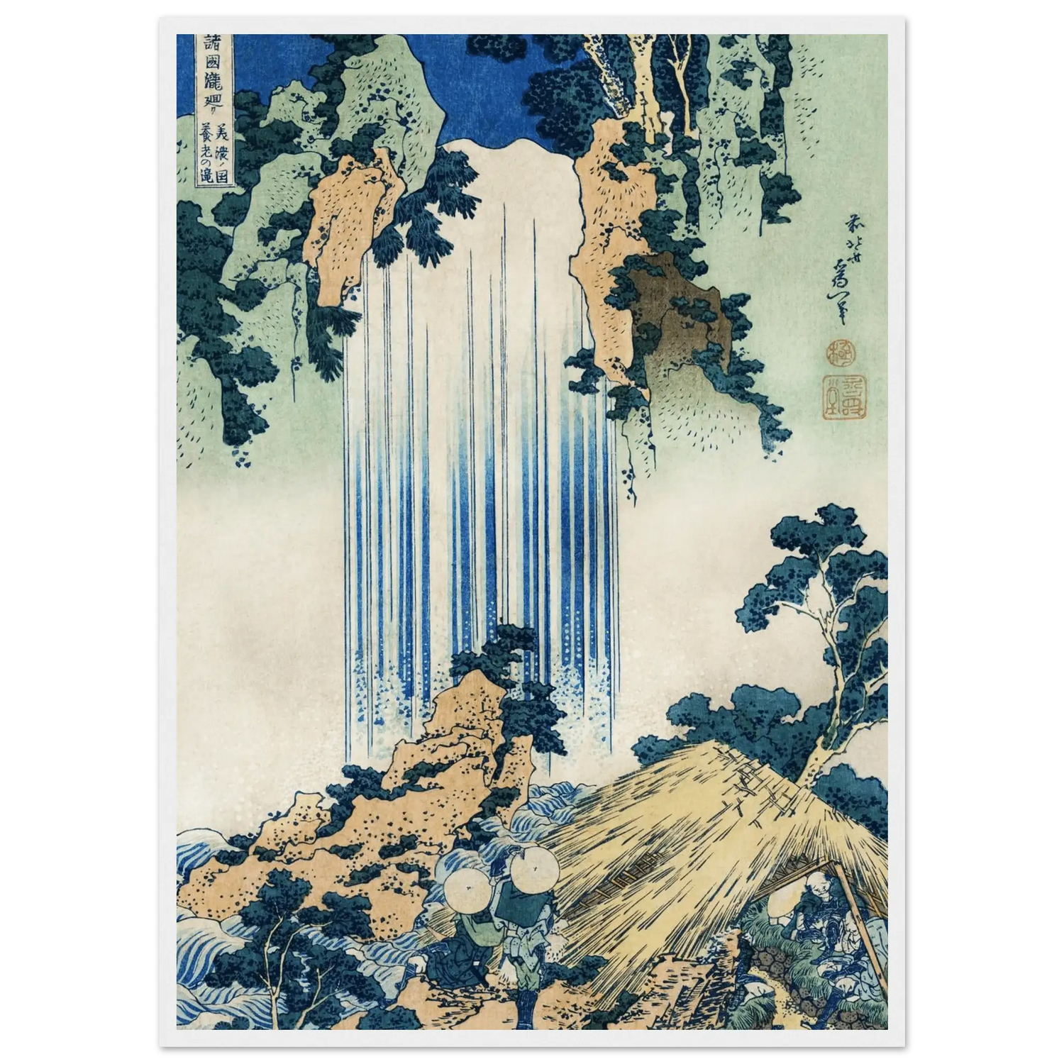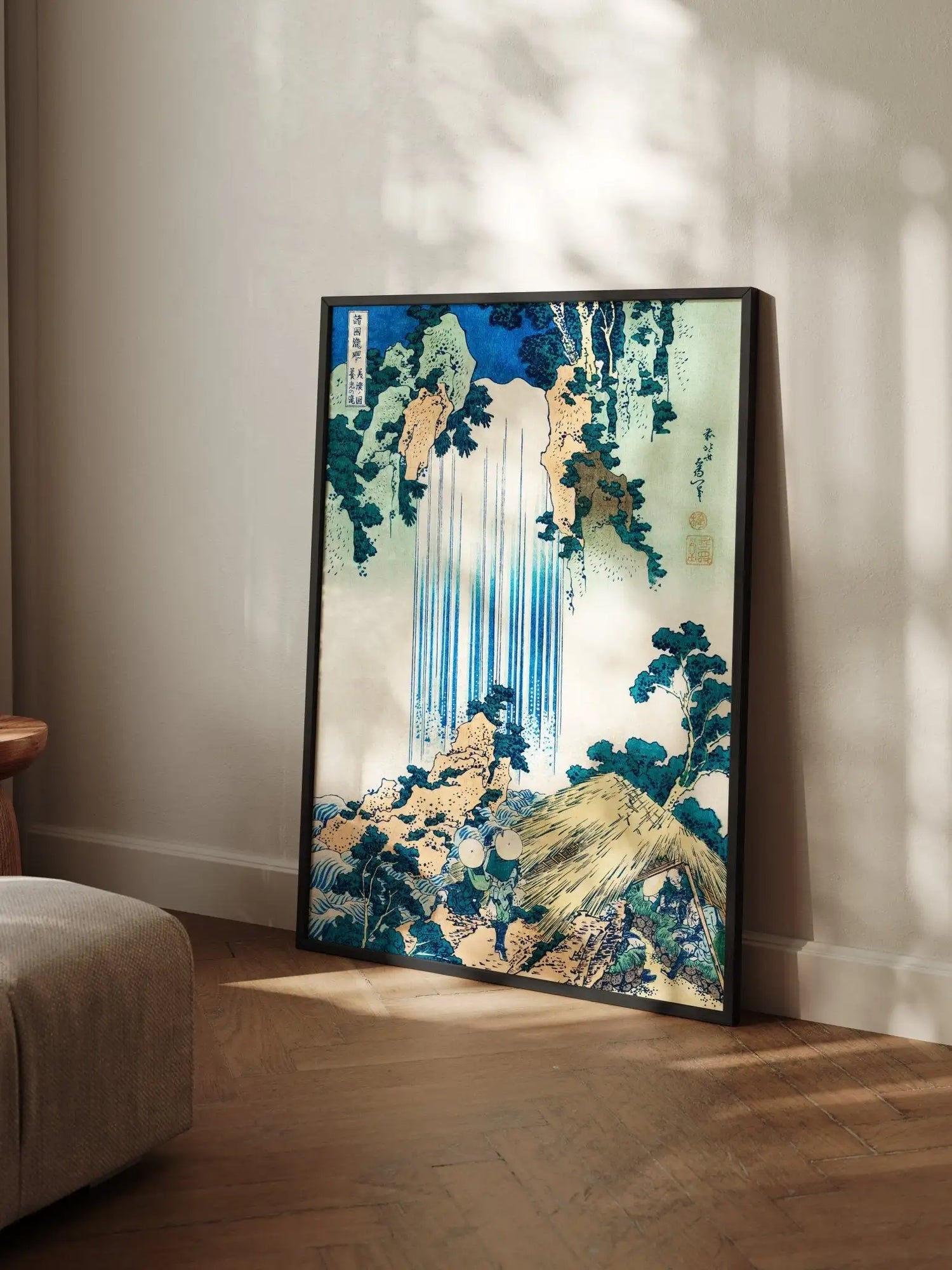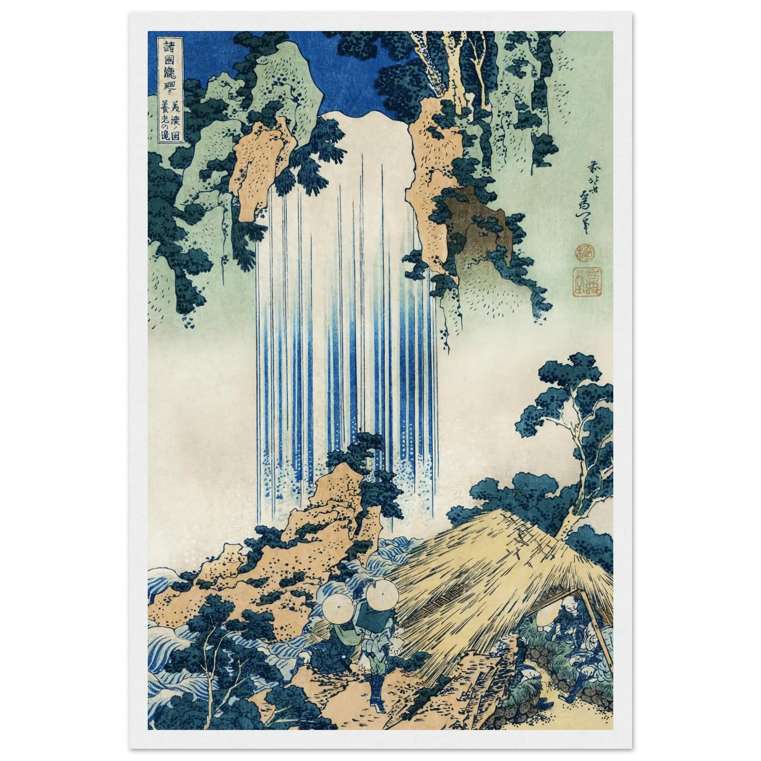 In „Yōrō-Wasserfall in Mino“ fängt er das Zusammenspiel zwischen Mensch und Natur in vollendeter Harmonie ein. Die senkrechten Linien des Wassers symbolisieren Reinheit und Beständigkeit, während die Landschaft durch die typisch tiefen Blautöne seiner aizuri-e-Technik lebendig wirkt.