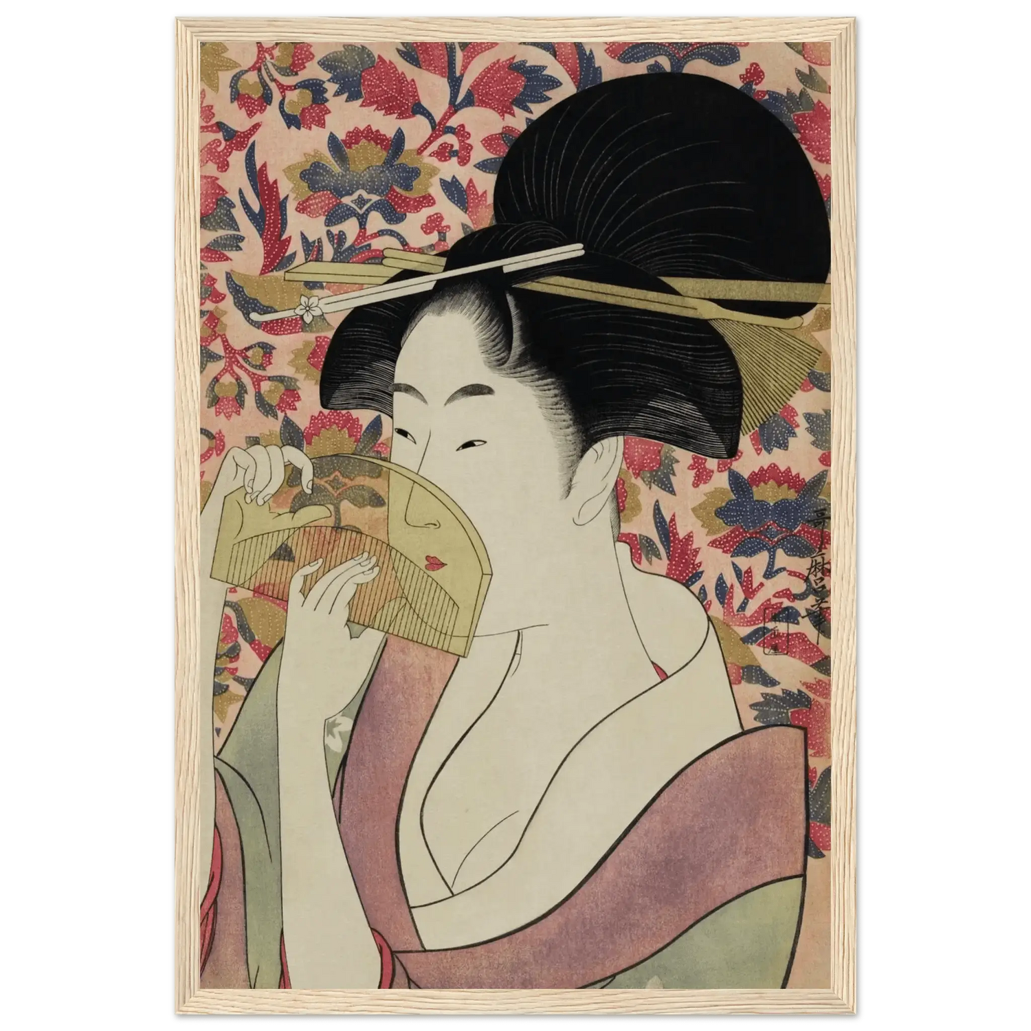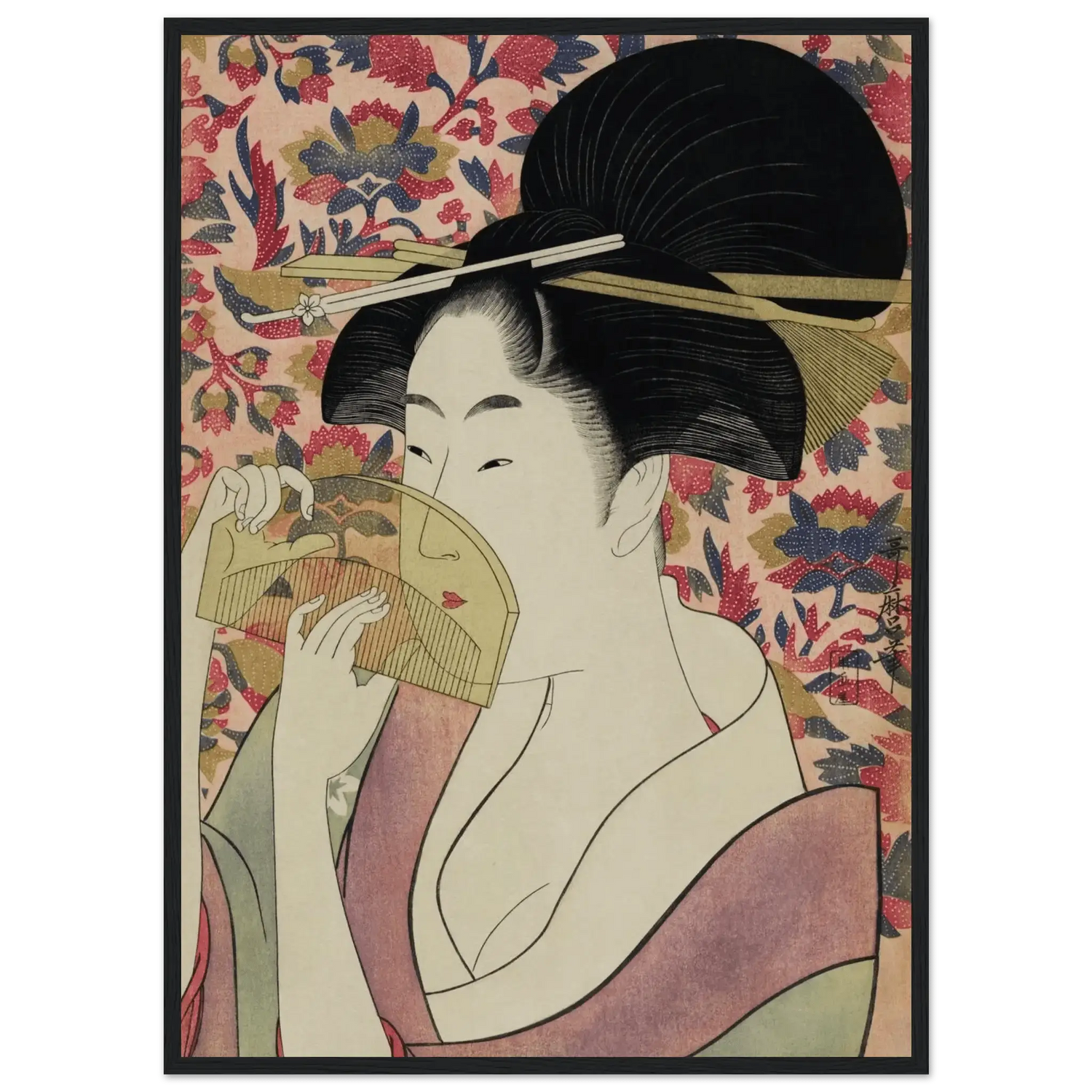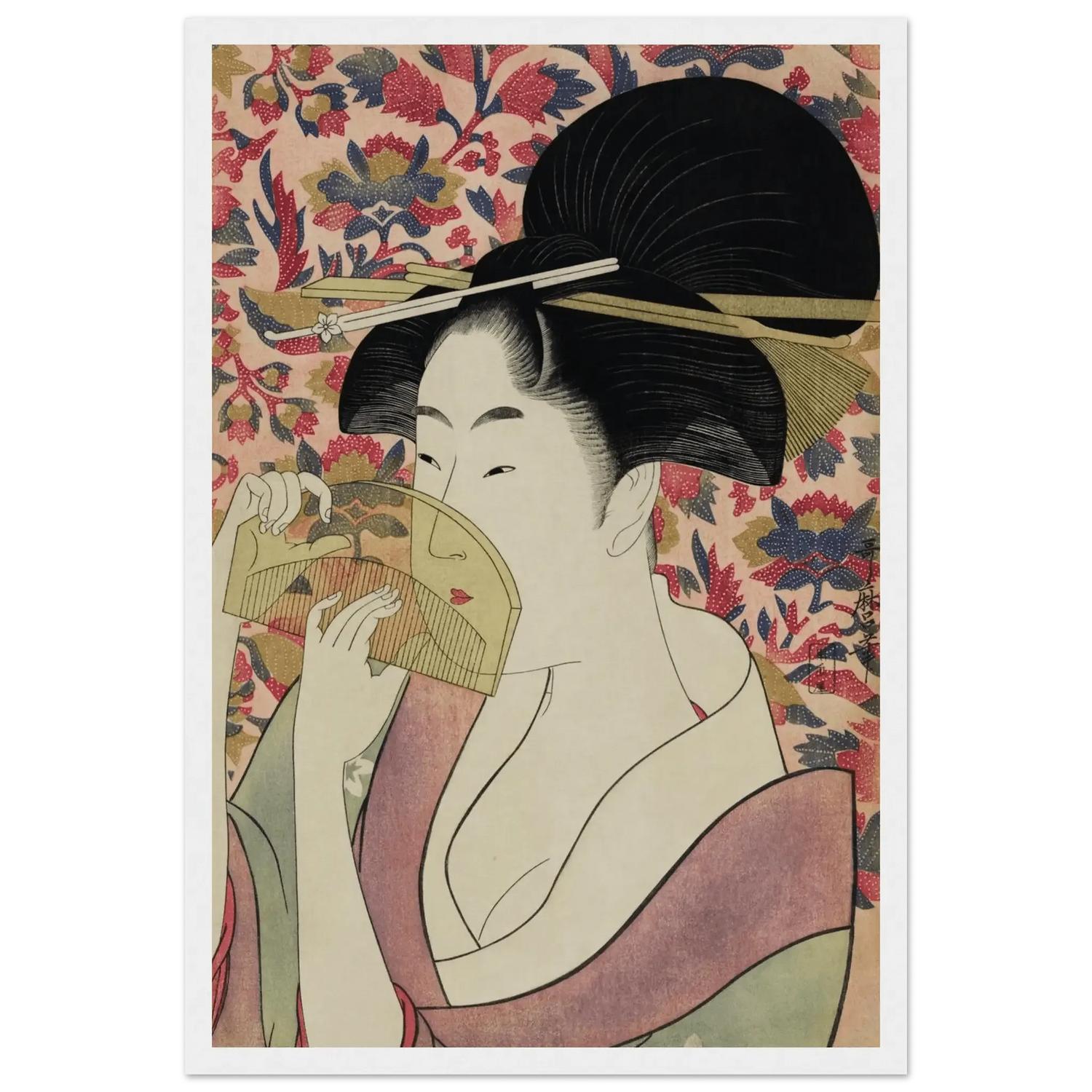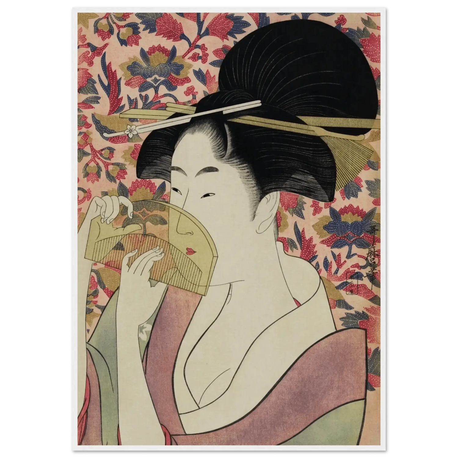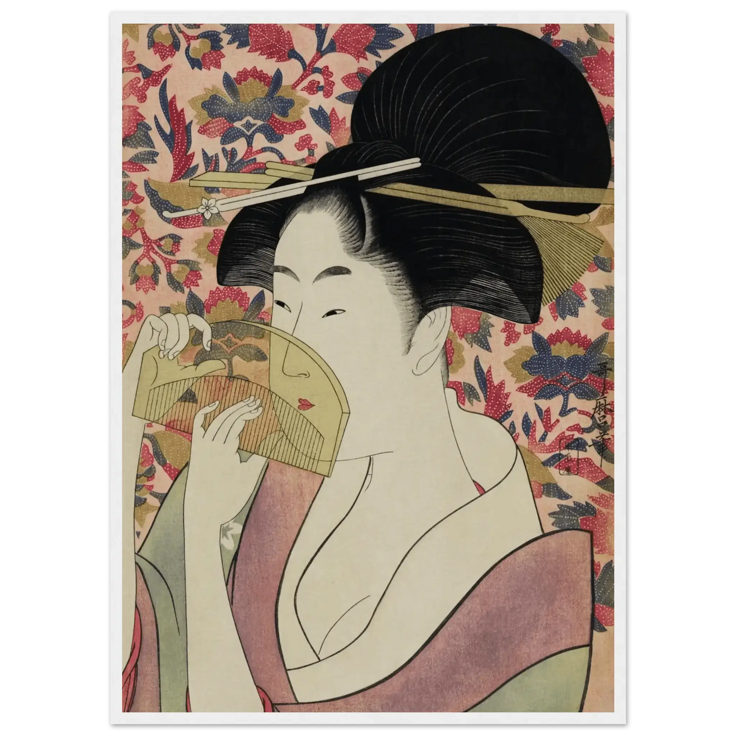 Mit außergewöhnlicher Feinheit in Linien und Farbe schuf Utamaro ein zeitloses Porträt der weiblichen Anmut. Jede Bewegung, jeder Schatten wirkt bewusst gesetzt und verleiht der Szene ein Gefühl leiser Intimität.