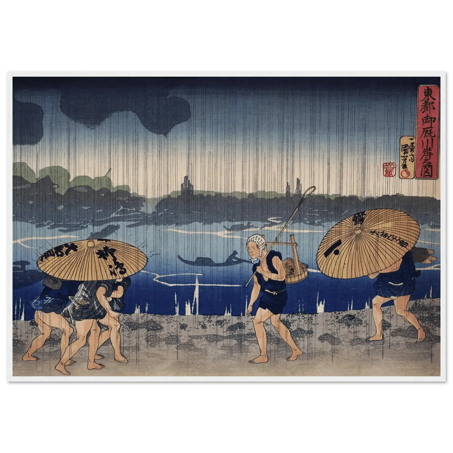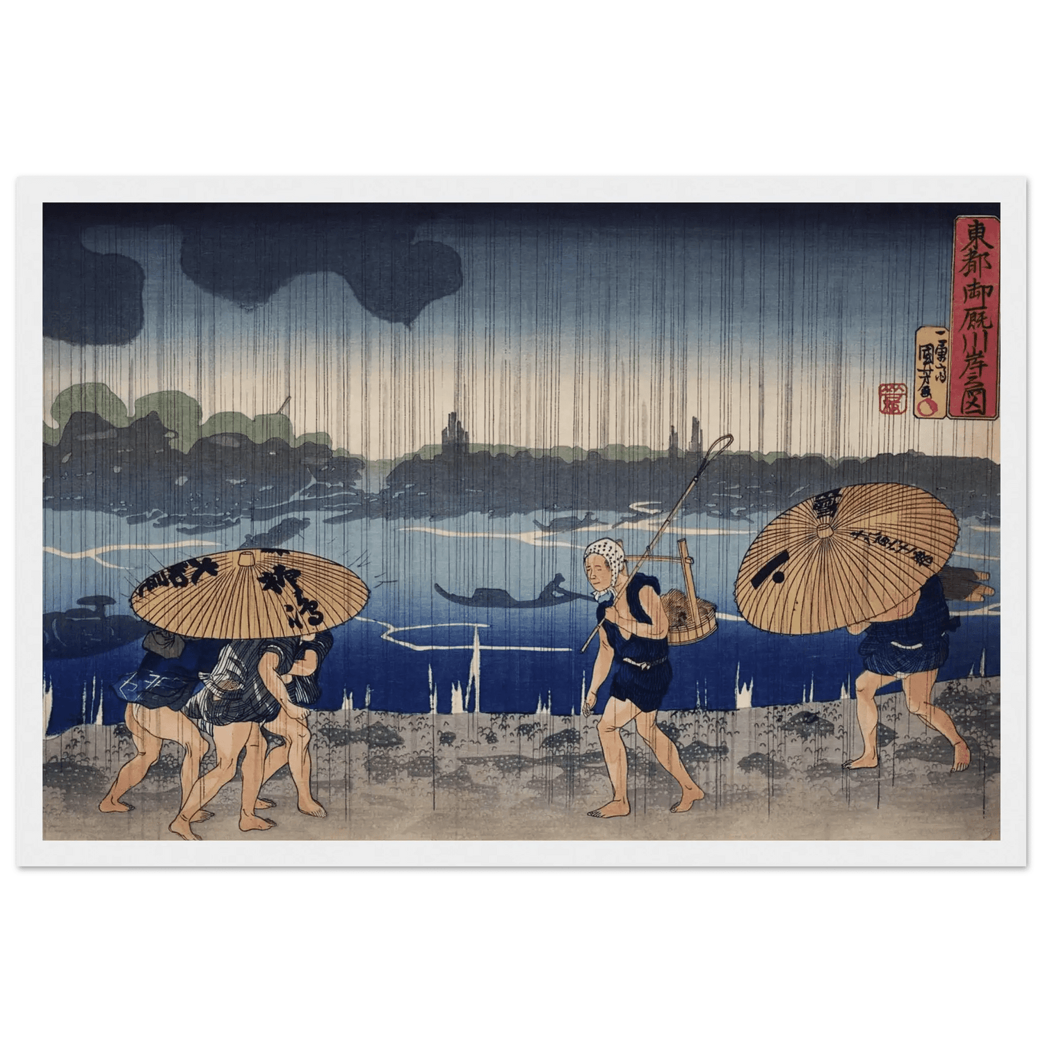 Dieses Werk von Utagawa Kuniyoshi (1798–1861) zeigt die Schönheit des Flüchtigen, die Stille im Regen, das Zusammenwirken von Mensch und Natur.