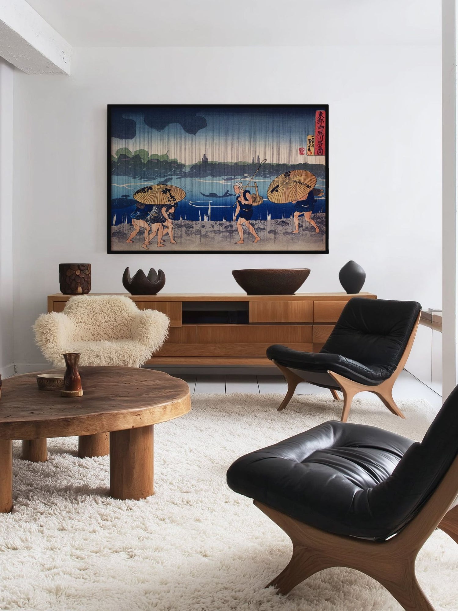 Ein Werk japanischer Meisterkunst – vollendet in Form und Proportion. Der präzise Kiefernholzrahmen verleiht dem Motiv architektonische Klarheit und verankert es im Raum. Eine Ausführung mit Haltung.