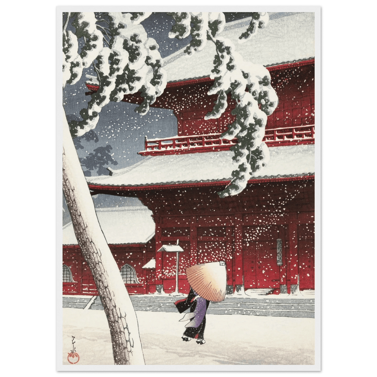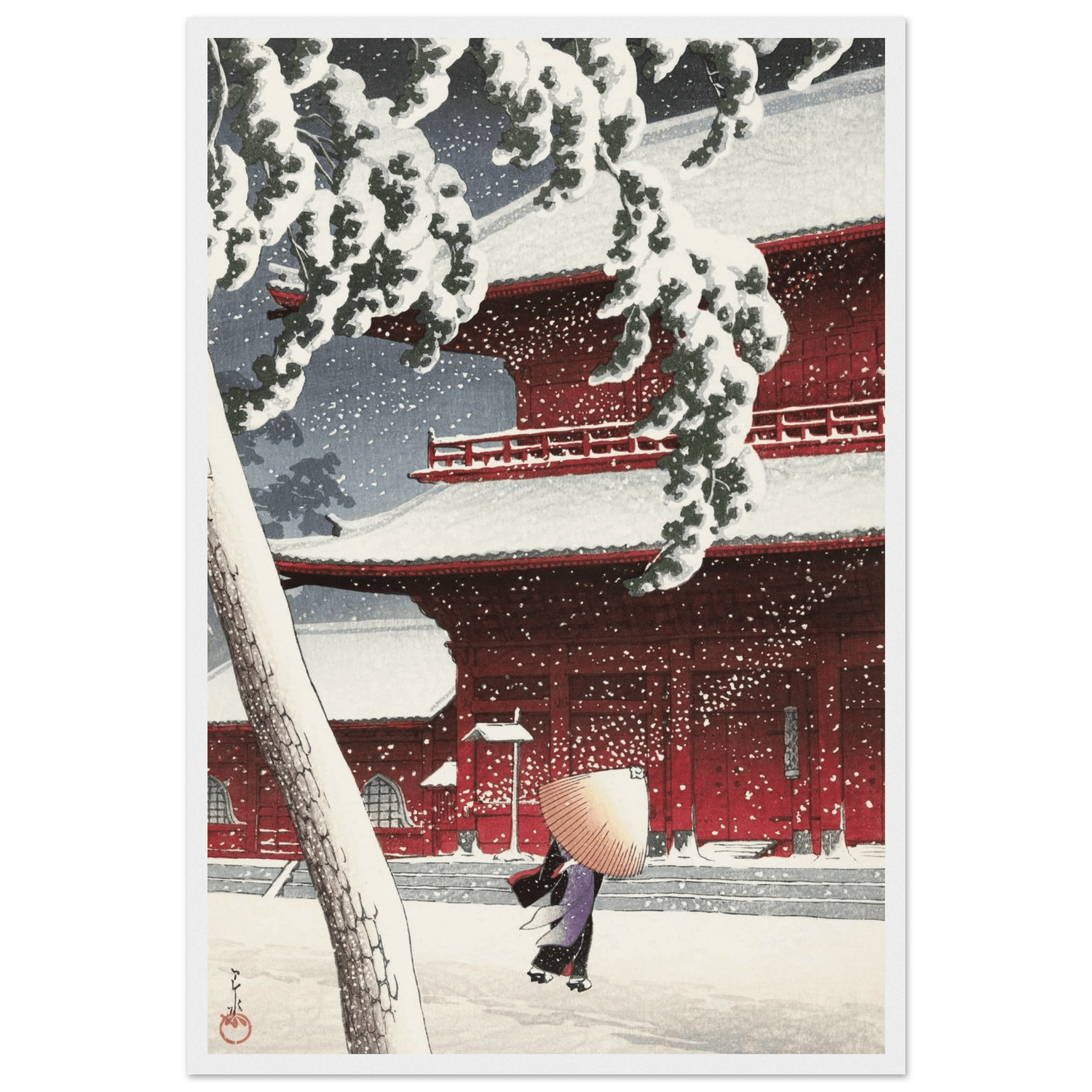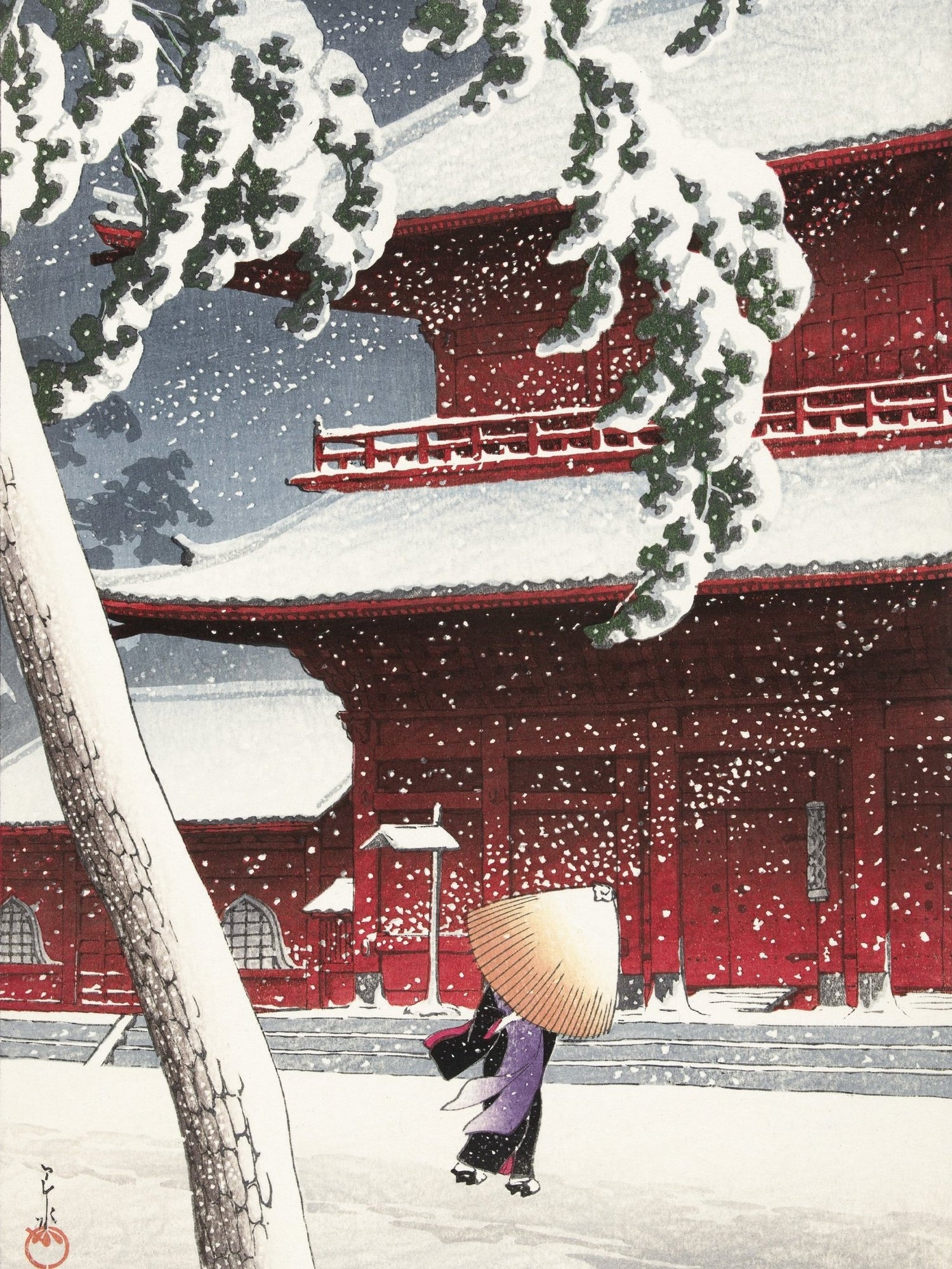 Leise fällt der Schnee auf die roten Tempelwände des Zojoji-Schreins in Tokio. Eine einsame Gestalt mit Strohhut schreitet über den stillen Hof, während dichte Flocken den Himmel füllen. Künstler: Kawase Hasui (川瀬 巴水, 1883–1957) — veröffentlicht von Watanabe Shōzaburō. Hasui zeigt meisterhaft das Zusammenspiel von Licht, Farbe und Stille; das kräftige Rot des Tempels kontrastiert mit dem reinen Weiß des Schnees und verdichtet den Moment zu poetischer Ruhe.