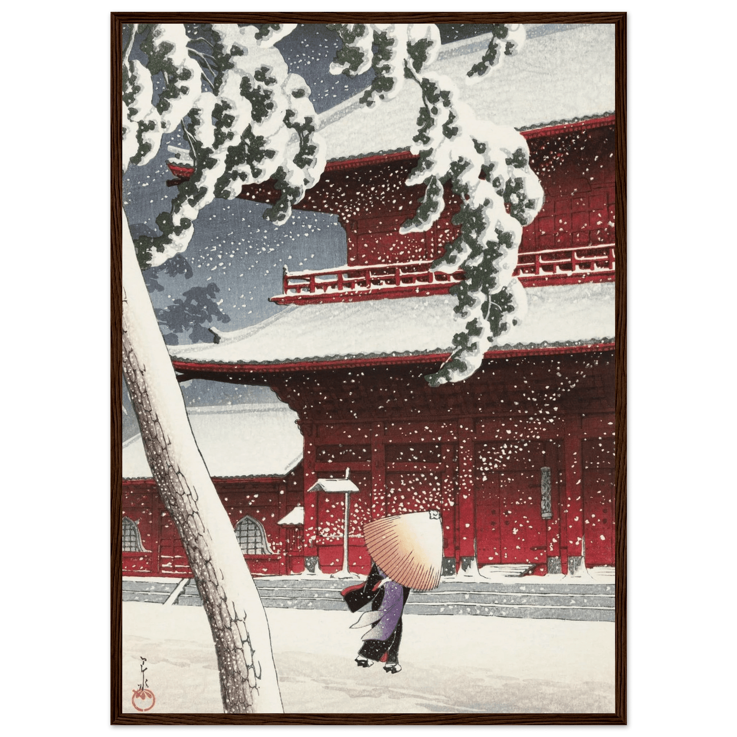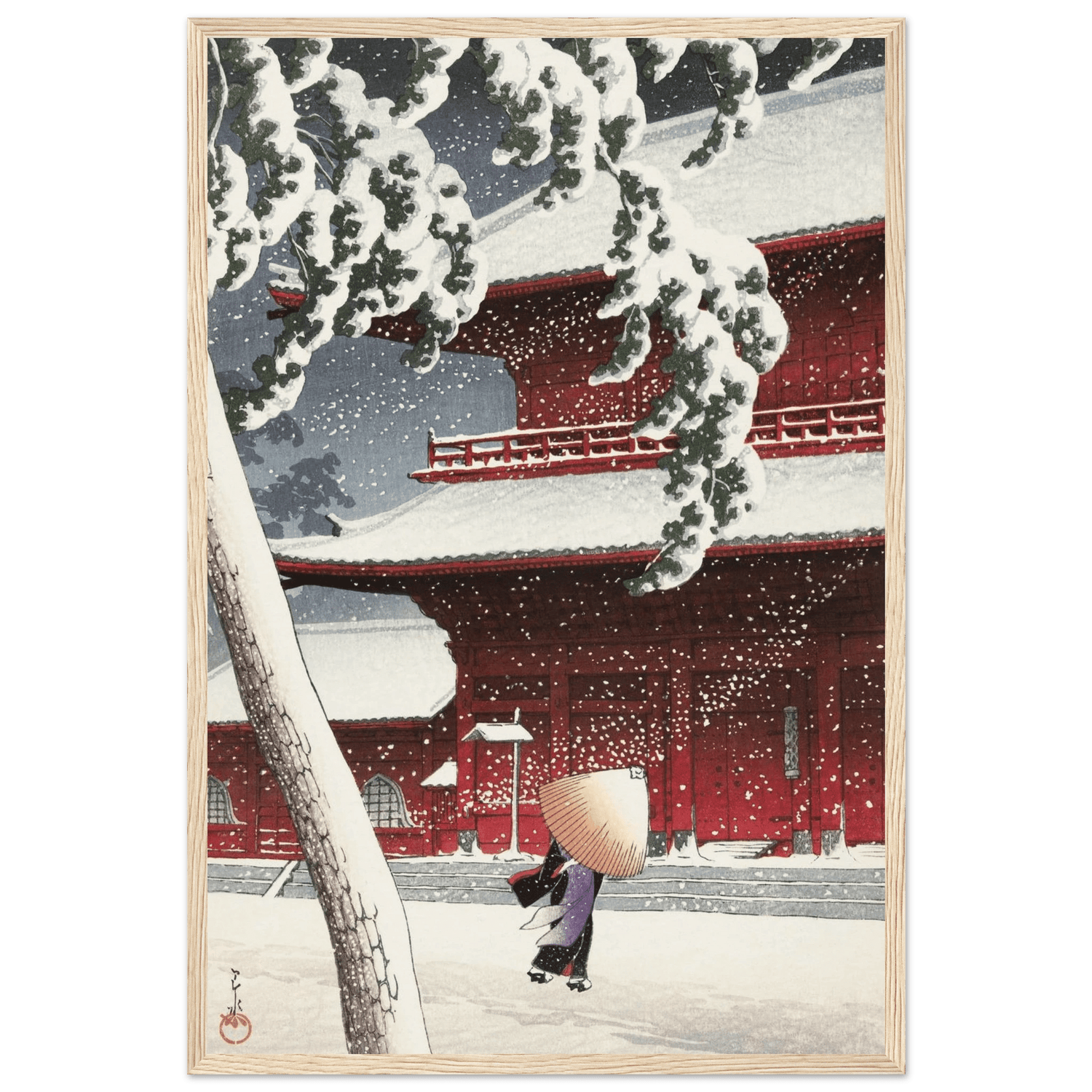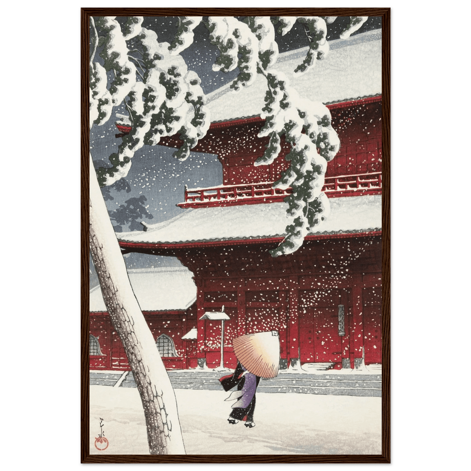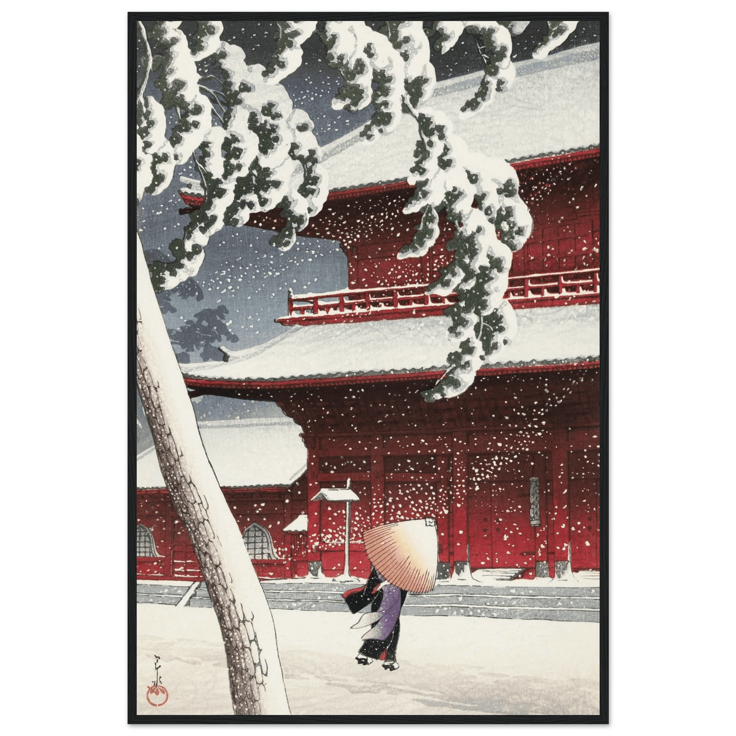 Leise fällt der Schnee auf die roten Tempelwände des Zojoji-Schreins in Tokio. Eine einsame Gestalt mit Strohhut schreitet über den stillen Hof, während dichte Flocken den Himmel füllen. Künstler: Kawase Hasui (川瀬 巴水, 1883–1957) — veröffentlicht von Watanabe Shōzaburō. Hasui zeigt meisterhaft das Zusammenspiel von Licht, Farbe und Stille; das kräftige Rot des Tempels kontrastiert mit dem reinen Weiß des Schnees und verdichtet den Moment zu poetischer Ruhe.