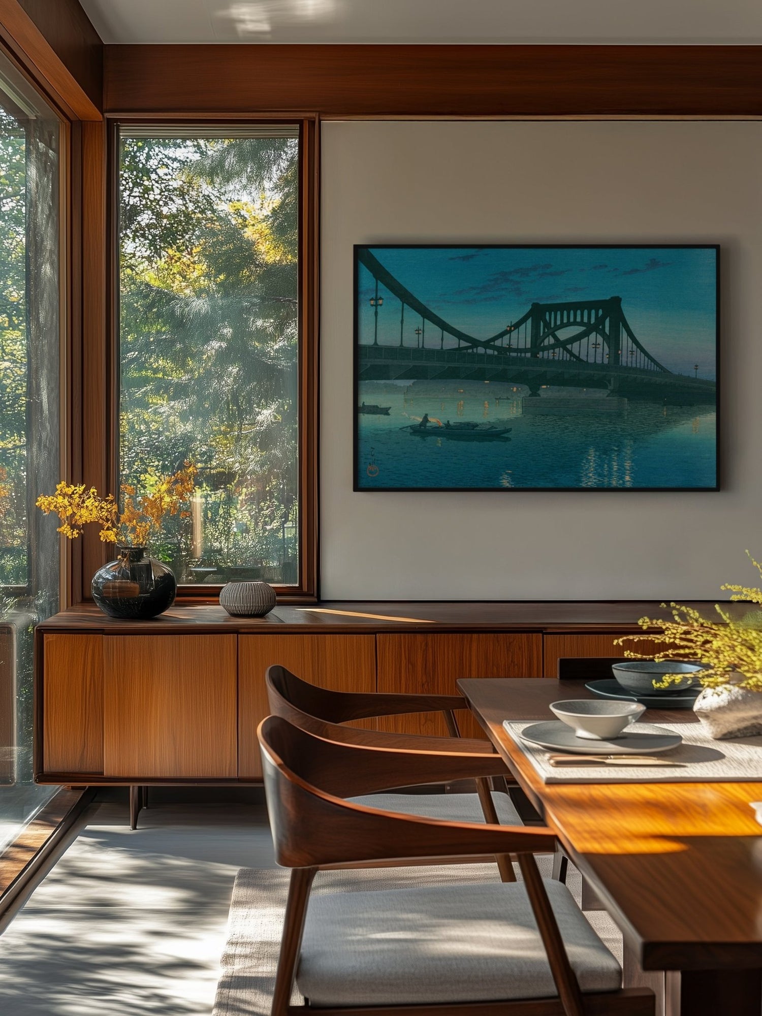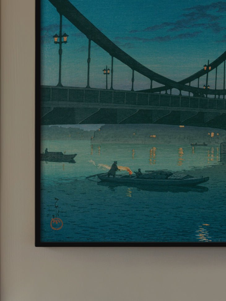 Das kühle Abendlicht spiegelt sich im Wasser des Sumida-Flusses, während die Brücke von Kiyosu in sanften Blautönen erstrahlt. Laternen glühen wie ferne Sterne, und ein Boot gleitet lautlos unter dem Stahlbogen hindurch. Kawase Hasui verbindet in dieser Szene moderne Architektur und poetische Stille – ein Sinnbild des Tokios der 1930er Jahre zwischen Tradition und Aufbruch.