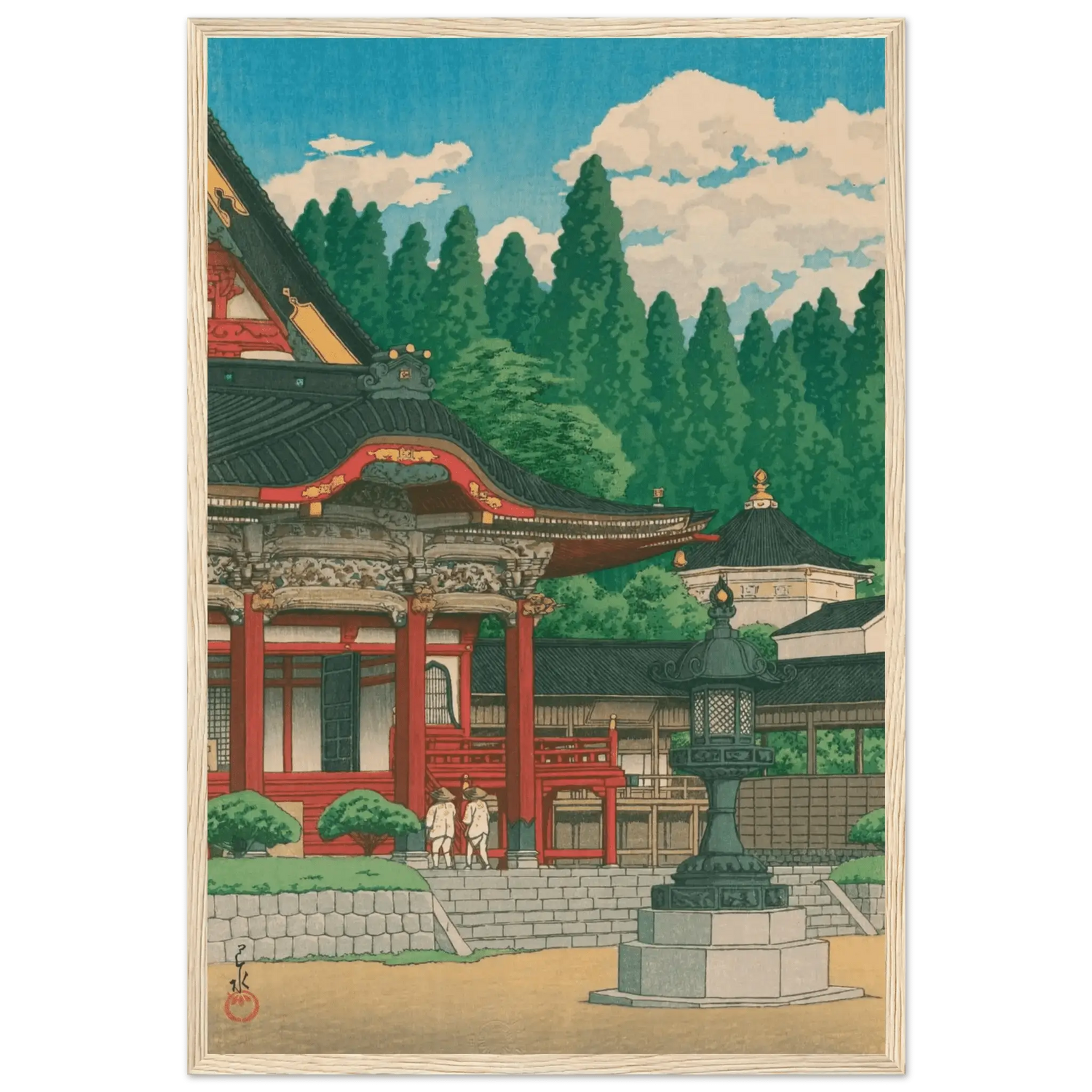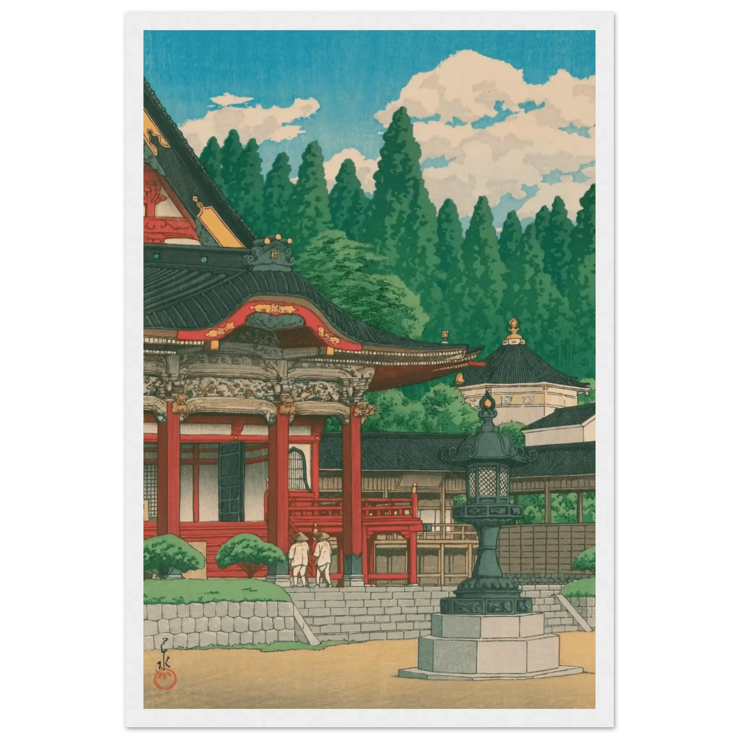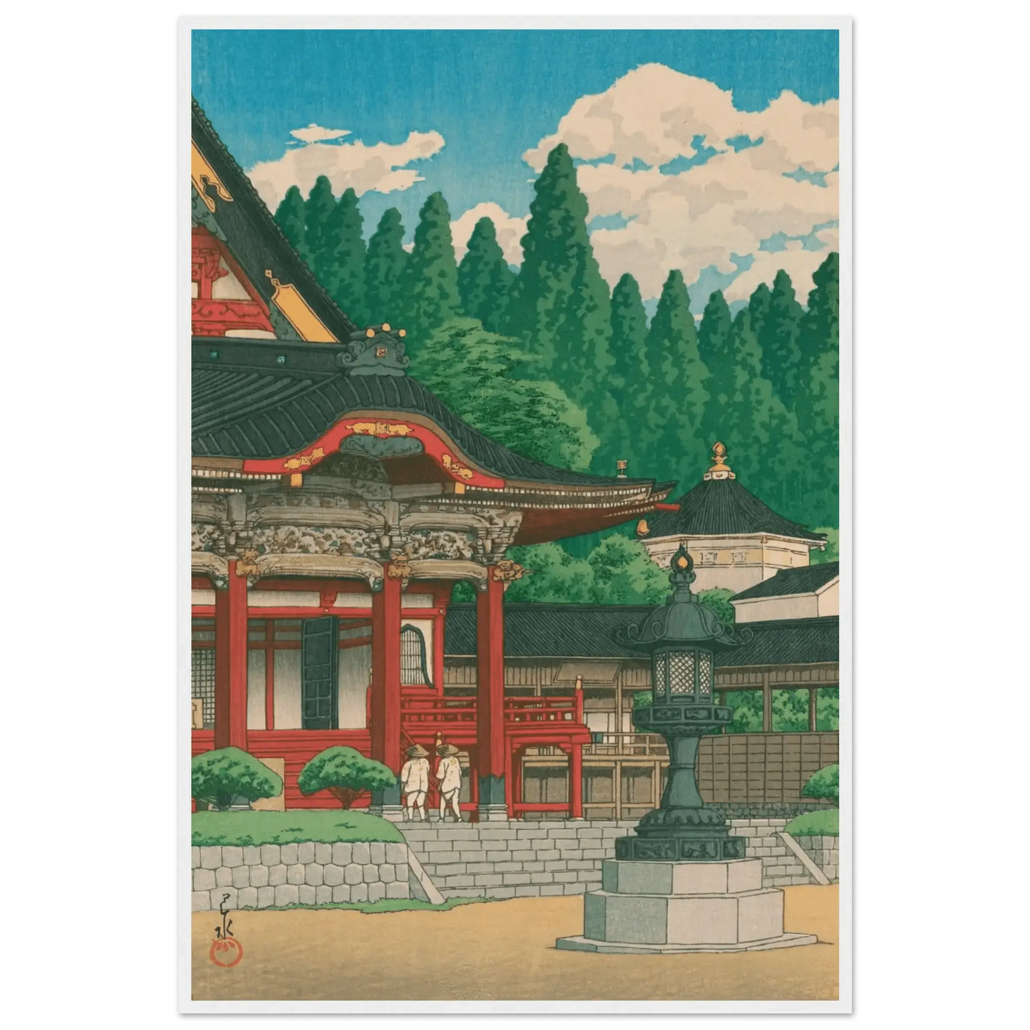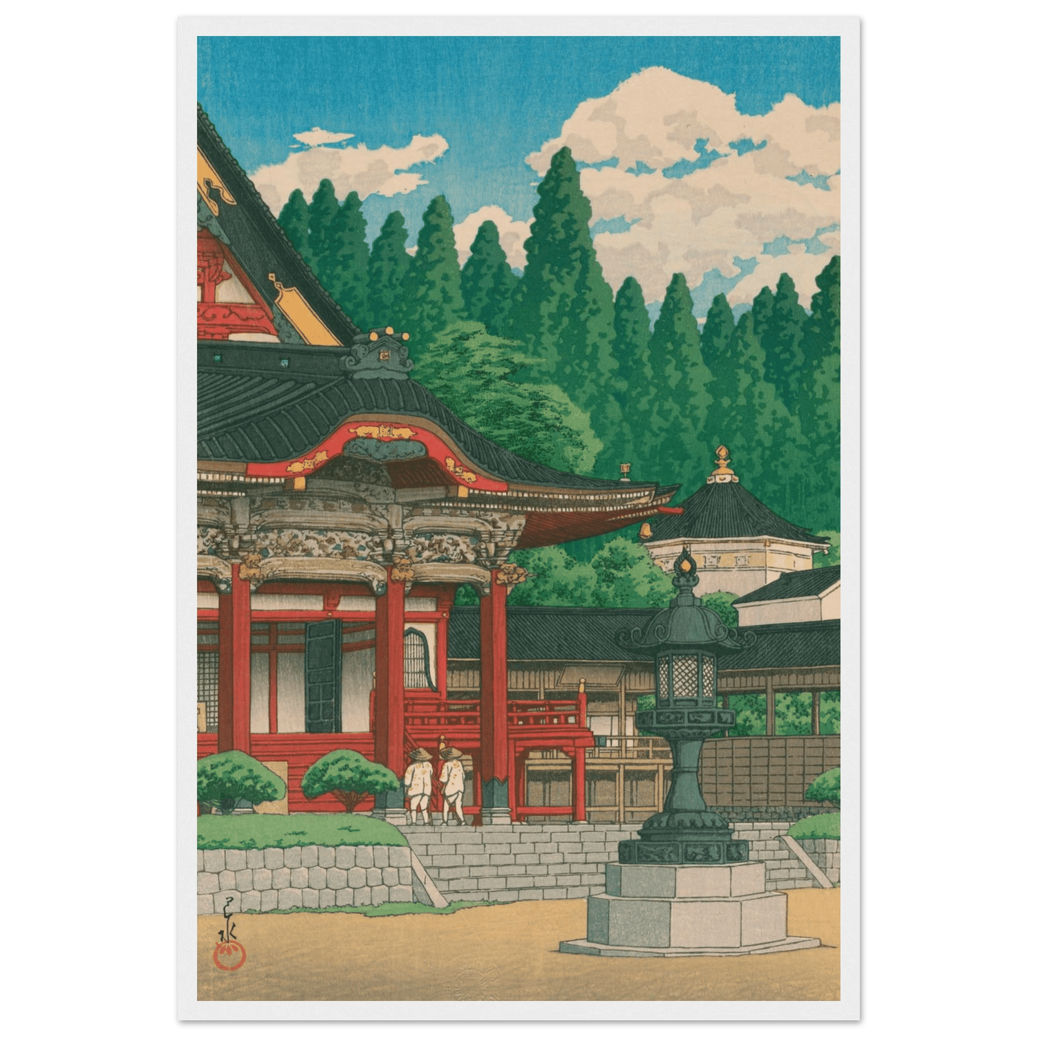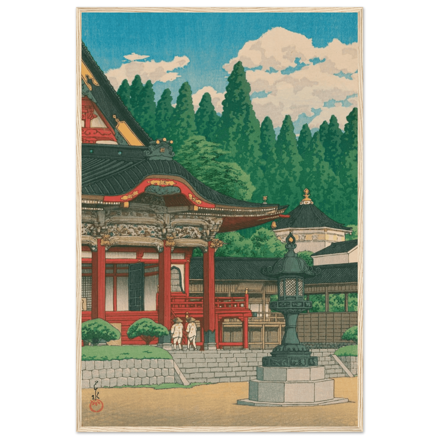 Im klaren Sommerlicht erhebt sich der Kuon-ji-Tempel am Berg Minobu in leuchtendem Rot und Gold. Zwei Pilger nähern sich ehrfürchtig den Stufen, während hohe Zedern wie stille Wächter den Hintergrund umrahmen. Kawase Hasui vereint in dieser Komposition die Würde des Tempels mit der friedvollen Pracht der Natur – ein Sinnbild spiritischer Erneuerung und Harmonie.