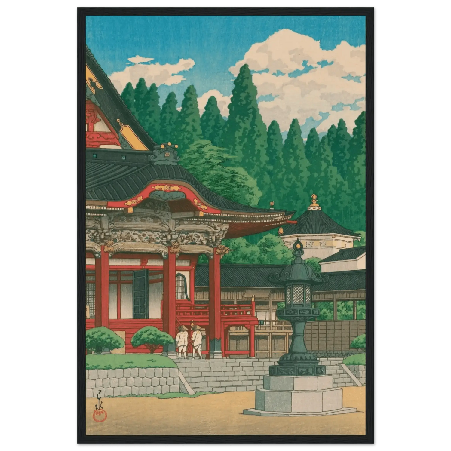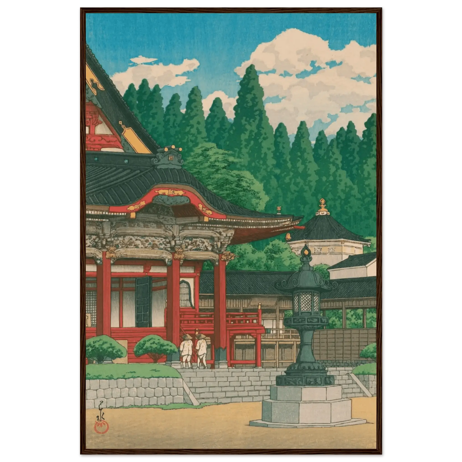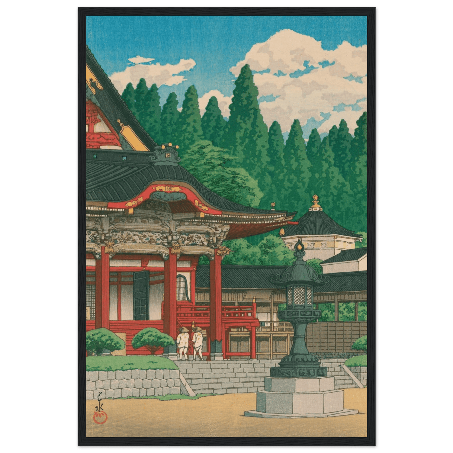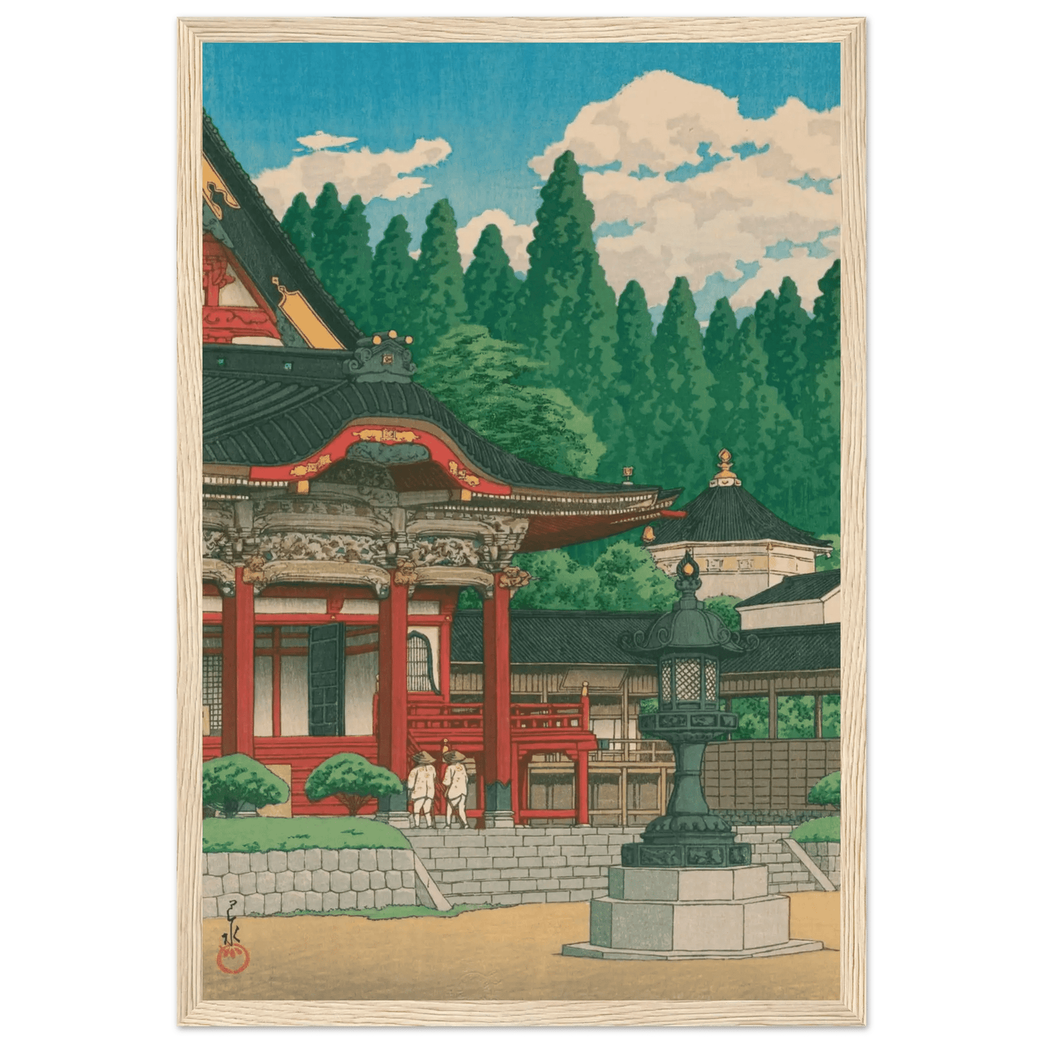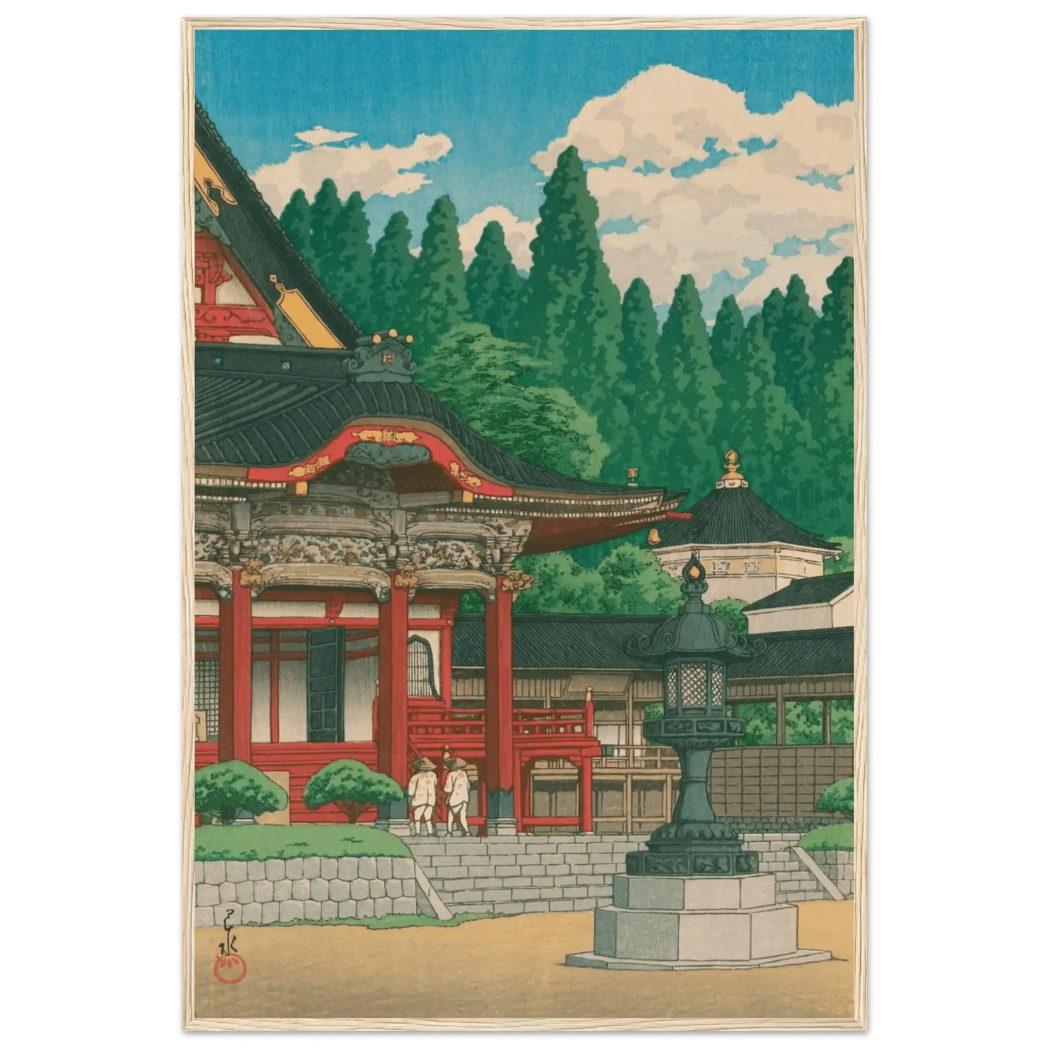 Im klaren Sommerlicht erhebt sich der Kuon-ji-Tempel am Berg Minobu in leuchtendem Rot und Gold. Zwei Pilger nähern sich ehrfürchtig den Stufen, während hohe Zedern wie stille Wächter den Hintergrund umrahmen. Kawase Hasui vereint in dieser Komposition die Würde des Tempels mit der friedvollen Pracht der Natur – ein Sinnbild spiritischer Erneuerung und Harmonie.
