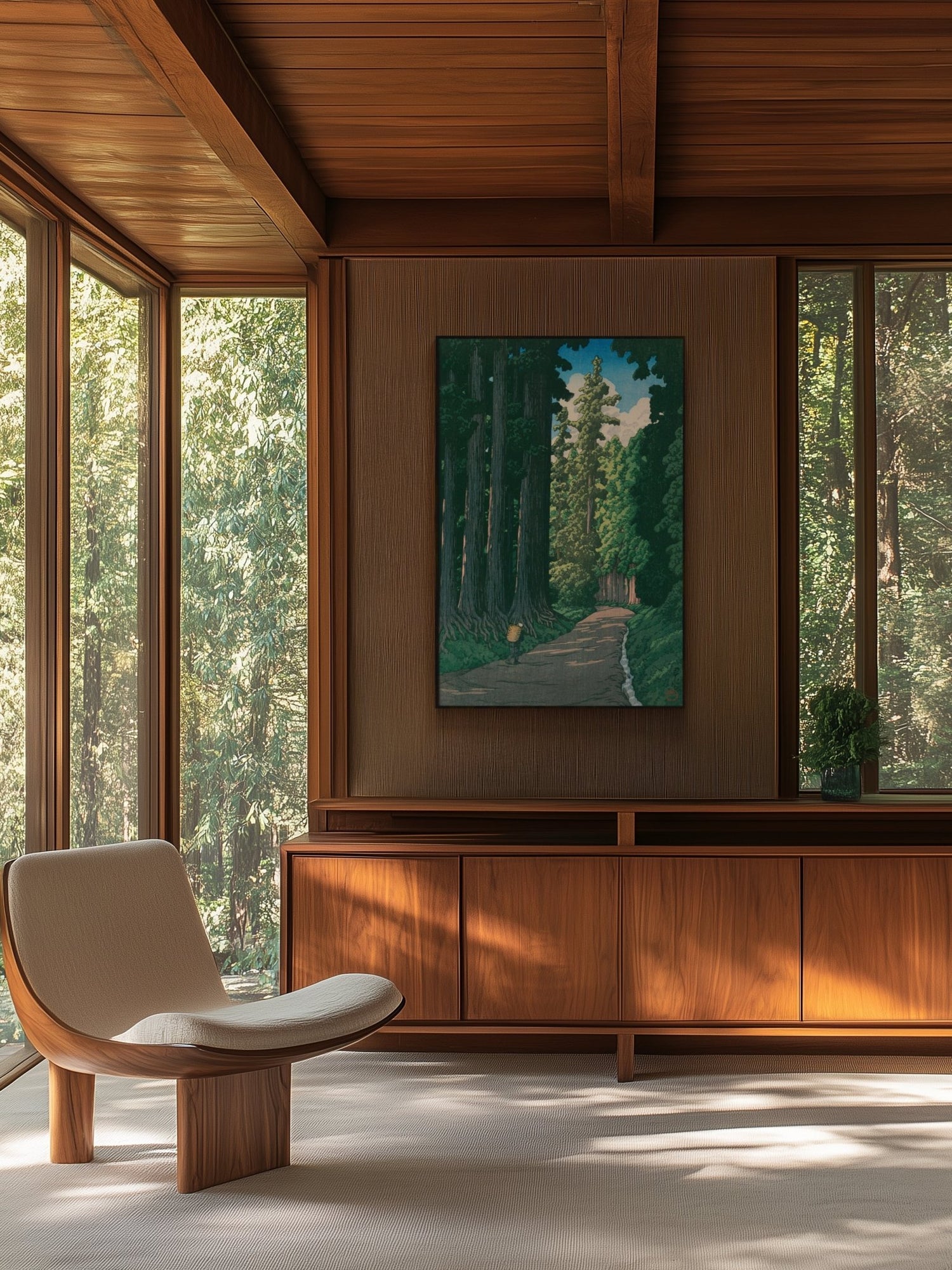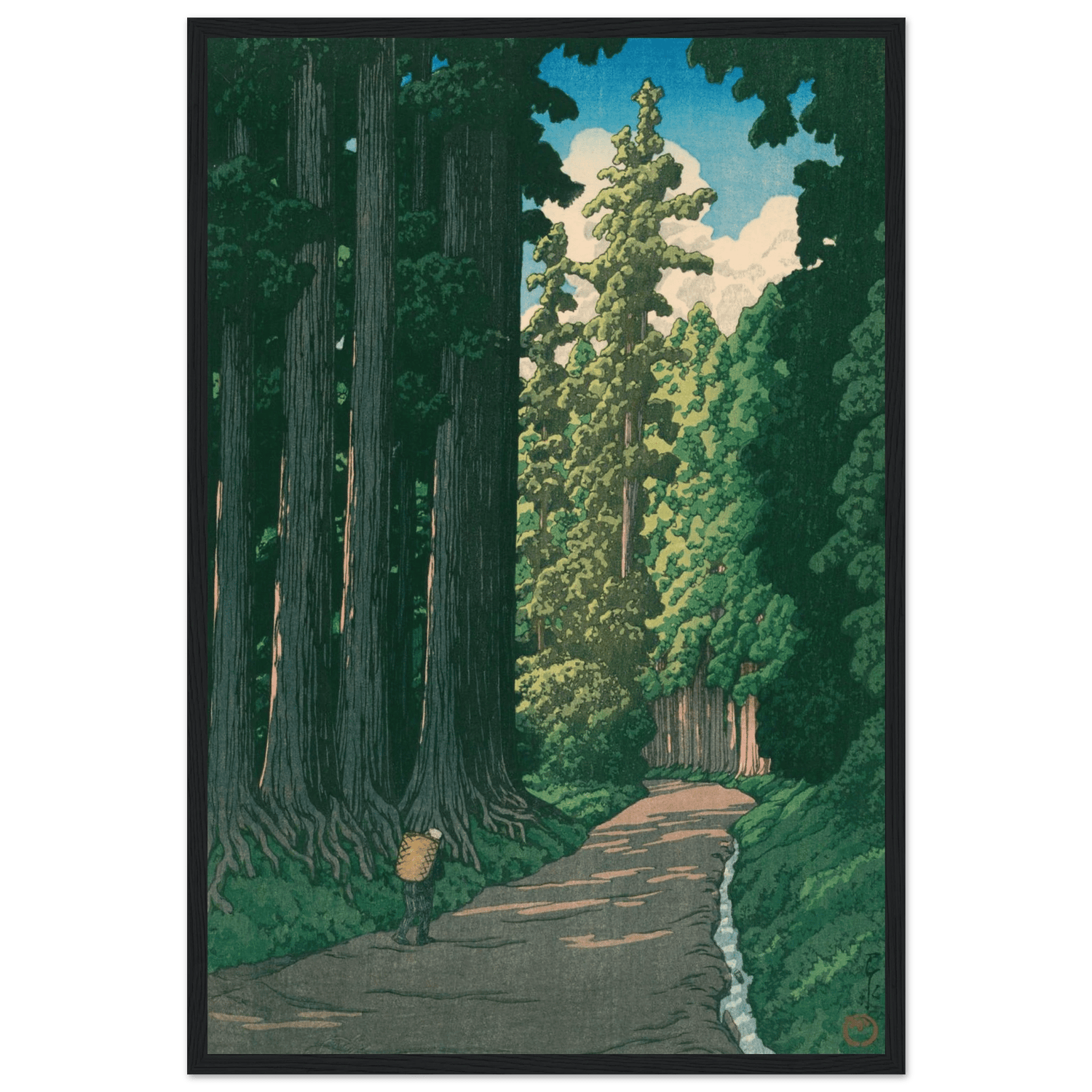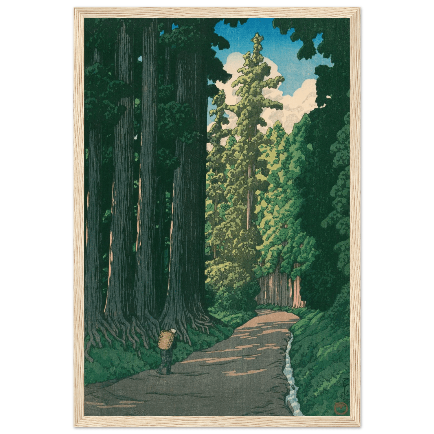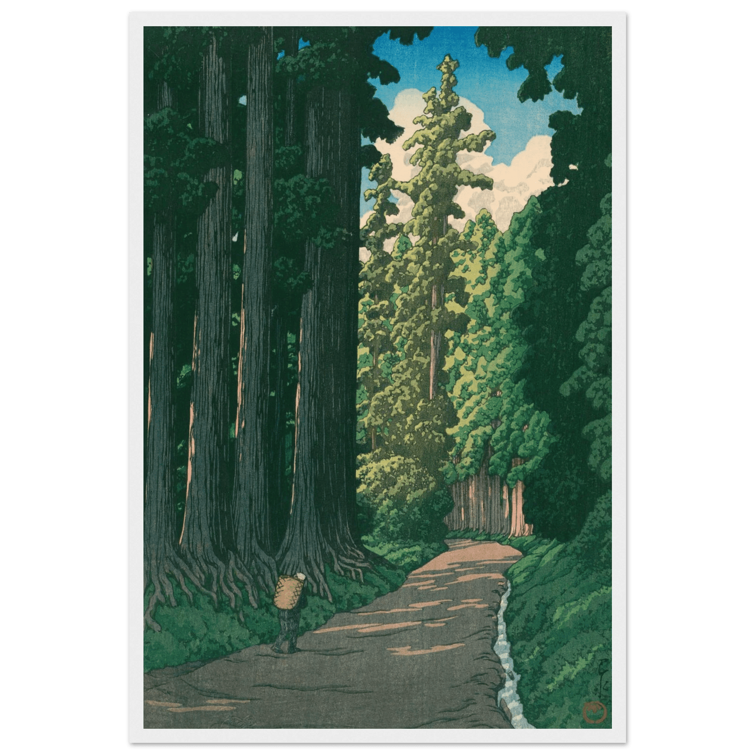 Ein einsamer Wanderer bewegt sich auf einem alten Pfad, der von mächtigen Zedern gesäumt ist. Das Licht des Sommers fällt in schmalen Streifen durch das dichte Blätterdach und beleuchtet die ferne Wegbiegung. Kawase Hasui fängt die feierliche Ruhe dieser uralten Straße ein – ein Ort, an dem Geschichte, Natur und Stille miteinander verschmelzen.