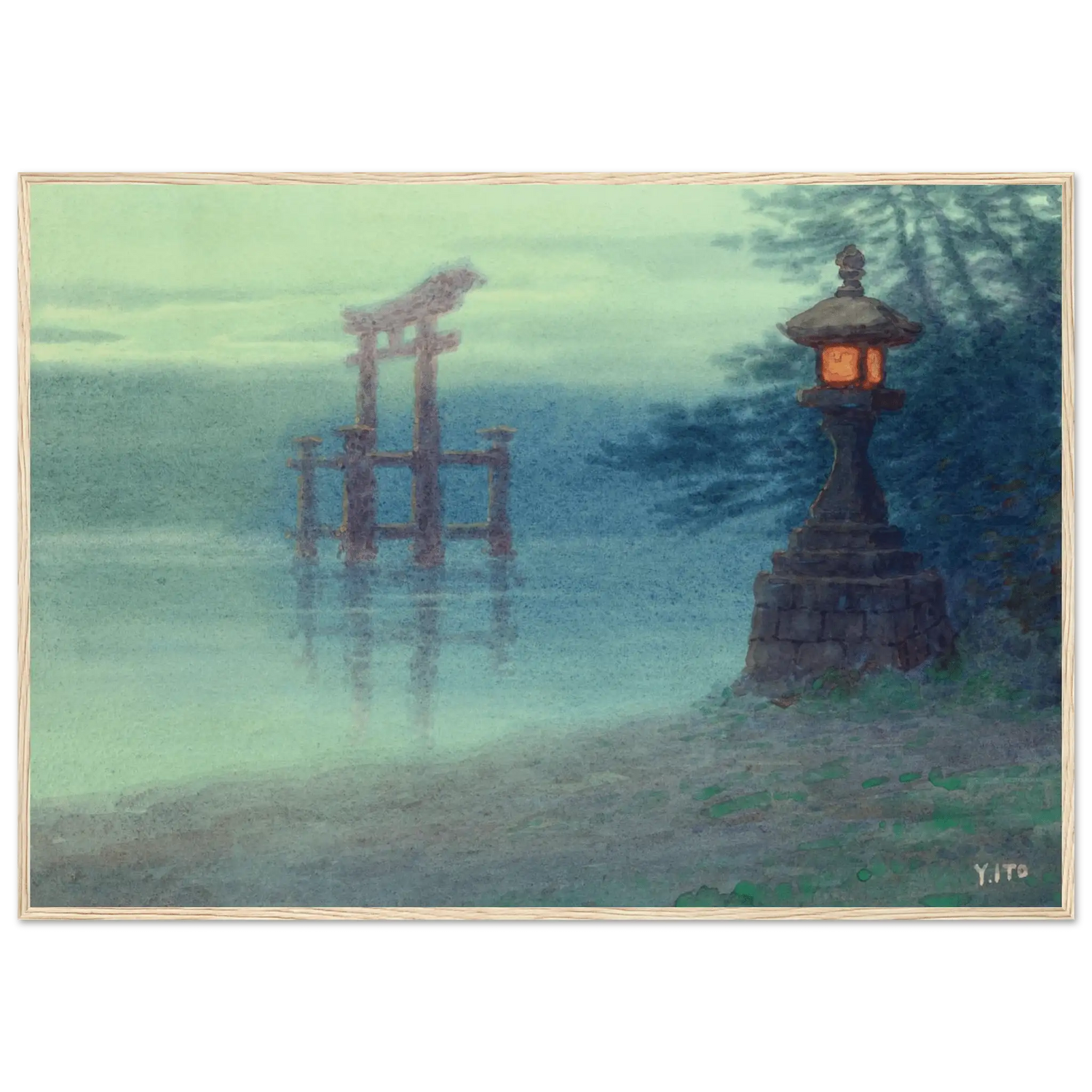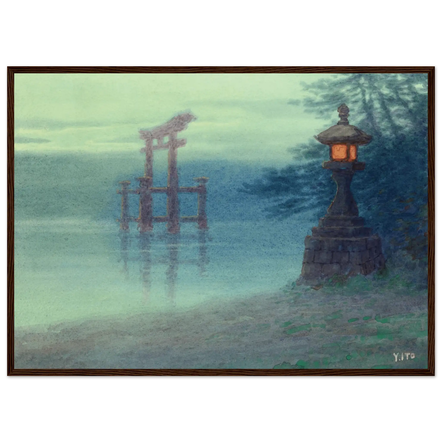 Ein rotes Torii erhebt sich aus dem stillen Wasser, halb verhüllt vom Morgendunst. Am Ufer leuchtet eine Steinlaterne – ihr warmes Licht bricht sanft durch das Blau der Dämmerung. Zwischen Nebel, Wasser und Stille entsteht eine Atmosphäre von Frieden und spiritueller Tiefe.