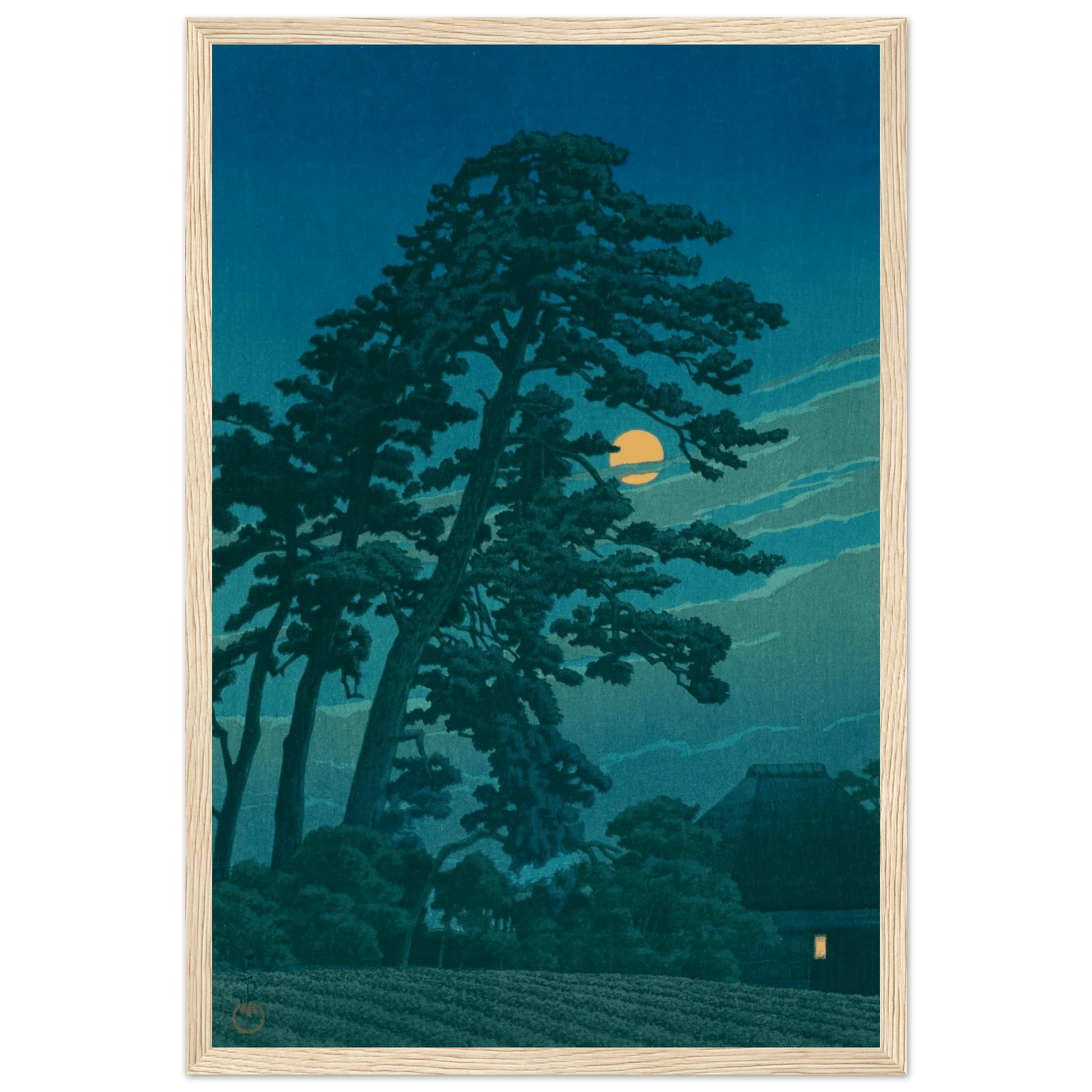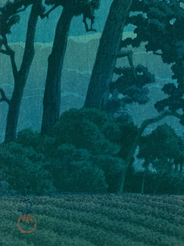 Dieses Werk gehört zu Hasuis eindrucksvollsten Nachtlandschaften – eine lyrische Komposition, in der Licht, Stille und Natur zu einer einzigen, kontemplativen Empfindung verschmelzen.