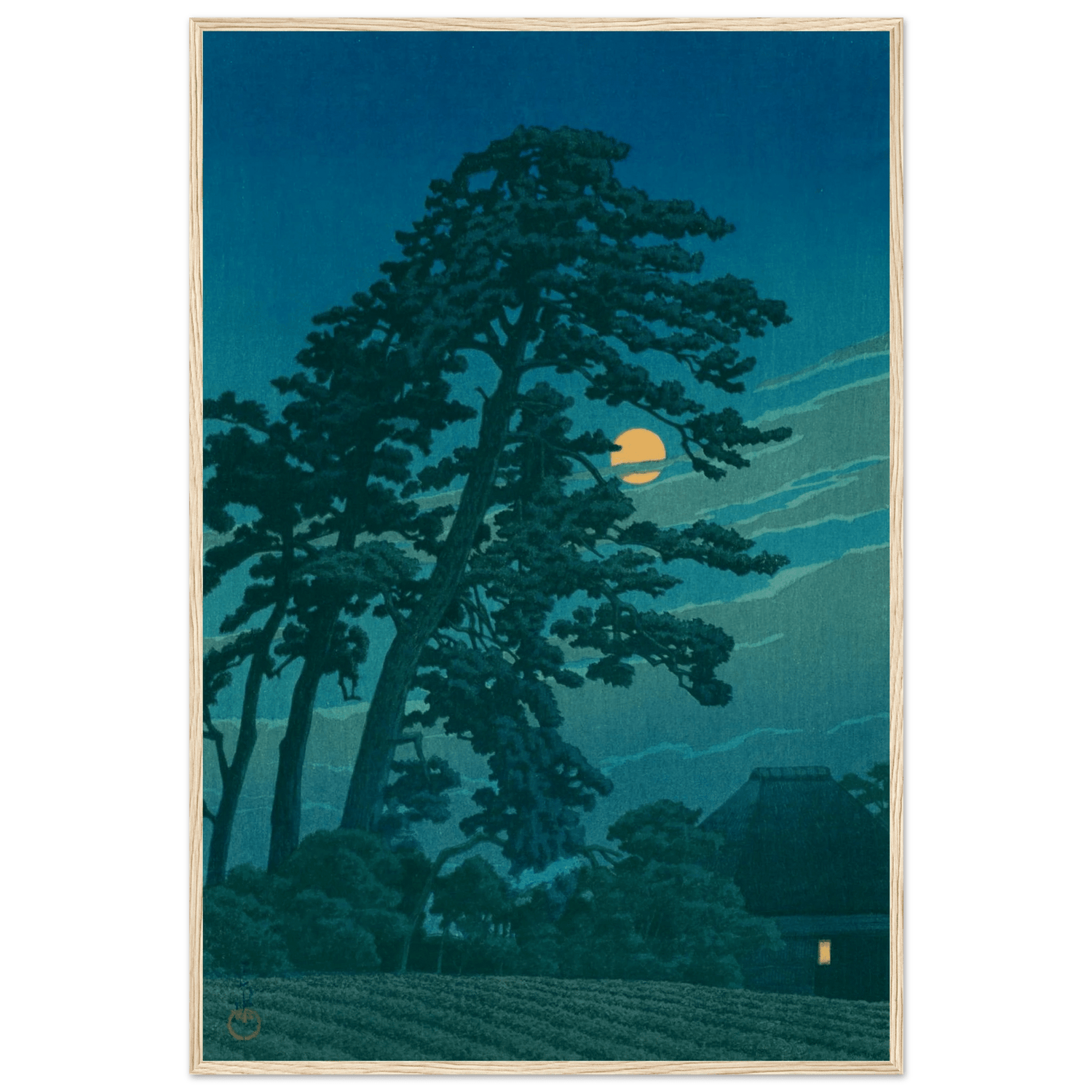 Ein goldener Mond steigt hinter hohen Kiefern empor, deren Schatten sich über die Felder legen. Nur ein fernes Licht in einer Strohhütte zeugt von menschlicher Gegenwart in dieser stillen, nächtlichen Welt. Kawase Hasui fängt die poetische Ruhe des Mondlichts ein – eine Meditation über Einsamkeit, Natur und die leise Schönheit der Nacht.