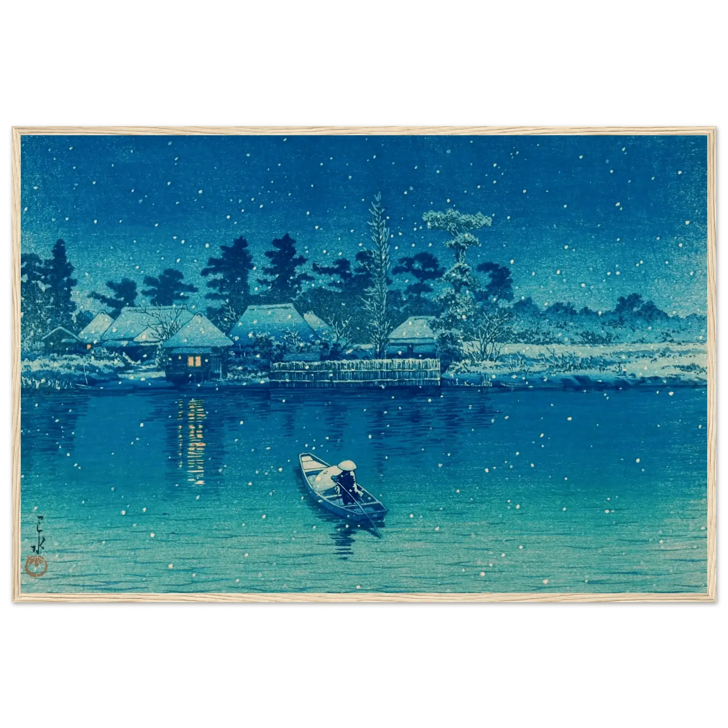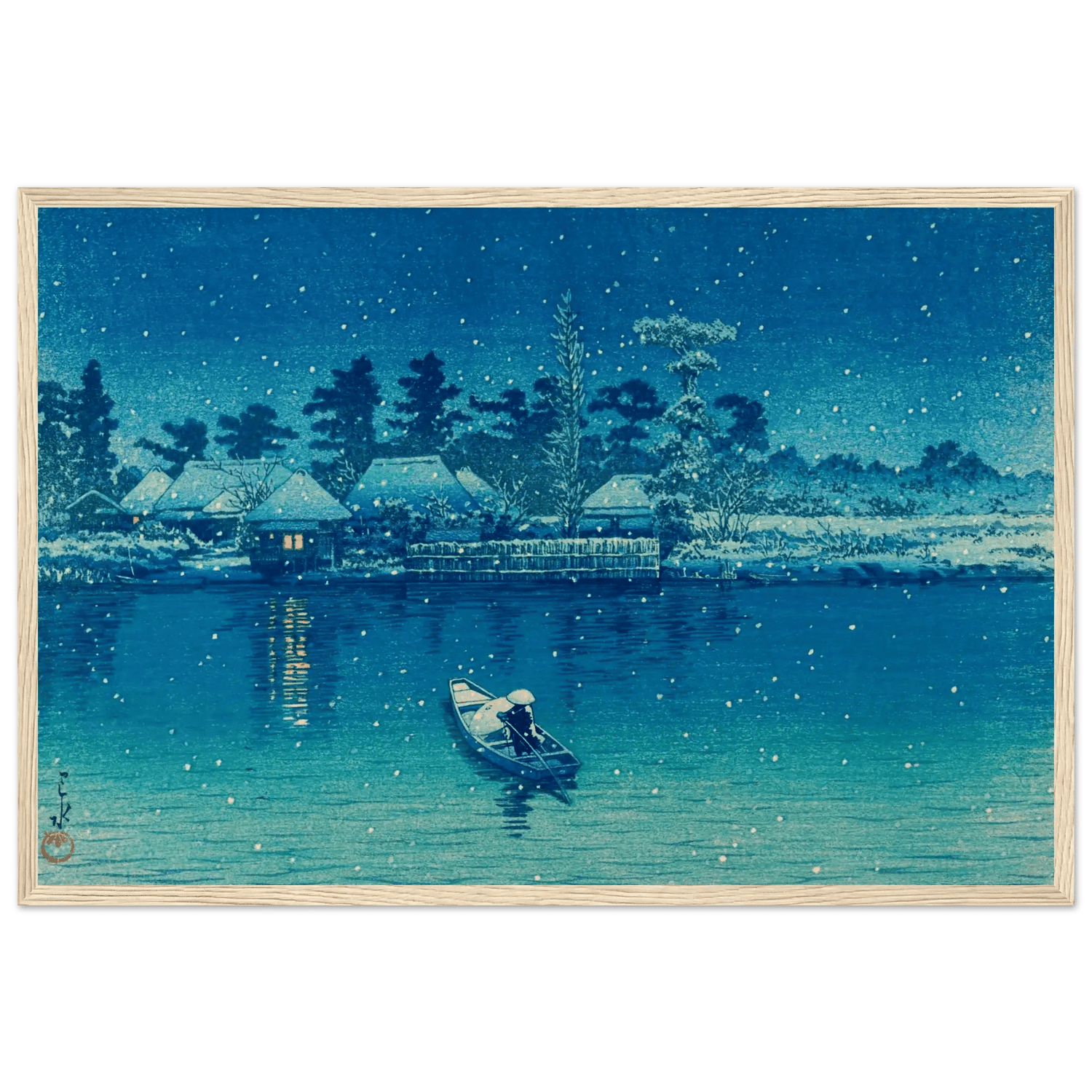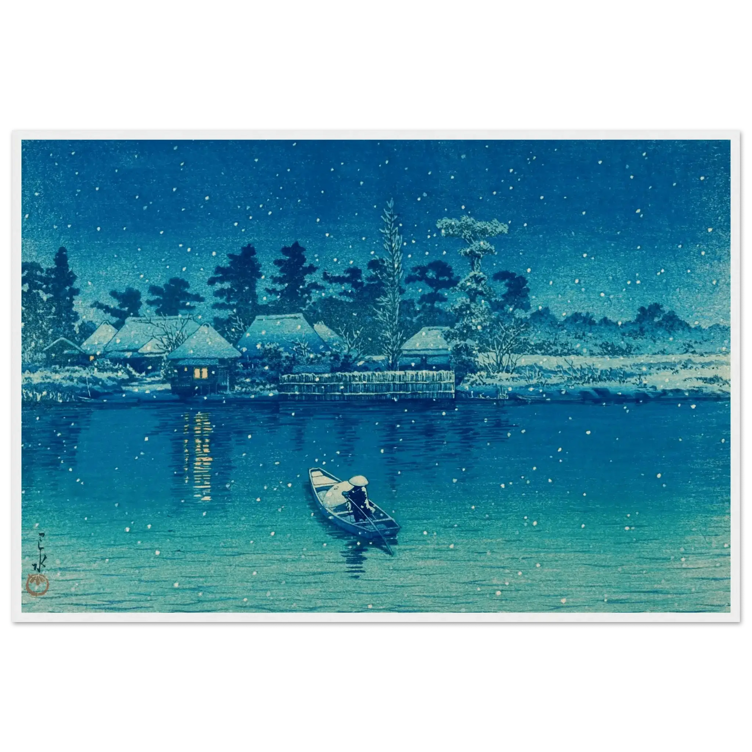 Leise fällt der Schnee auf das stille Wasser von Ushibori. Ein einsamer Ruderer gleitet durch die winterliche Nacht, während das Licht der Häuser am Ufer wie kleine Sterne im Dunkel glimmt. Kawase Hasui verwandelt diese Szenerie in ein stilles Gedicht aus Blau und Weiß – ein Moment voll Frieden, Einsamkeit und zeitloser Schönheit.