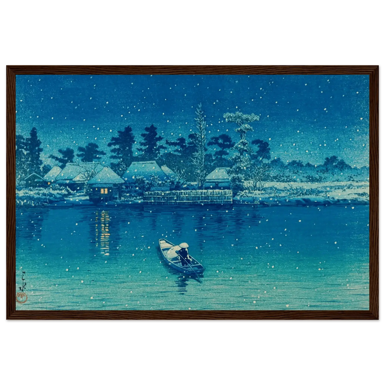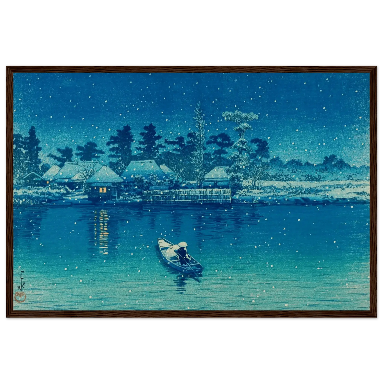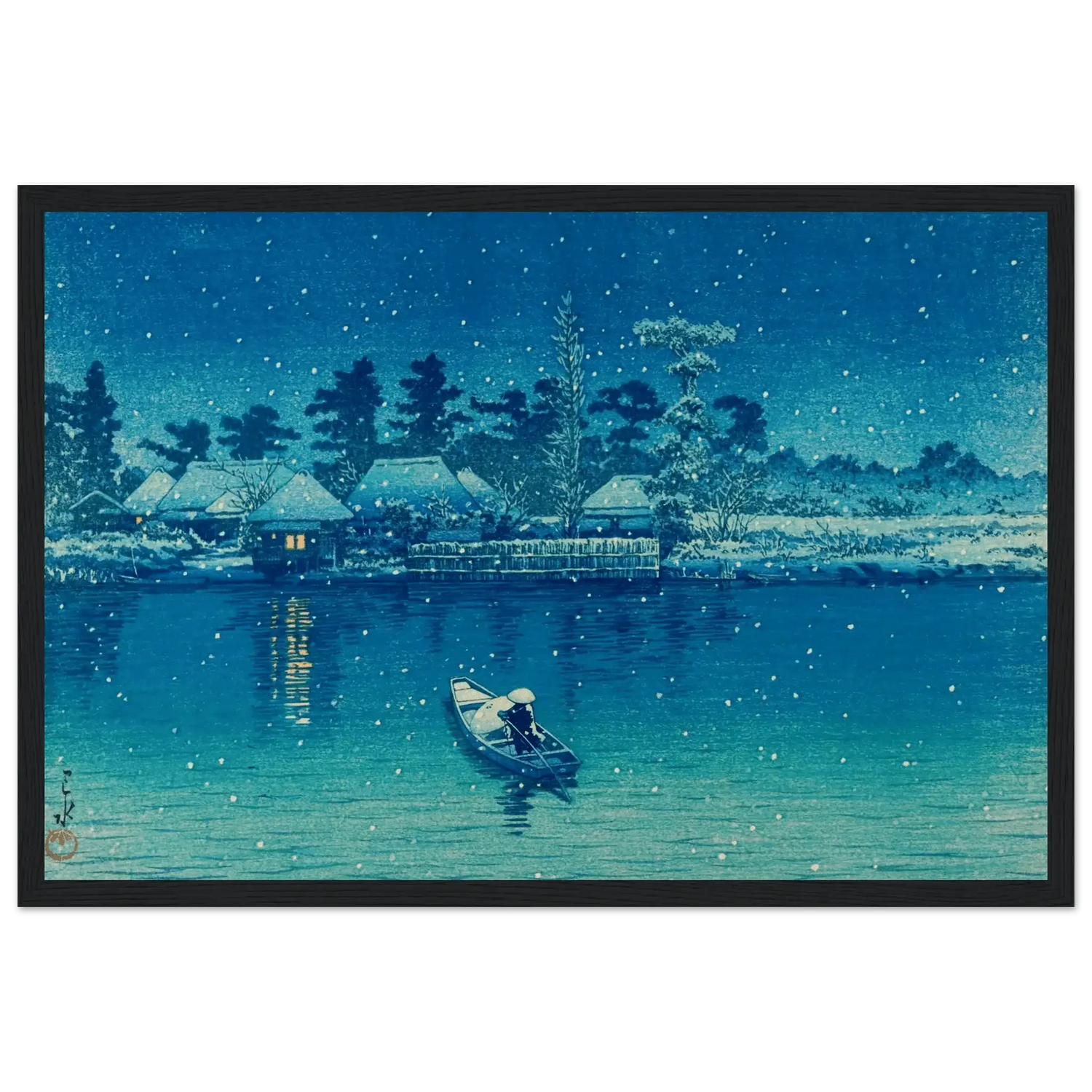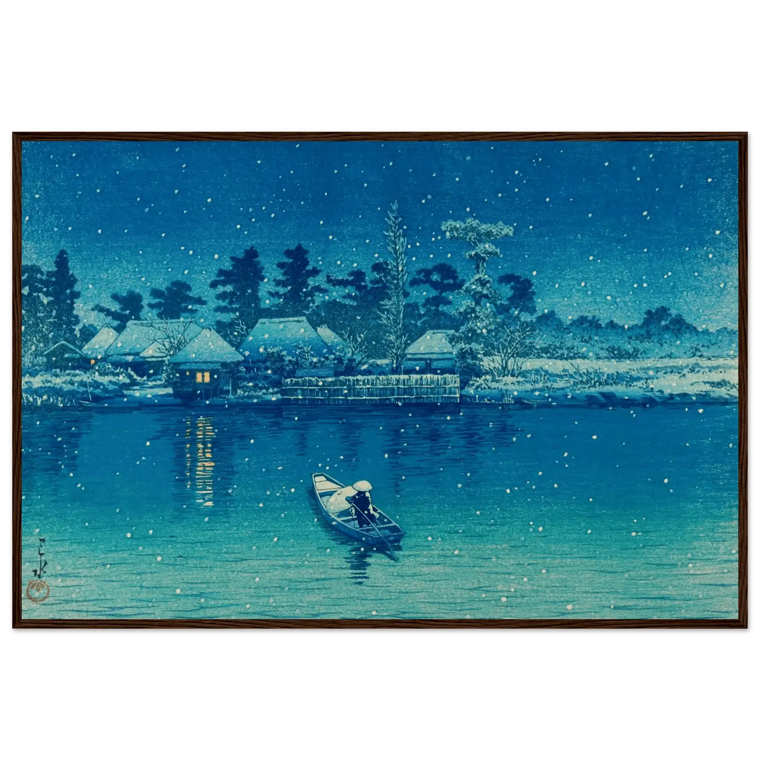 Leise fällt der Schnee auf das stille Wasser von Ushibori. Ein einsamer Ruderer gleitet durch die winterliche Nacht, während das Licht der Häuser am Ufer wie kleine Sterne im Dunkel glimmt. Kawase Hasui verwandelt diese Szenerie in ein stilles Gedicht aus Blau und Weiß – ein Moment voll Frieden, Einsamkeit und zeitloser Schönheit.